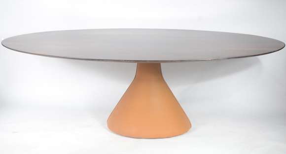 Mesa "Guarujá" feitio oval com tampo "taqueado" que mescla diferentes tonalidades da mesma madeira, base de cimento r...