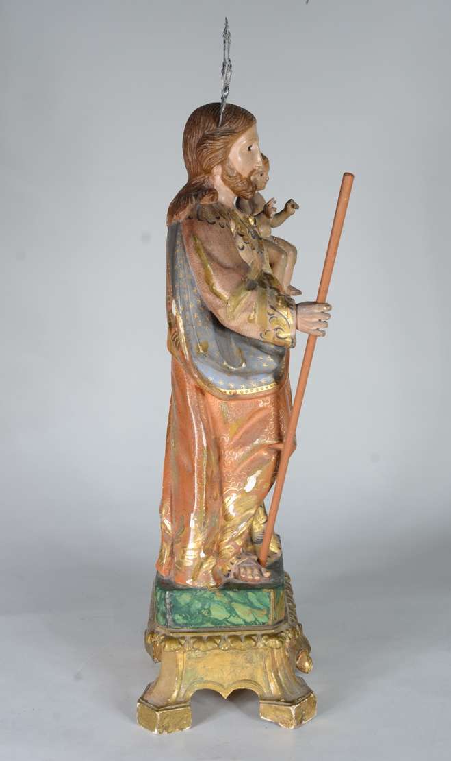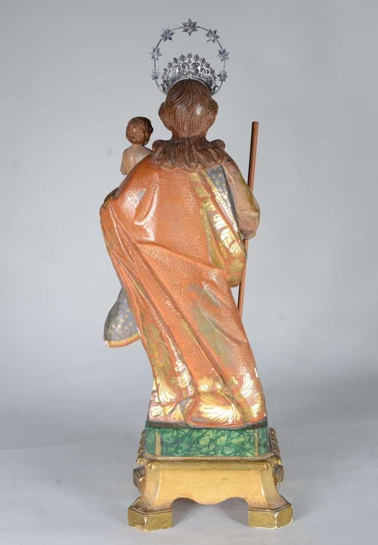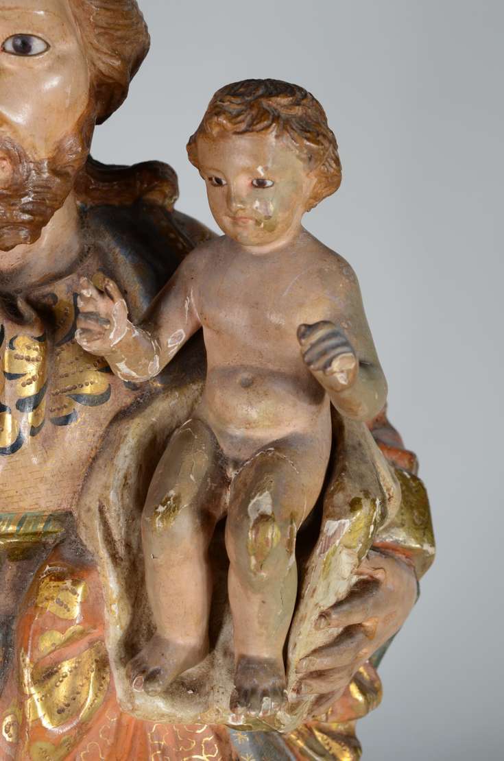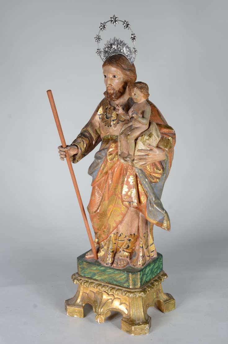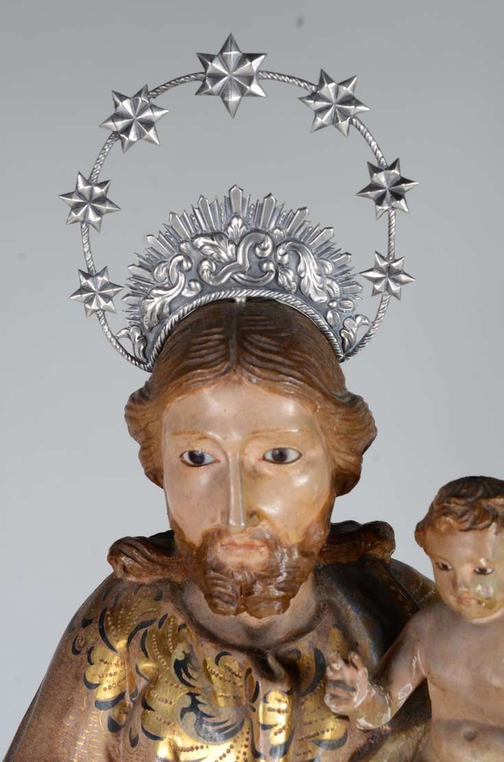 São José - Belíssima Imagem portuguesa de madeira entalhada e policromada, realces dourados, resplendor de prata. Menino com braço e perna colada.