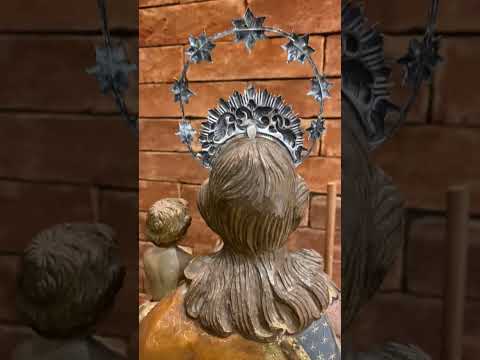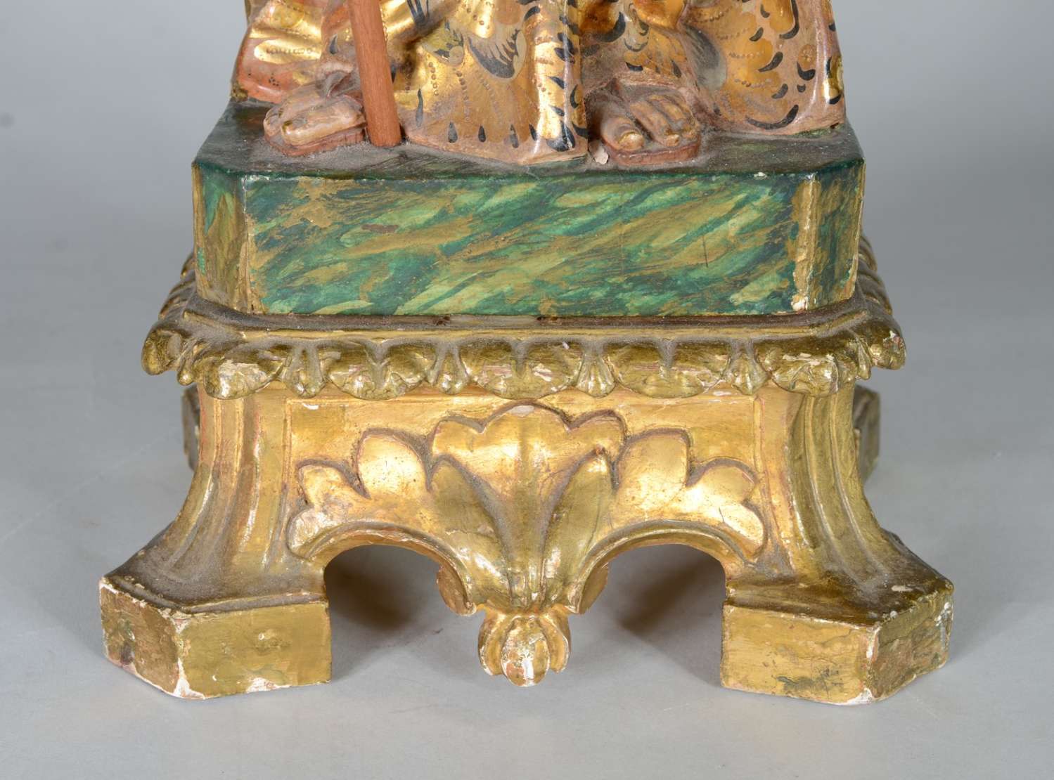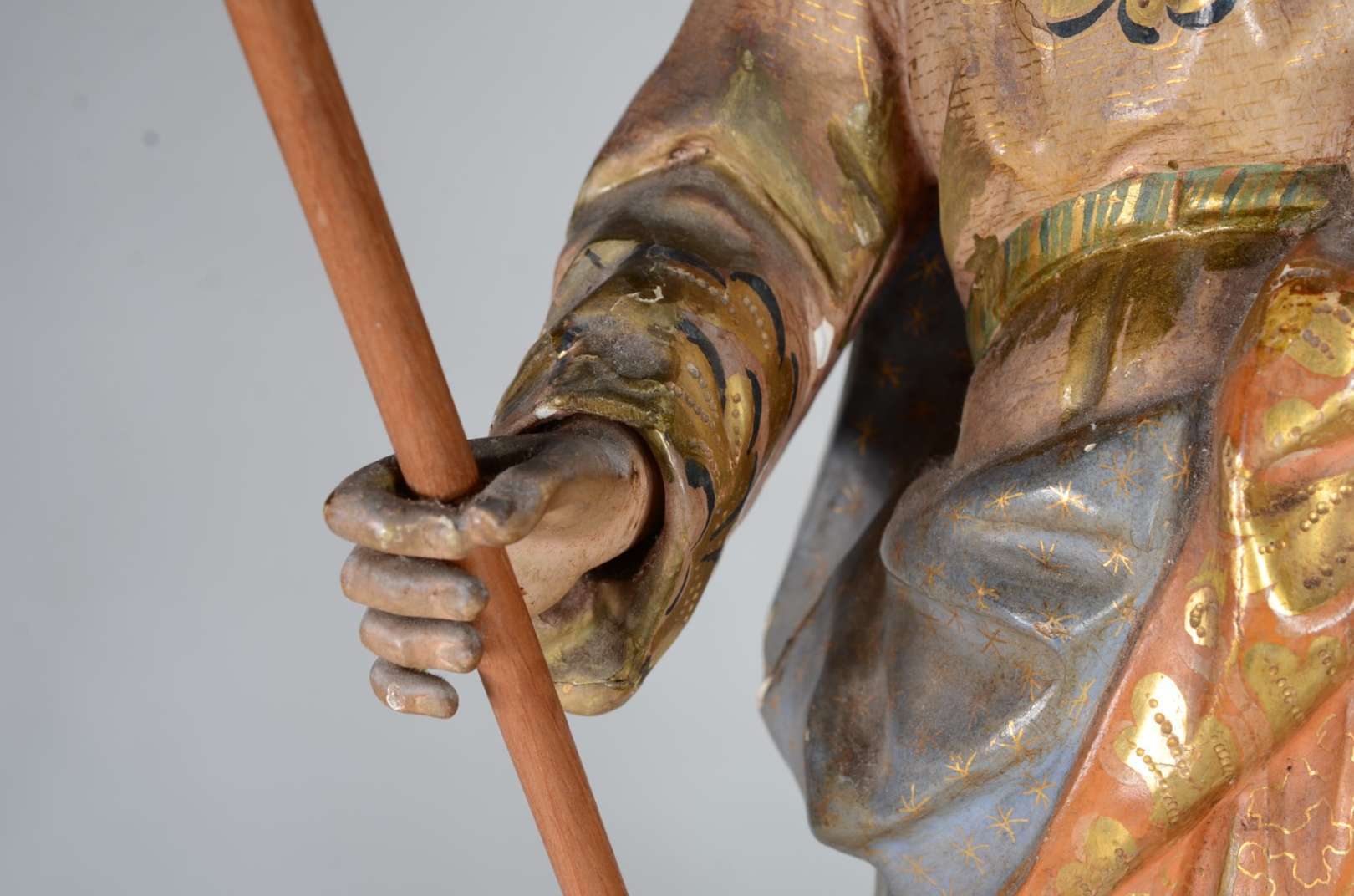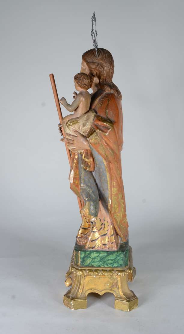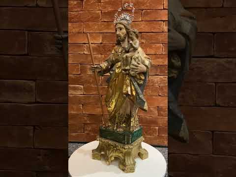 São José - Belíssima Imagem portuguesa de madeira entalhada e policromada, realces dourados, resplendor de prata. Menino com braço e perna colada.