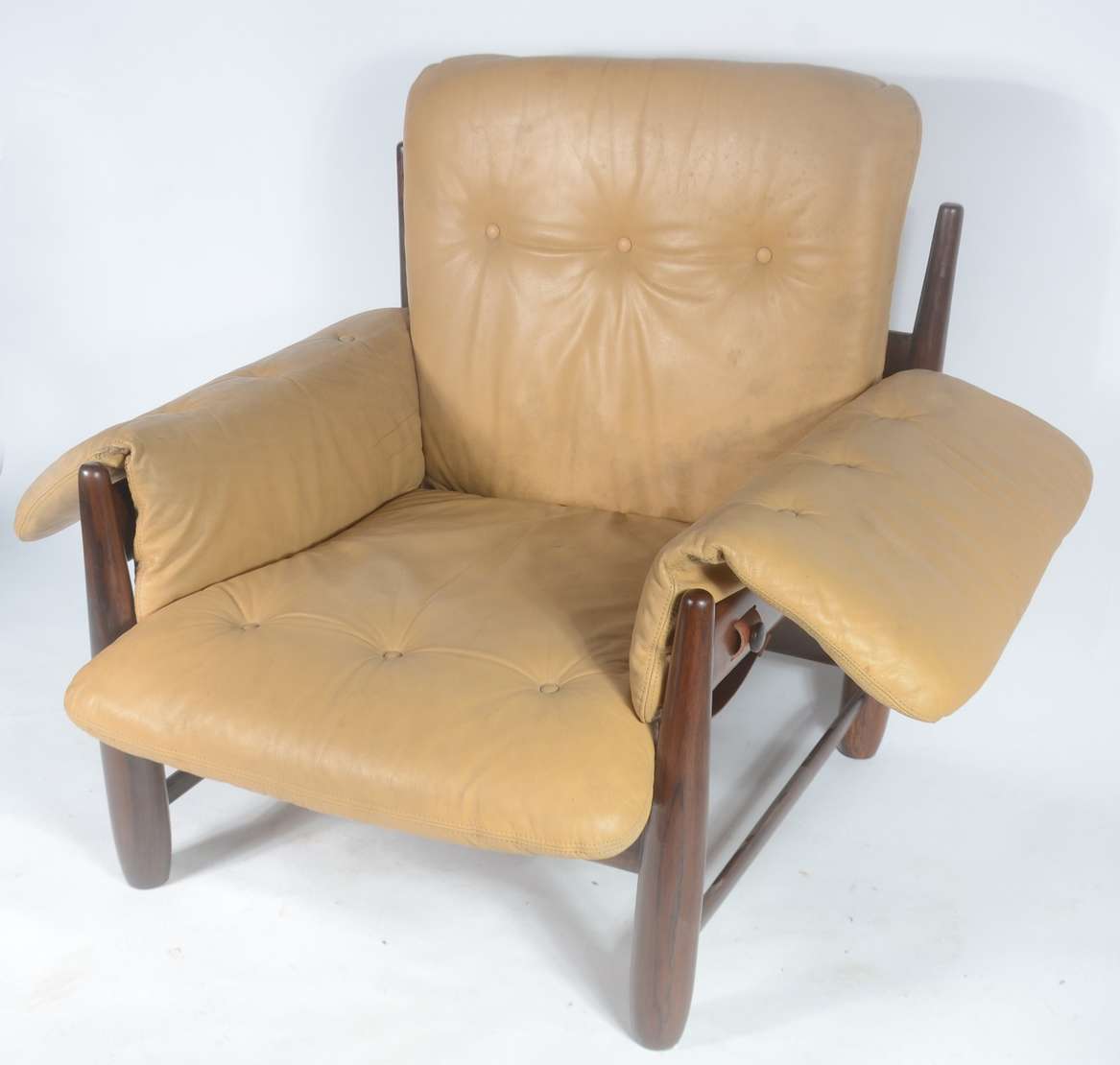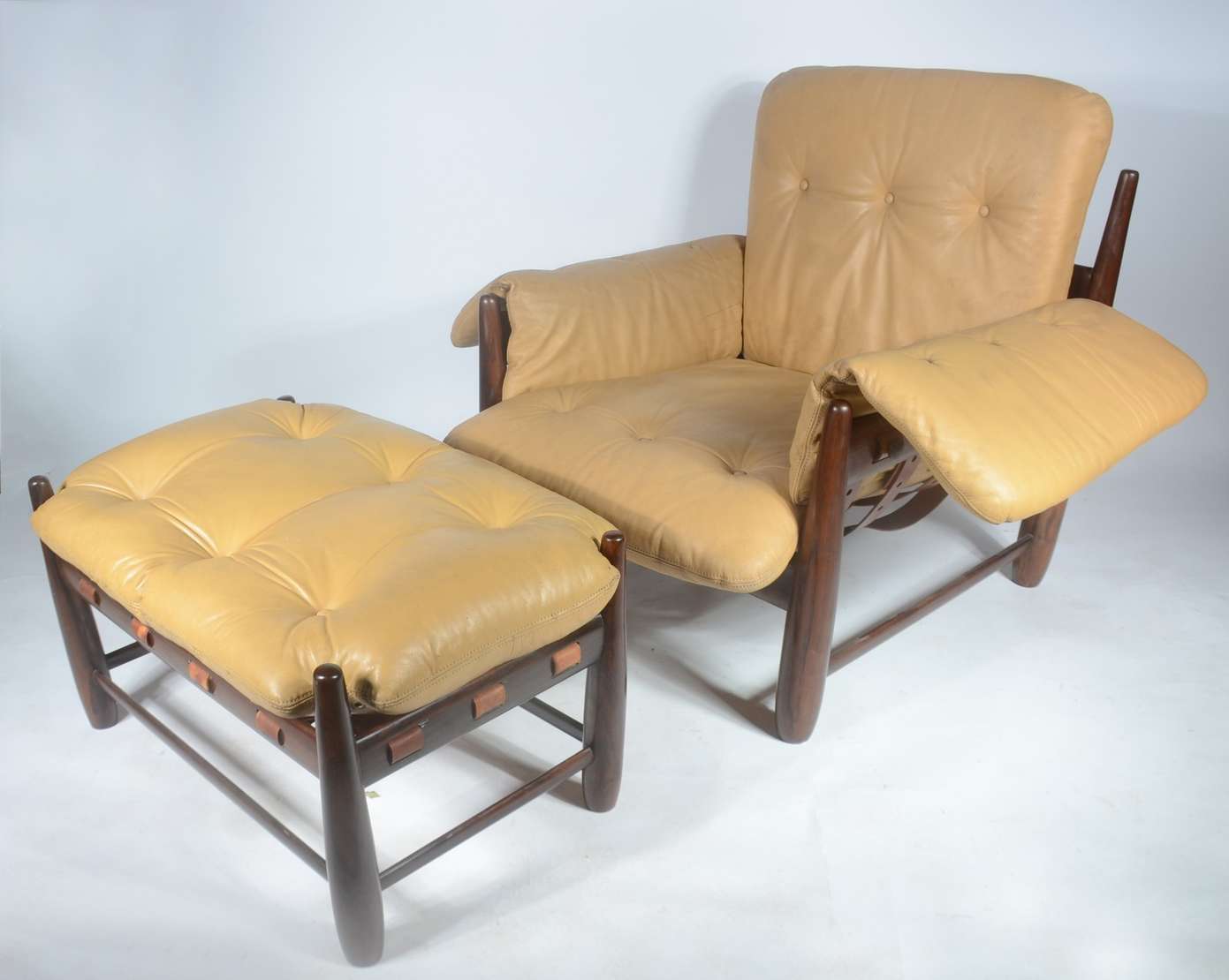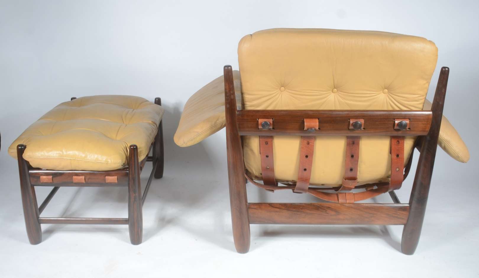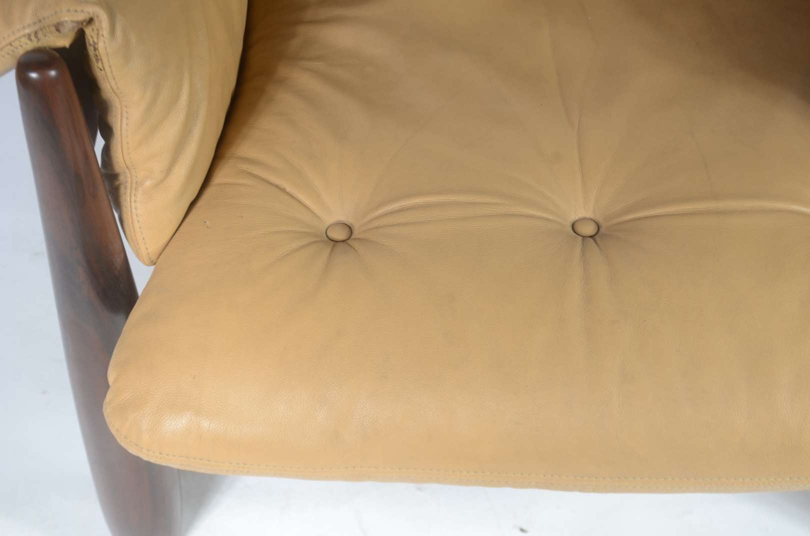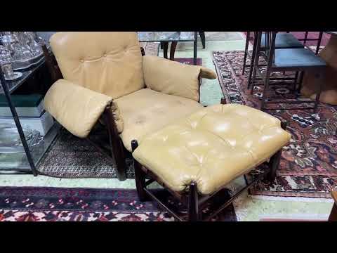 Par de cadeiras baixas de madeira nobre, estofadas e forradas em tecido adamascado com tacheados.