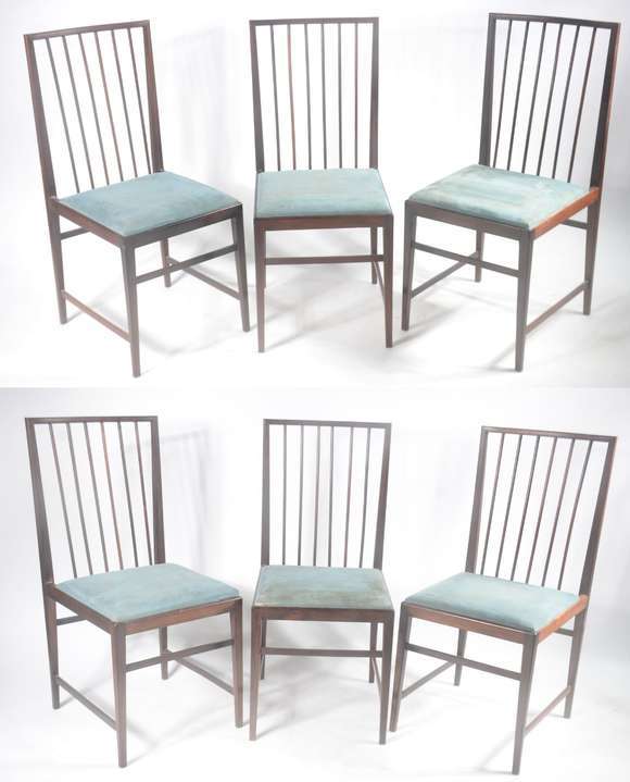 Conjunto com 6 cadeiras de jacarandá, assentos estofados e forrados em tecido azul, encostos com hastes cilíndricas. ...