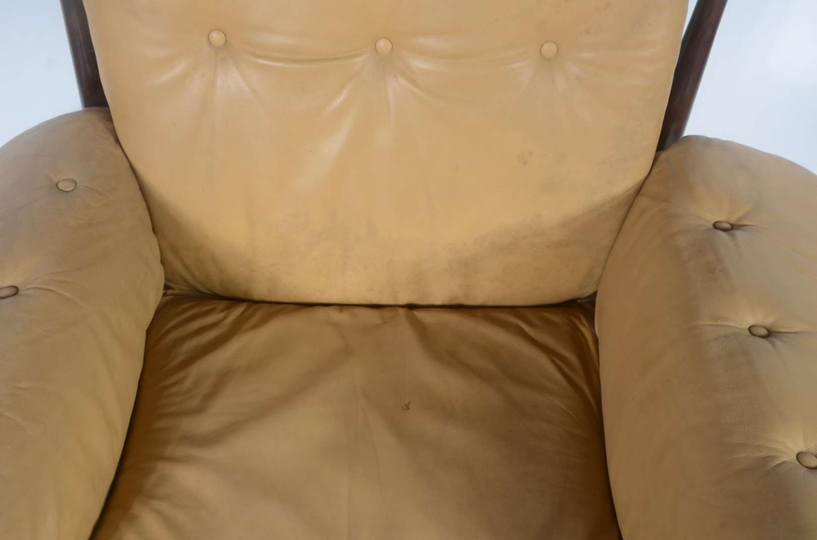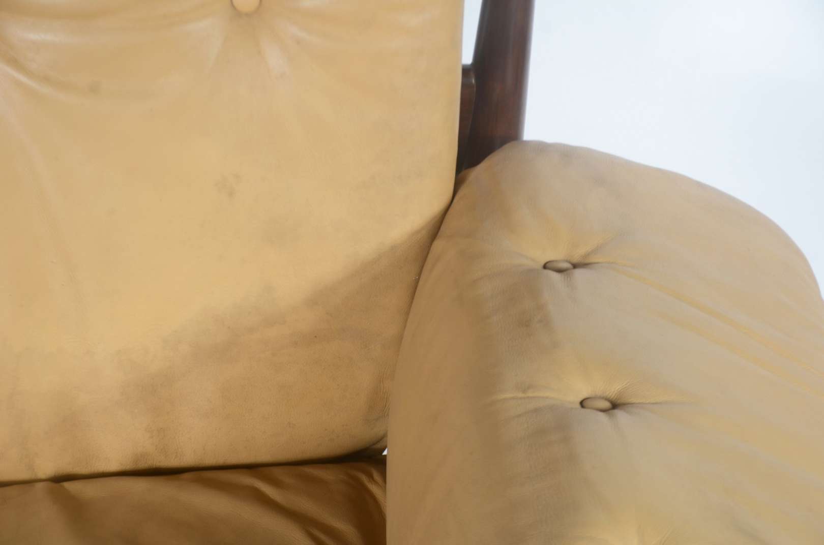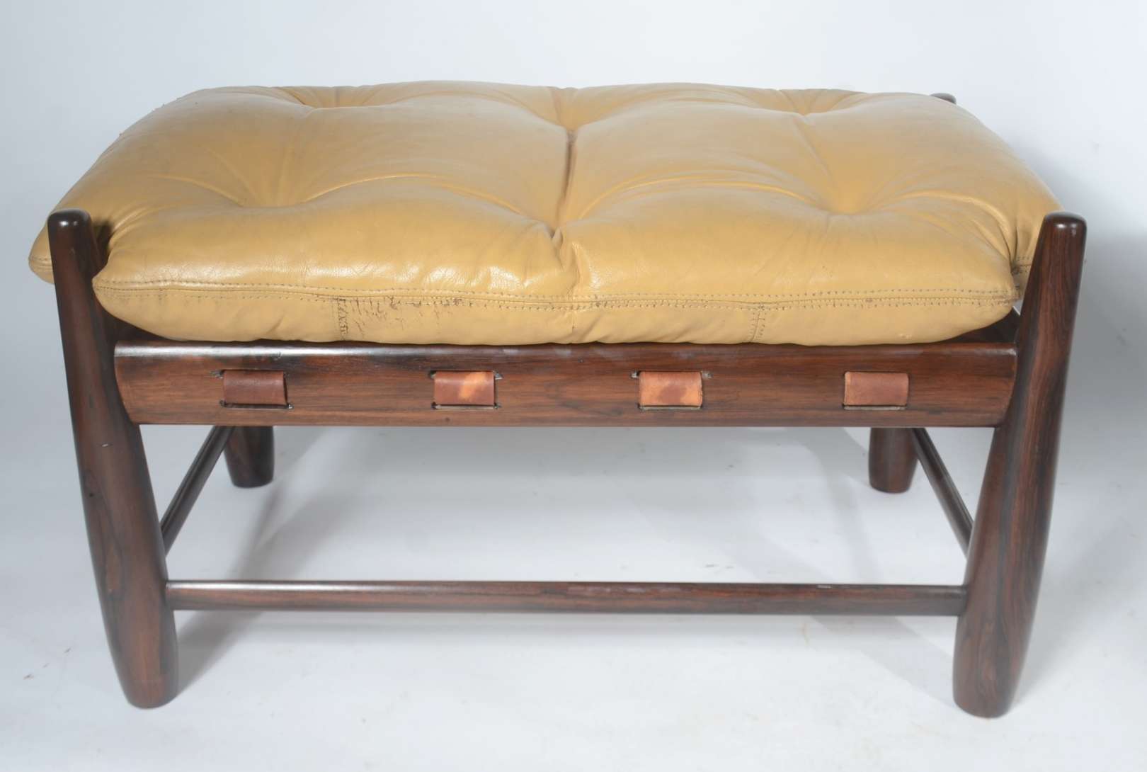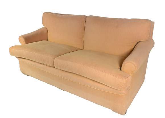 Sofá estofado e forrado em tecido na cor mostarda, dito "queixo mole". Desgastes.
