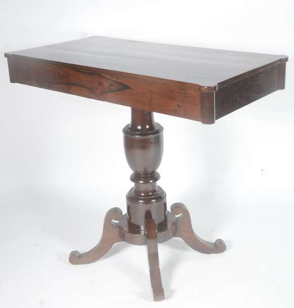 Mesa de madeira nobre, tampo retangular apoiado em base torneada.