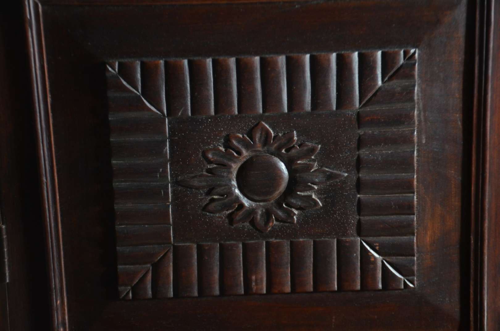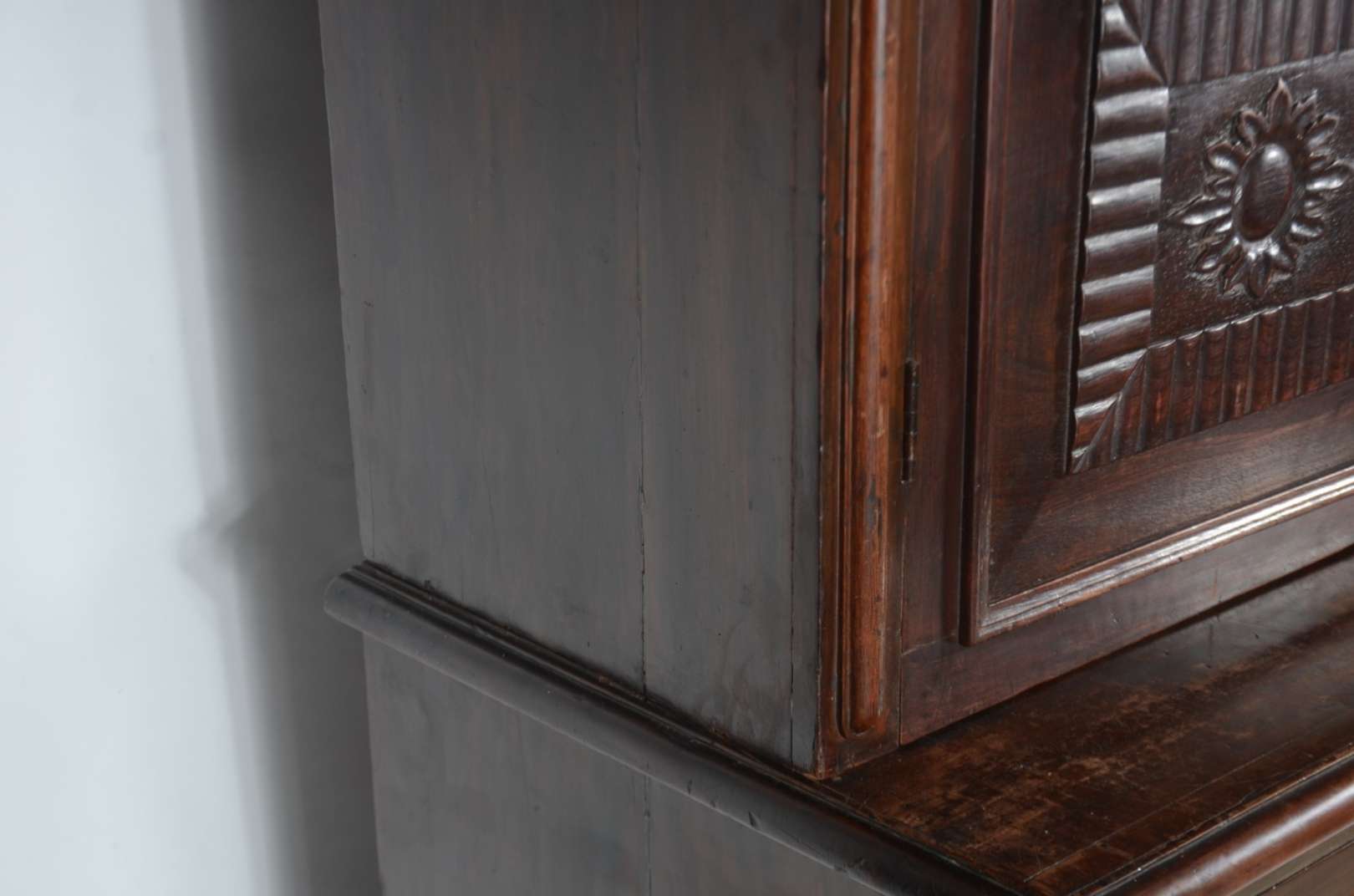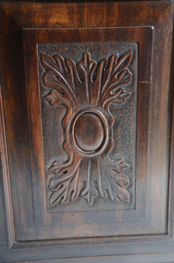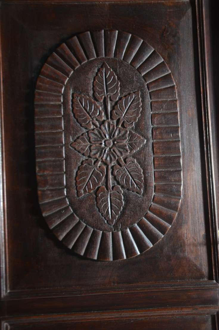 Grande móvel/oratório ou louceiro de madeira nobre, duas portas na parte superior e duas na parte inferior com entalhes, prateleiras internas.
