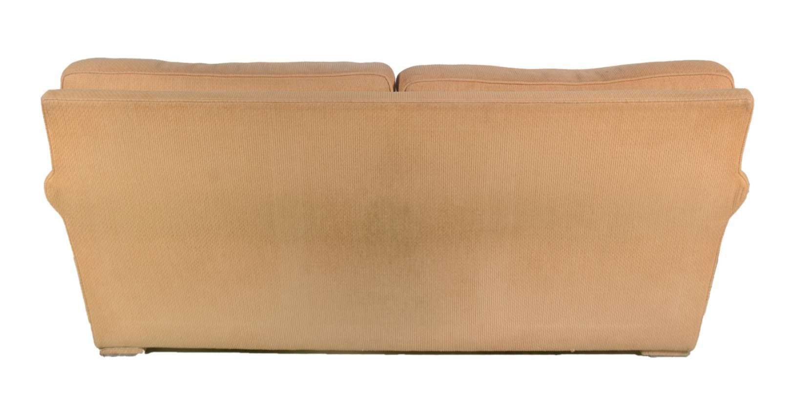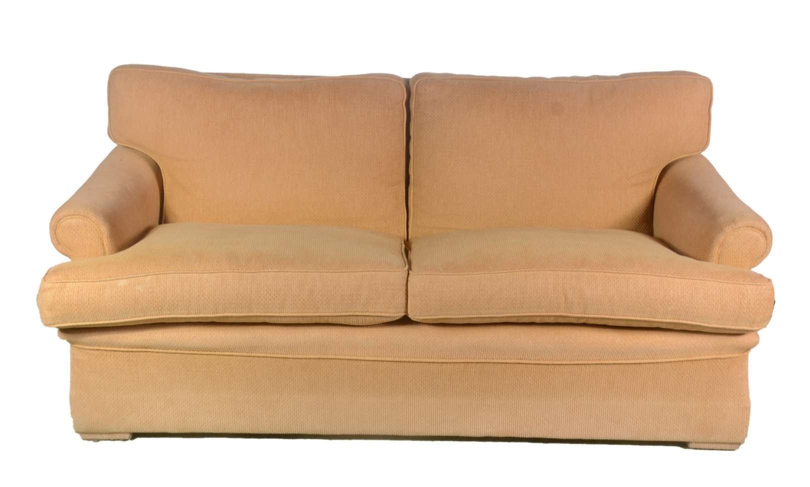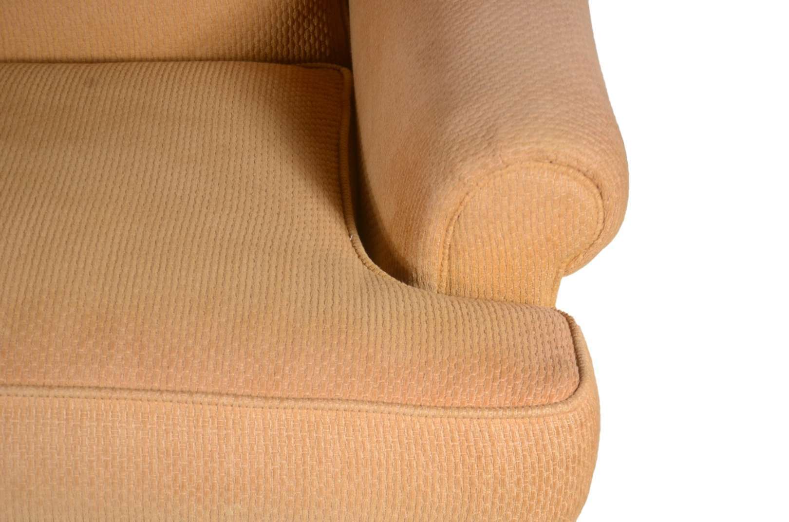 Sofá estofado e forrado em tecido na cor mostarda, dito "queixo mole". Desgastes.