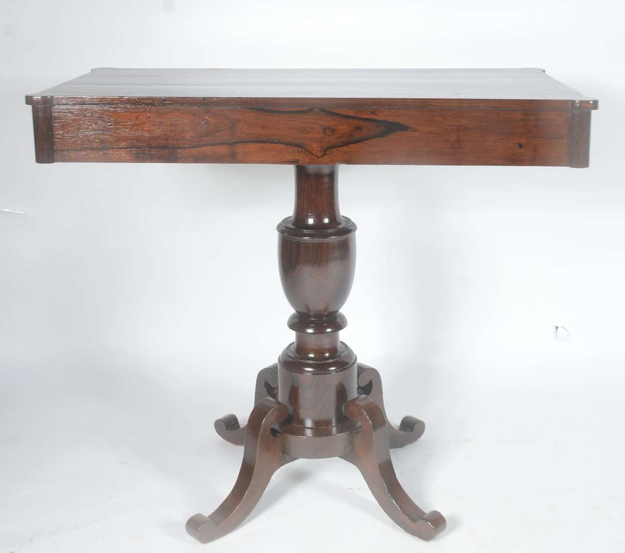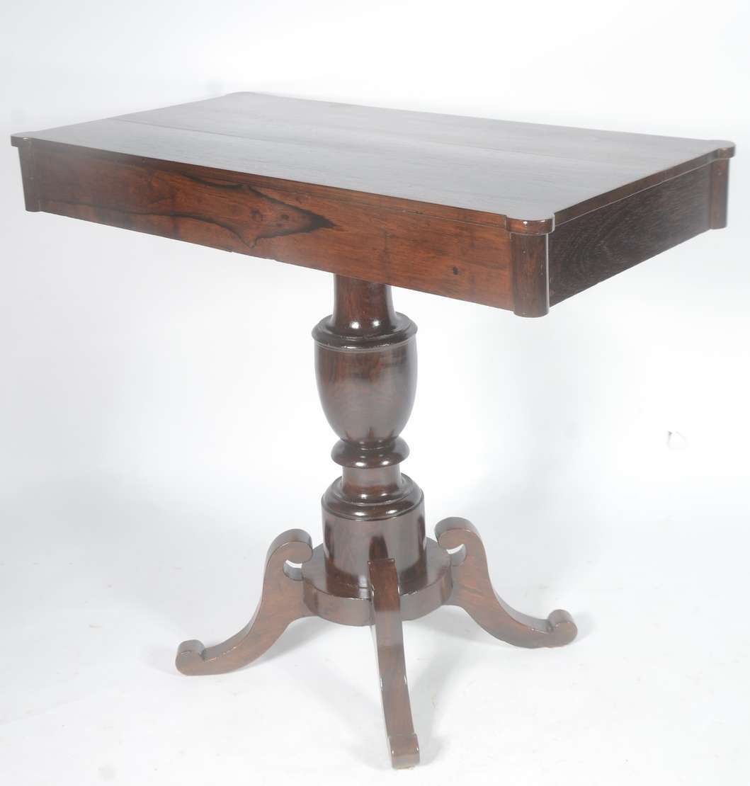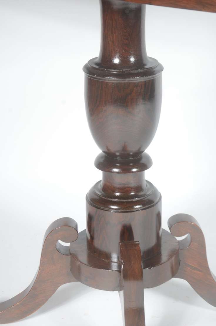Aparador de jacaranda, tampo retangular apoiado em coluna central torneada, terminando em quatro pés recurvos. Pequenos desgastes.