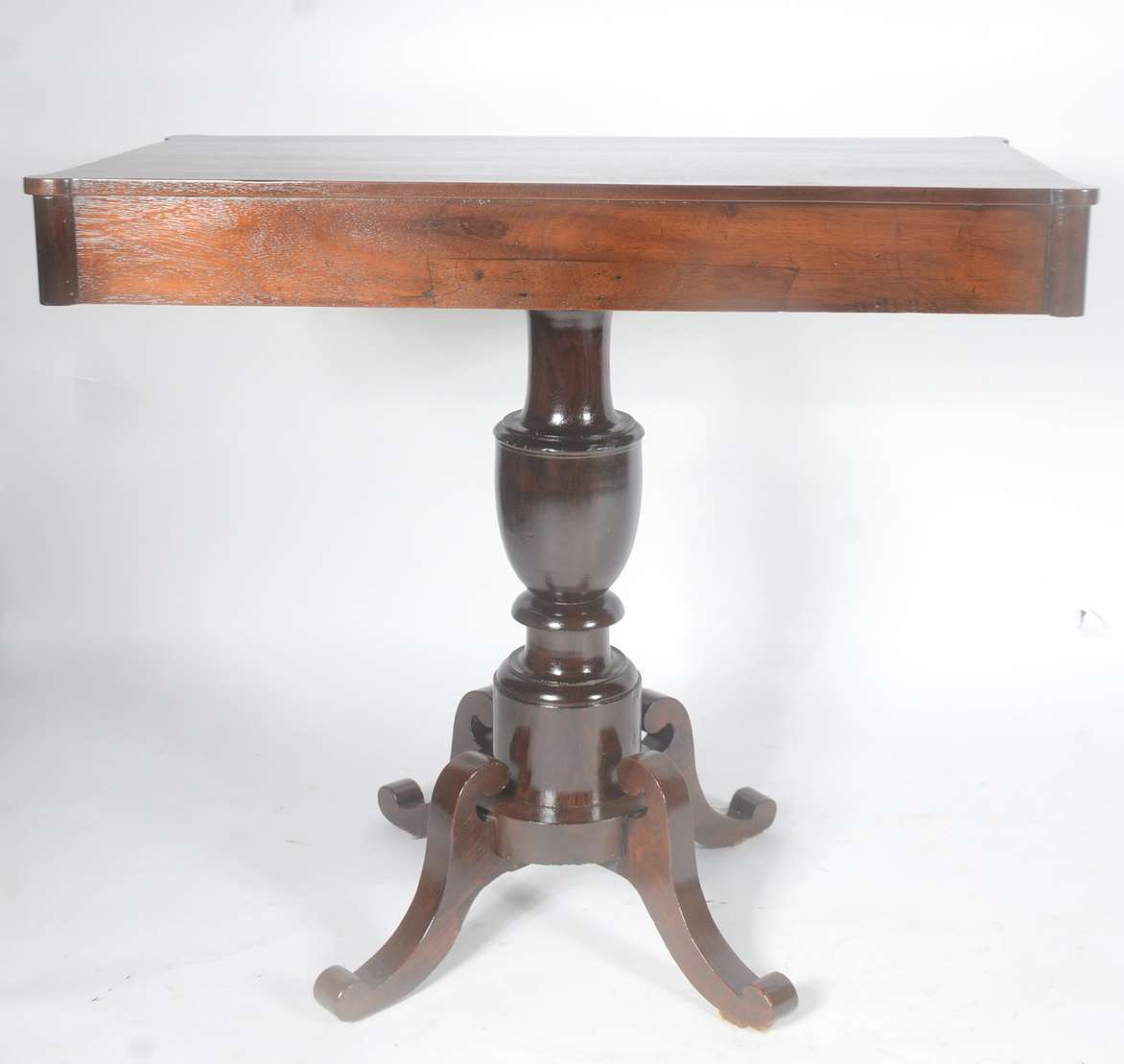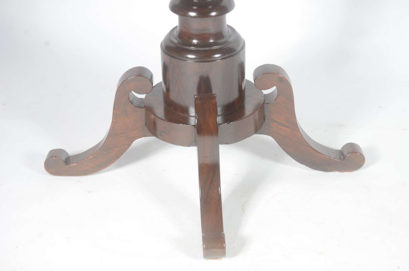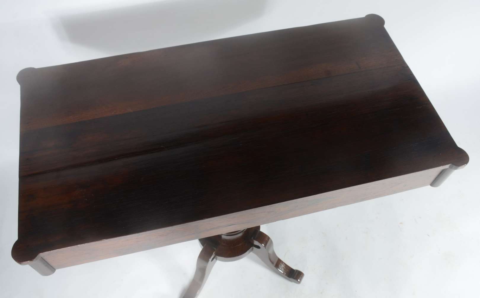 Aparador de jacaranda, tampo retangular apoiado em coluna central torneada, terminando em quatro pés recurvos. Pequenos desgastes.