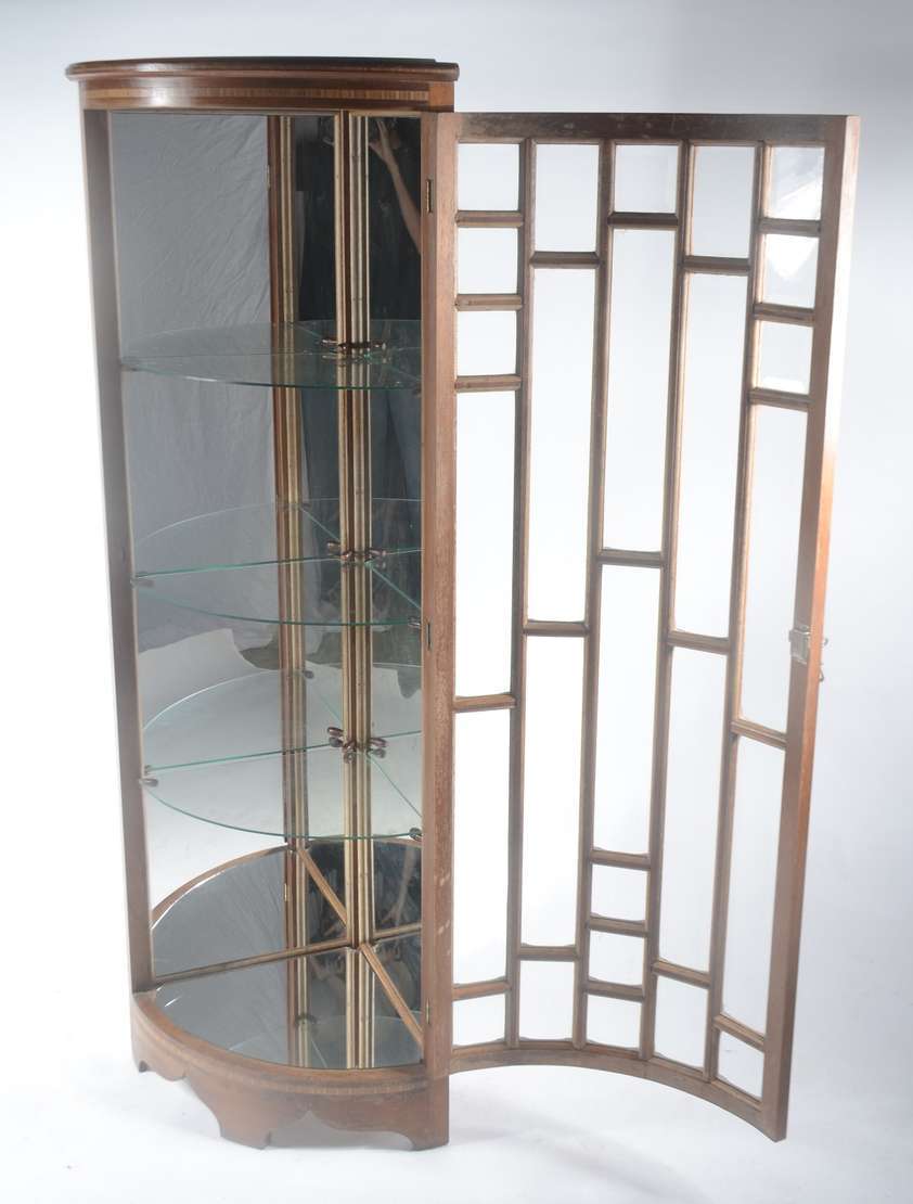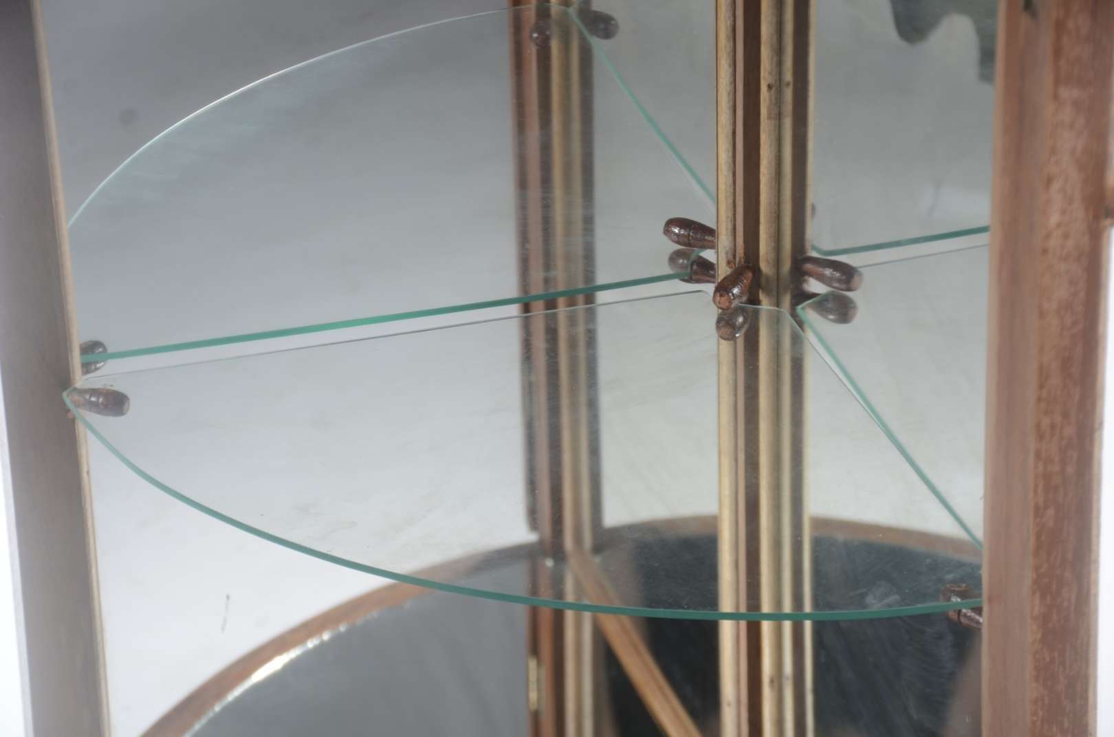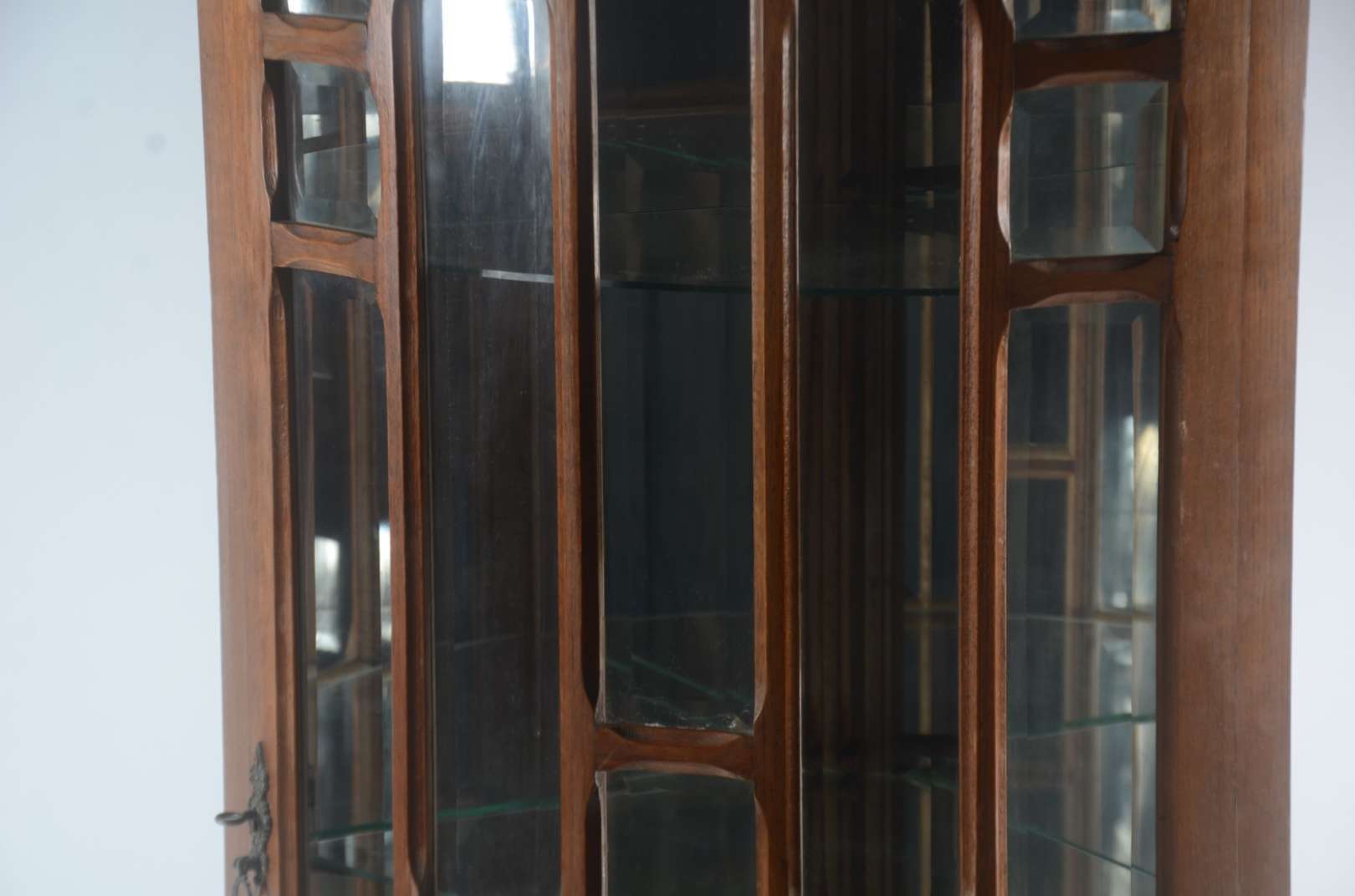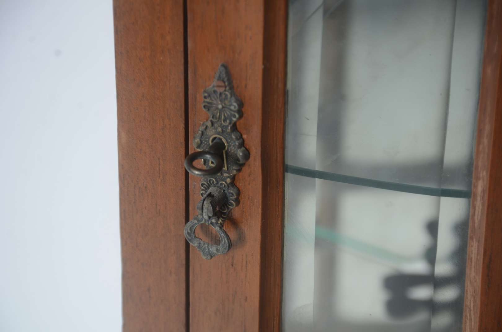 Móvel vitrine de madeira nobre, parte inferior com duas portas com detalhes de metal e prateleiras internas. Parte su...