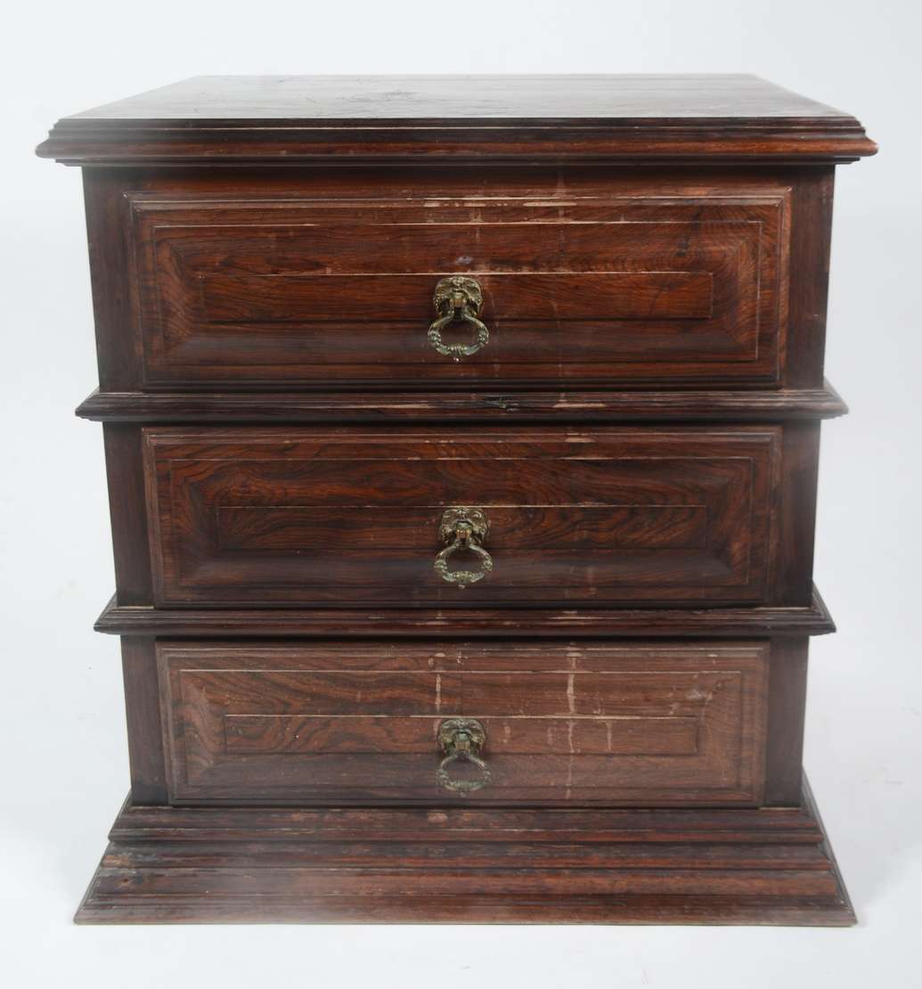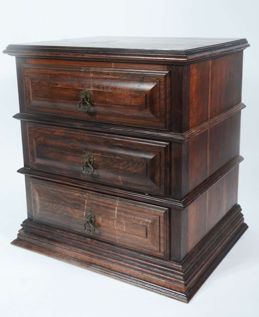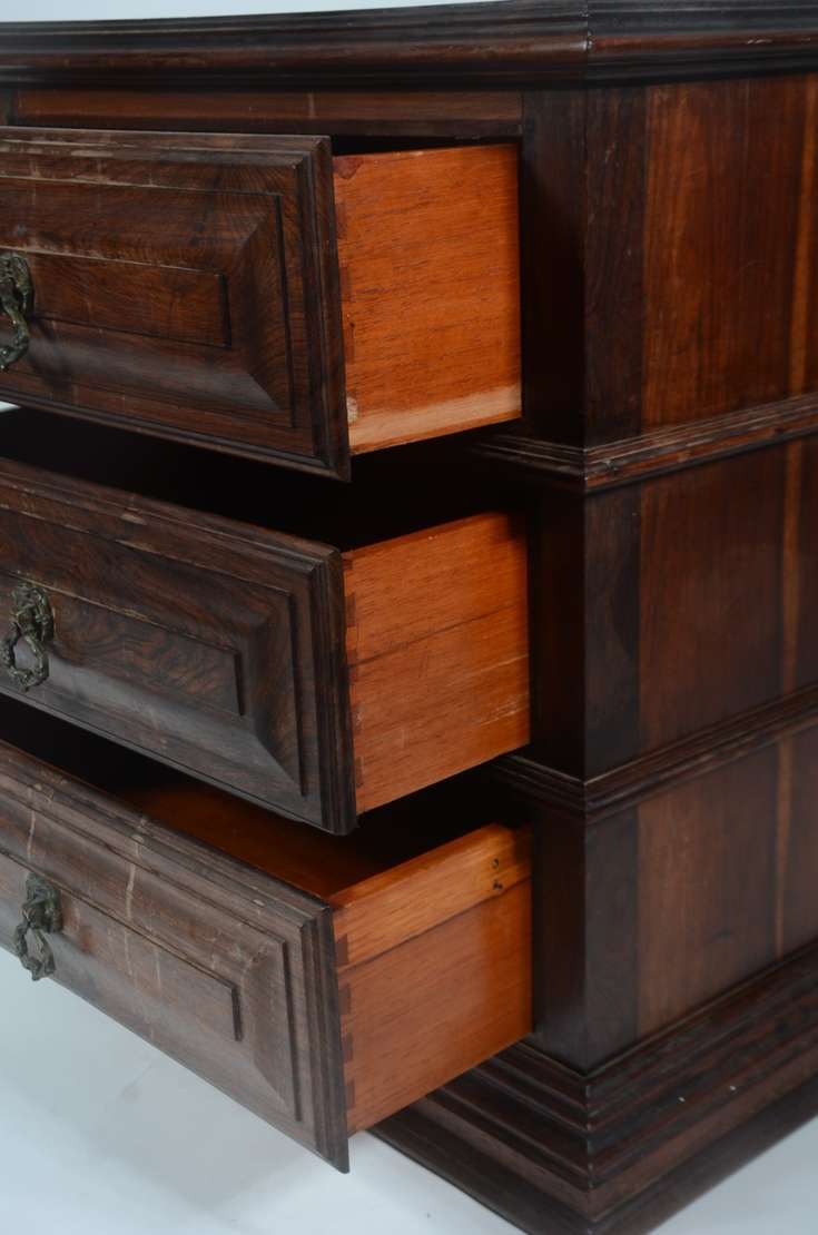 Mesinha auxiliar de madeira nobre, 3 gavetas almofadadas com puxadores de metal, estilo colonial brasileiro.