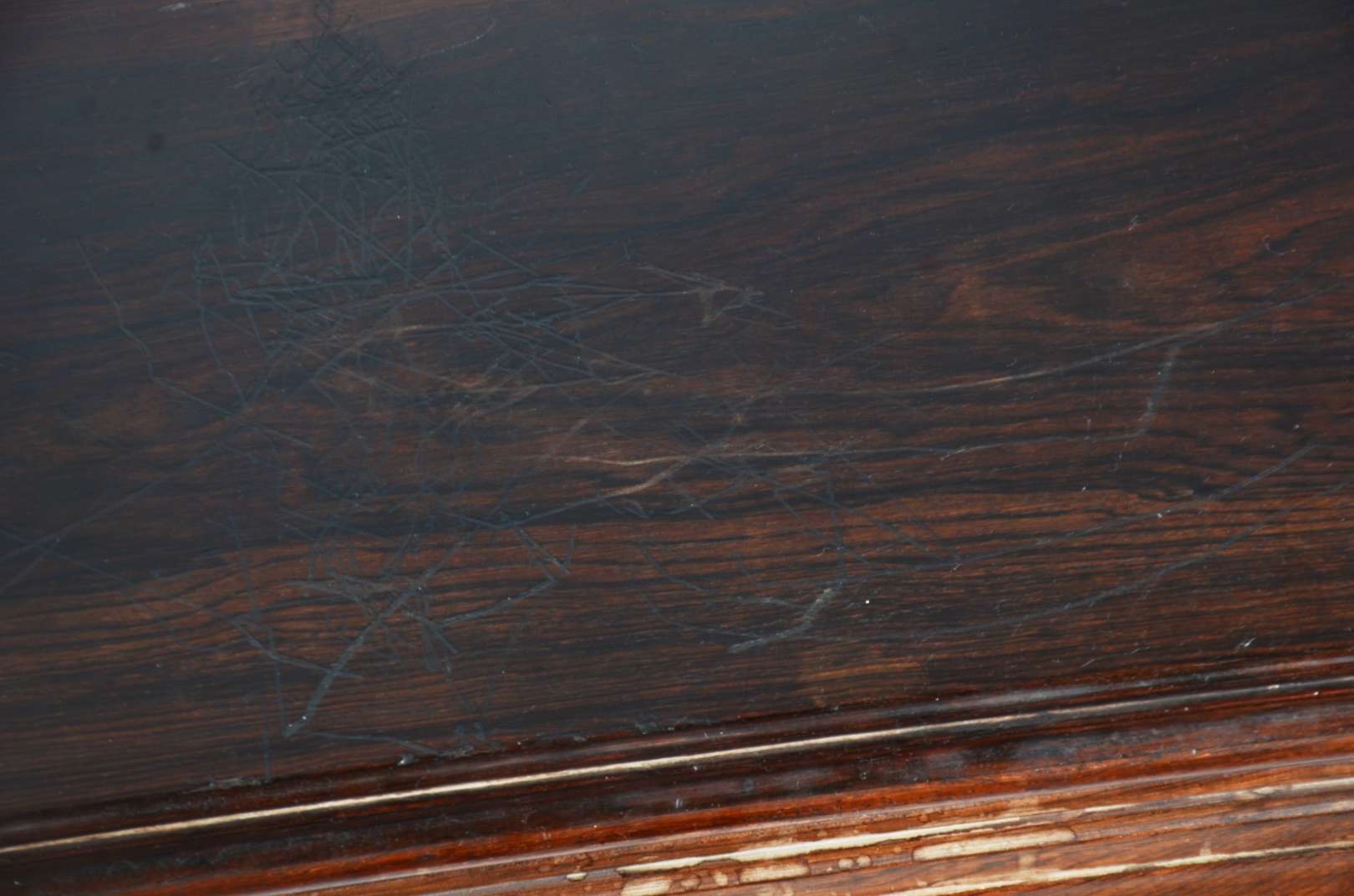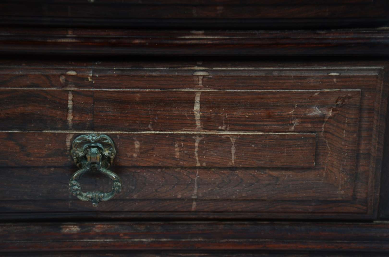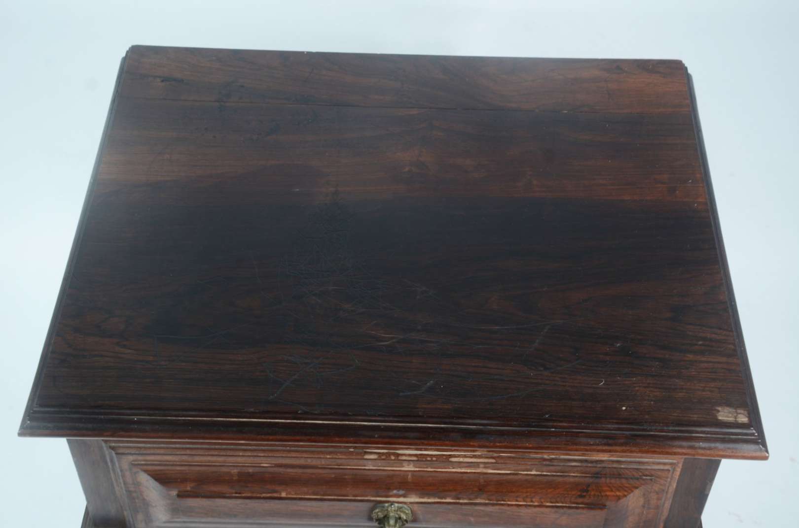 Mesinha auxiliar de madeira nobre, 3 gavetas almofadadas com puxadores de metal, estilo colonial brasileiro.