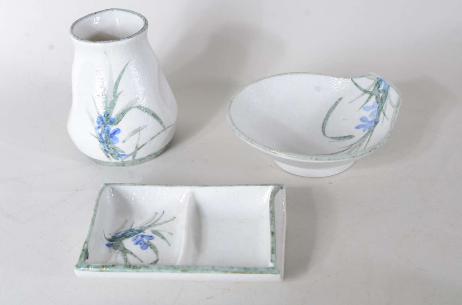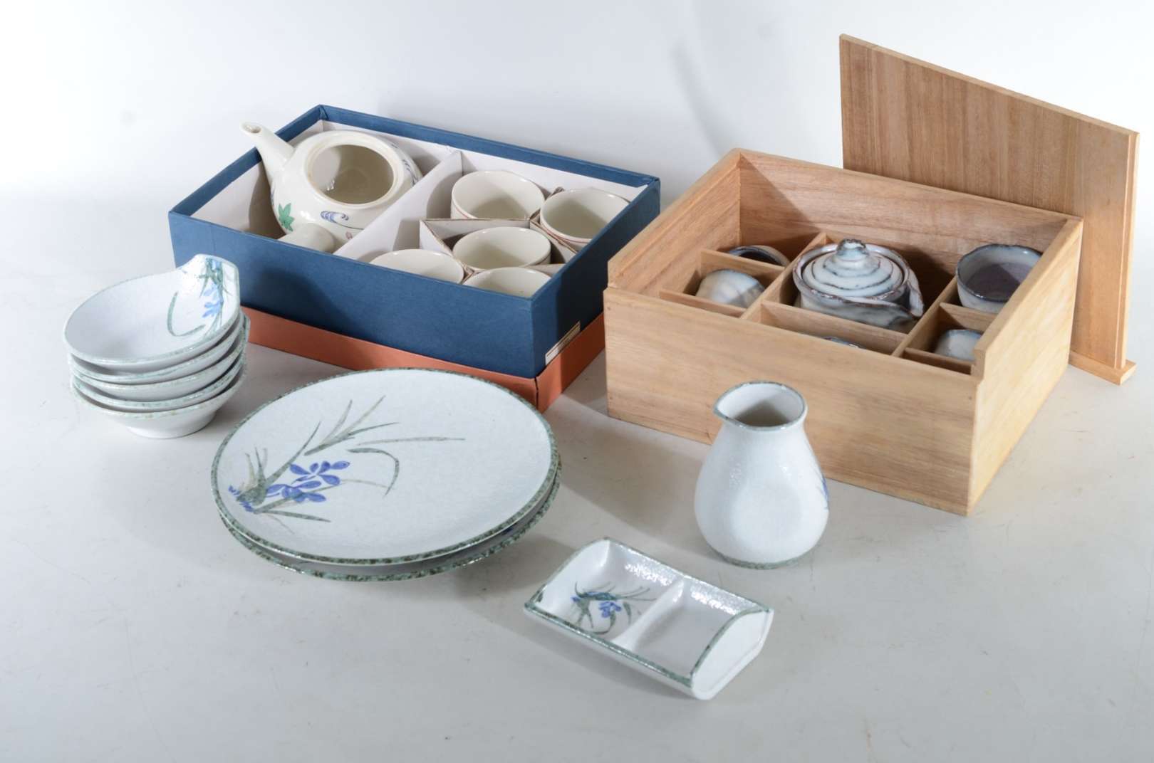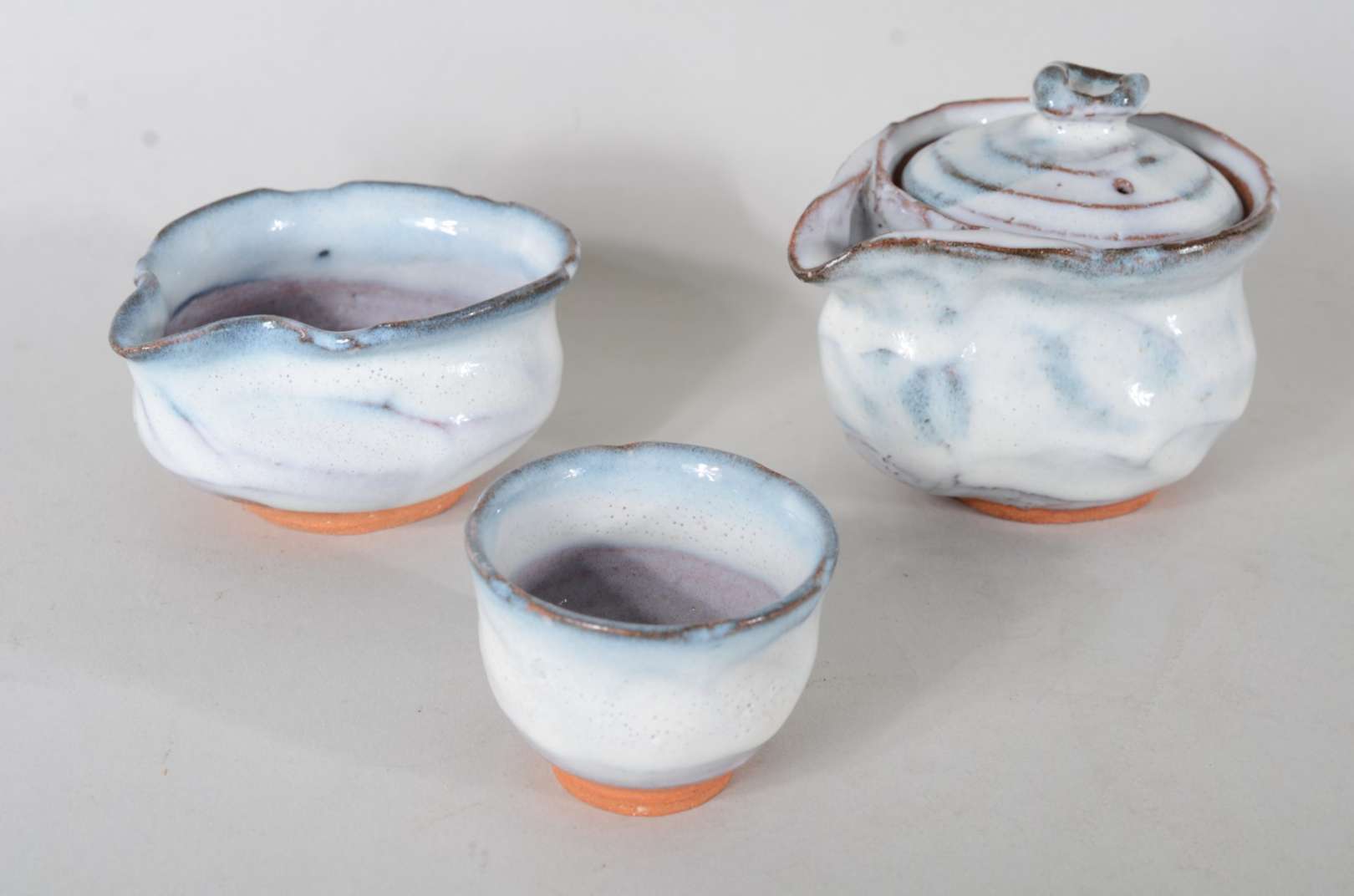 Duas peças, sendo: vaso de vidro azul e jarra com alça de metal.