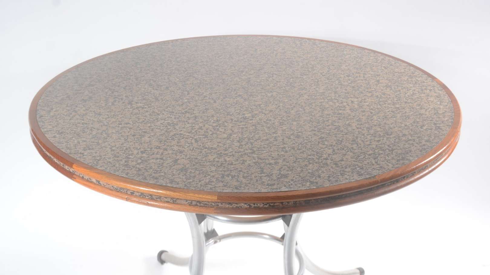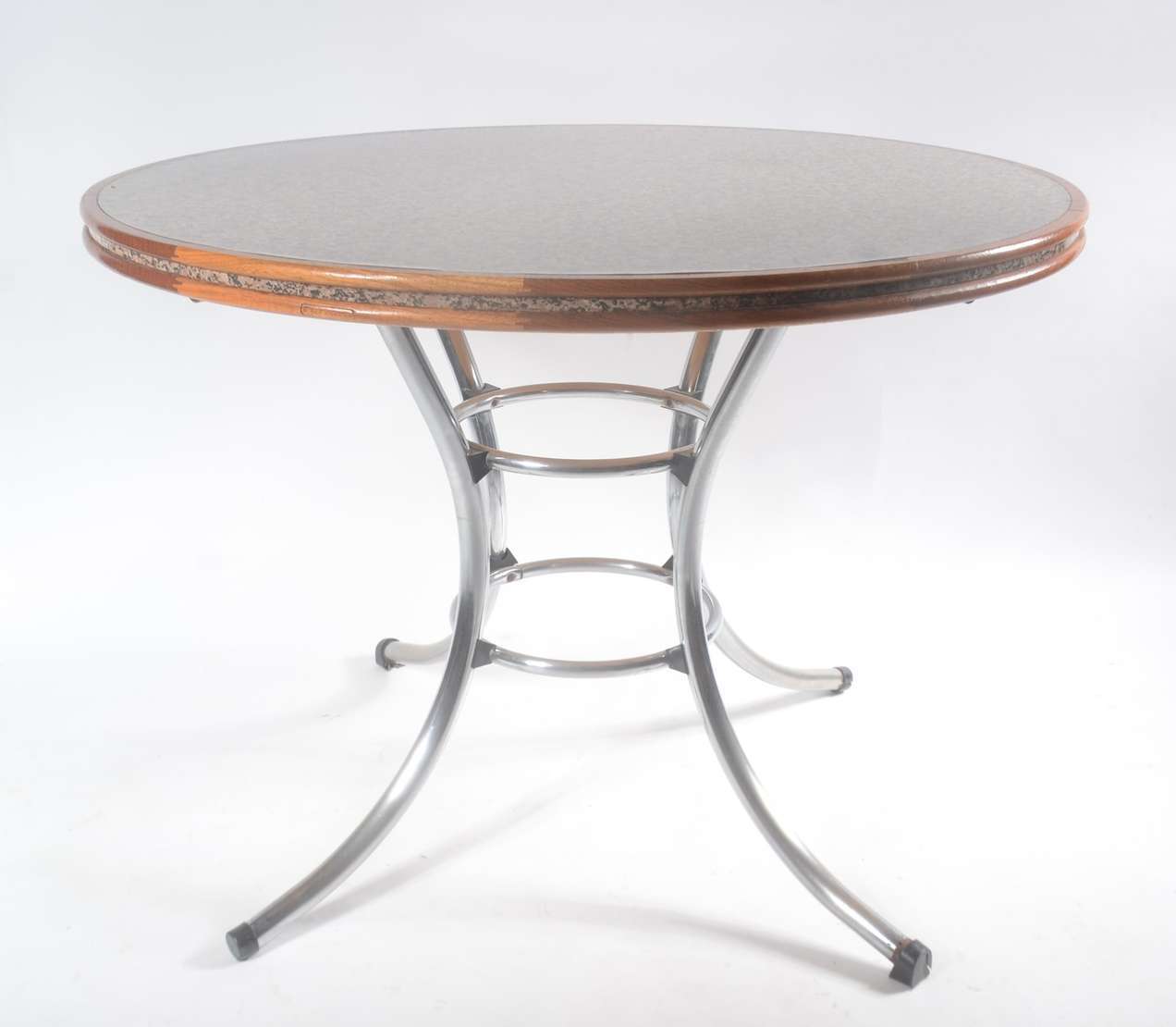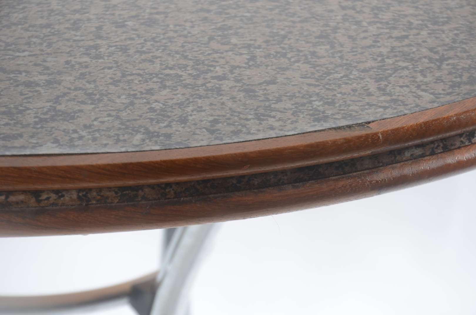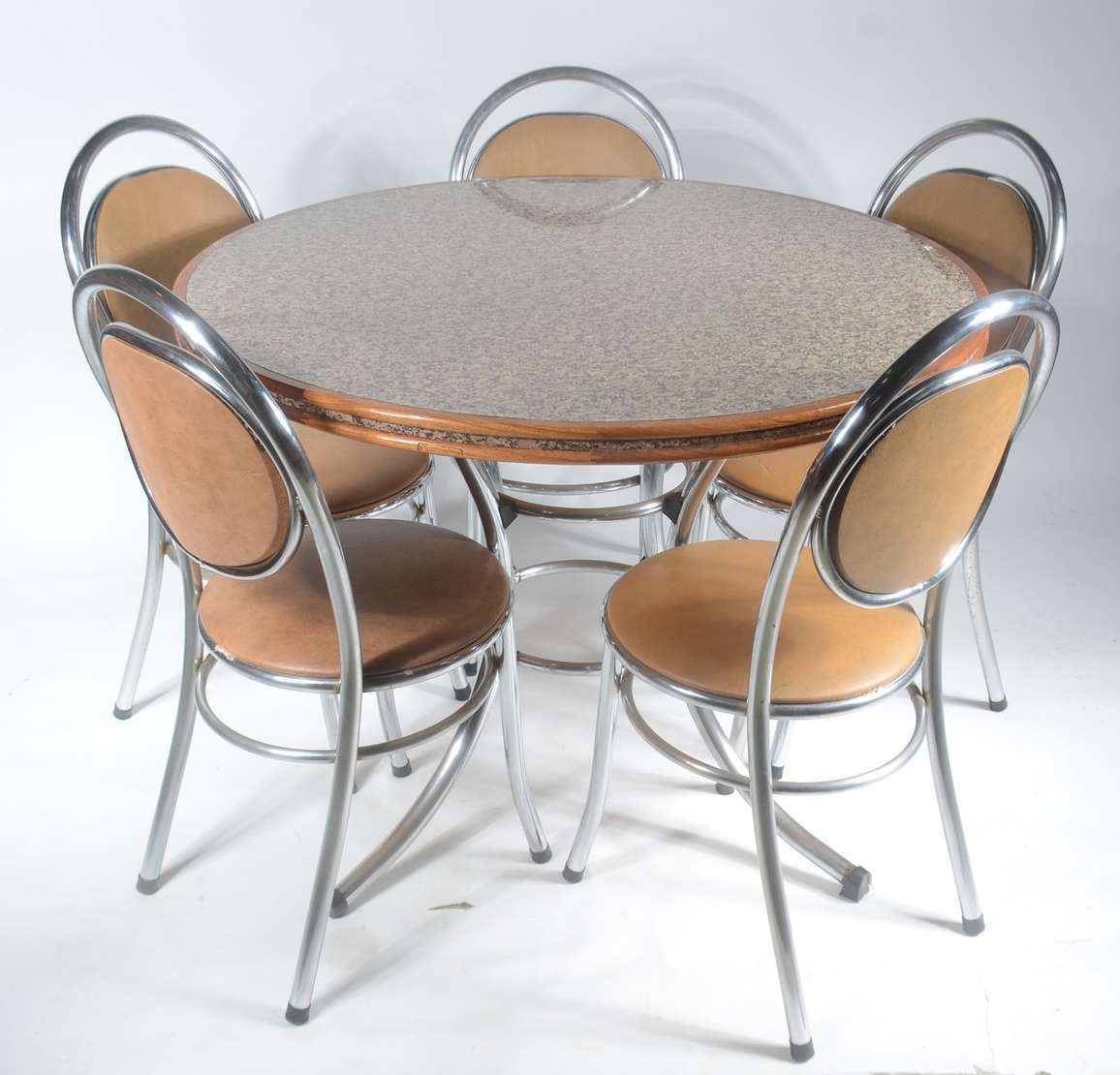Conjunto de mesa redonda com base de metal e tampo de granito com bordas em madeira, acompanham cinco cadeiras no estilo austríaco de metal com assentos e encostos estofados e forrados com tecido na cor mostarda.