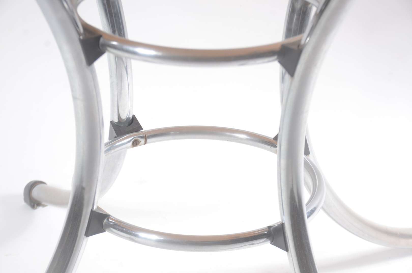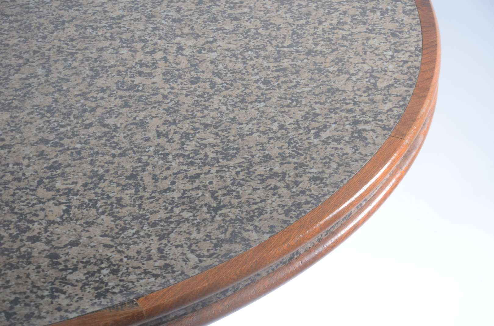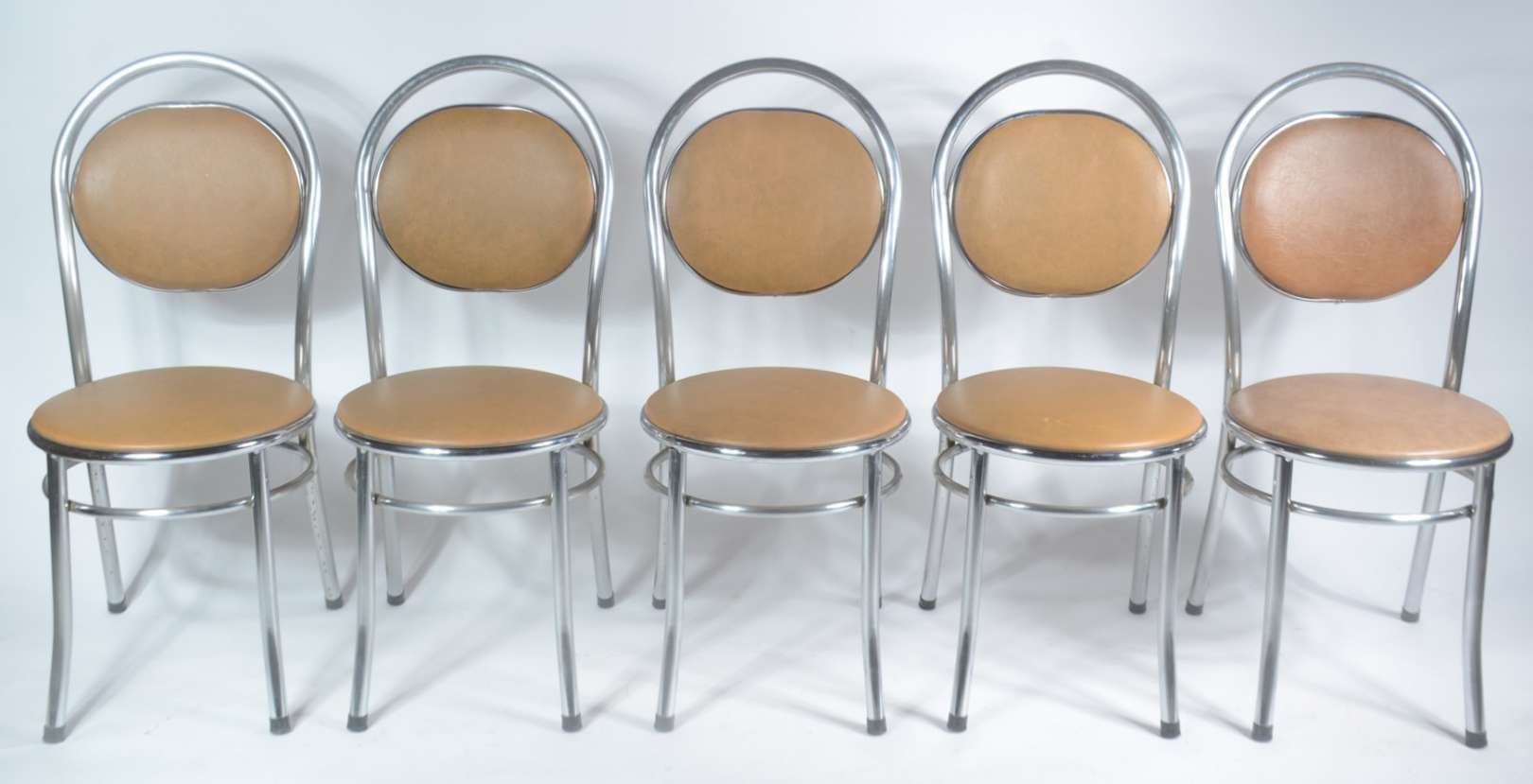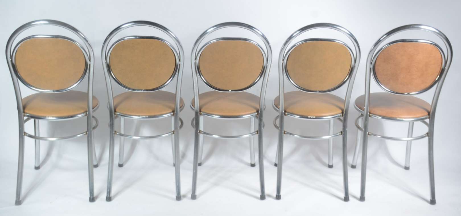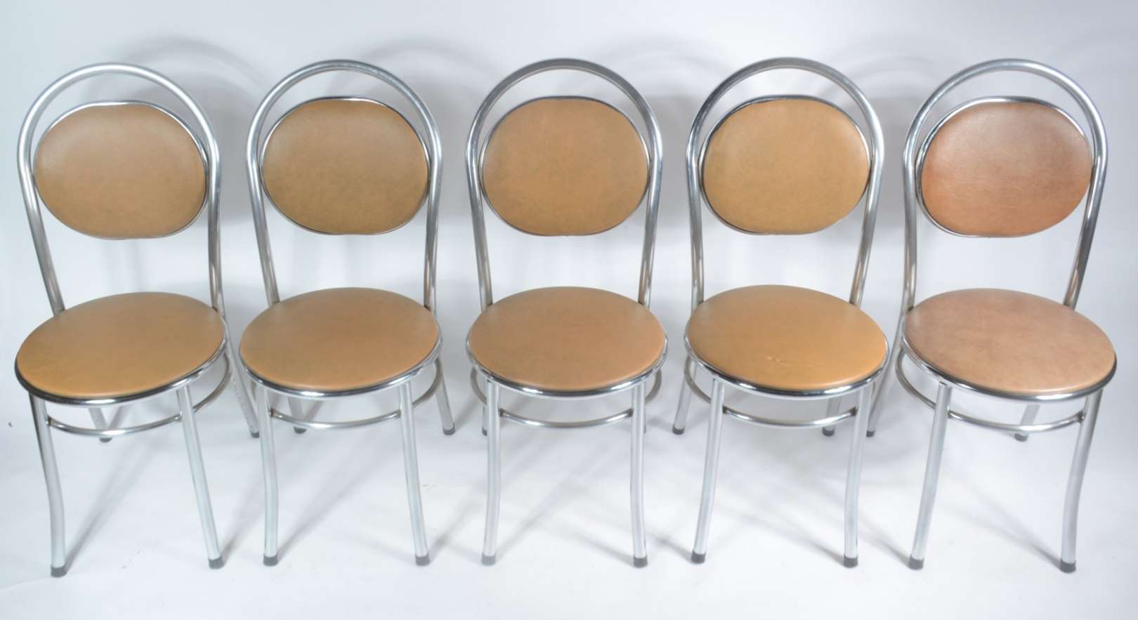 Conjunto de mesa redonda com base de metal e tampo de granito com bordas em madeira, acompanham cinco cadeiras no estilo austríaco de metal com assentos e encostos estofados e forrados com tecido na cor mostarda.