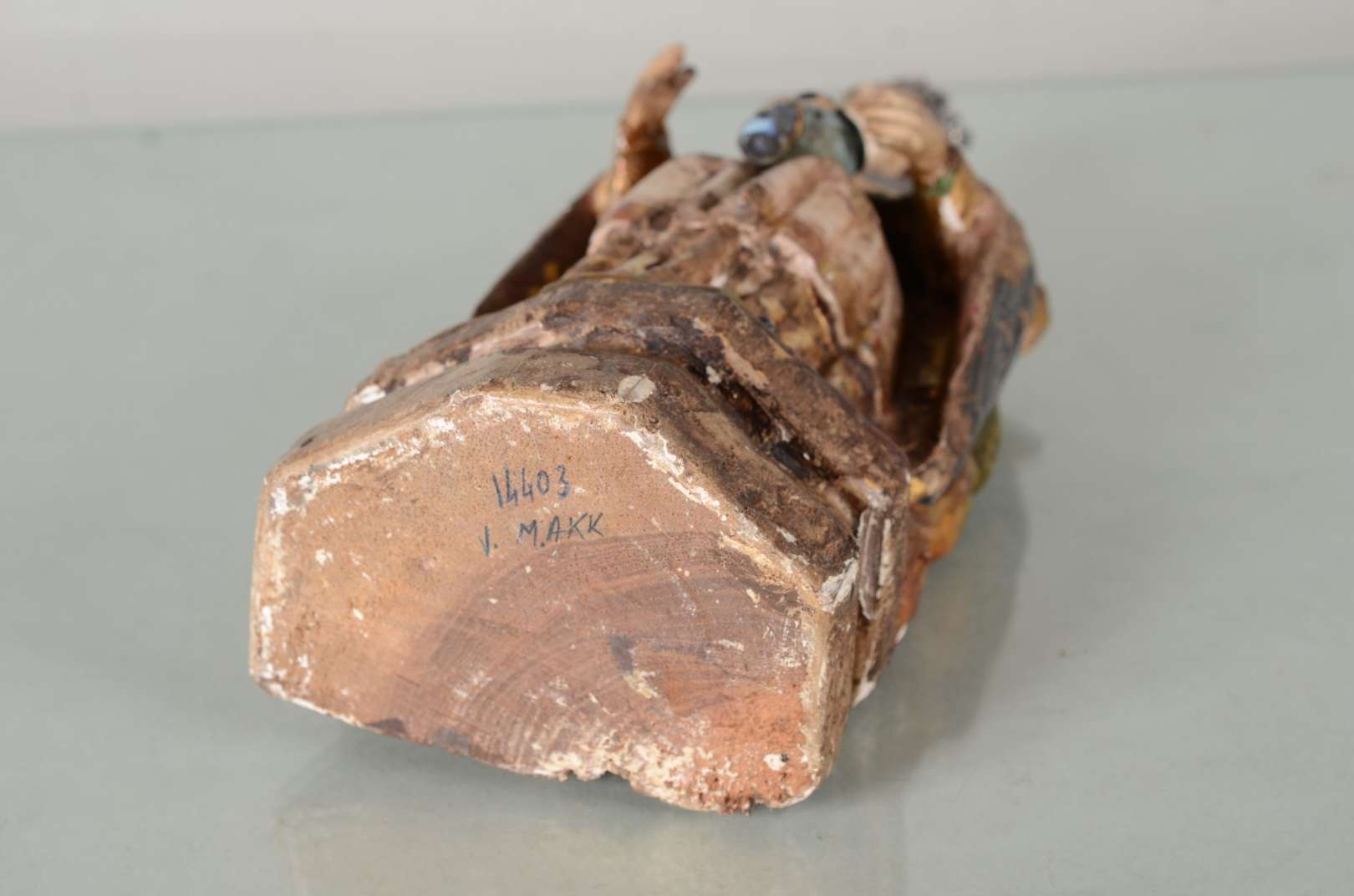 Três esculturas de madeira entalhada, sendo: Placa com rosto de jovem, assinada B.F.Heise, 1945; Figura de homem agac...