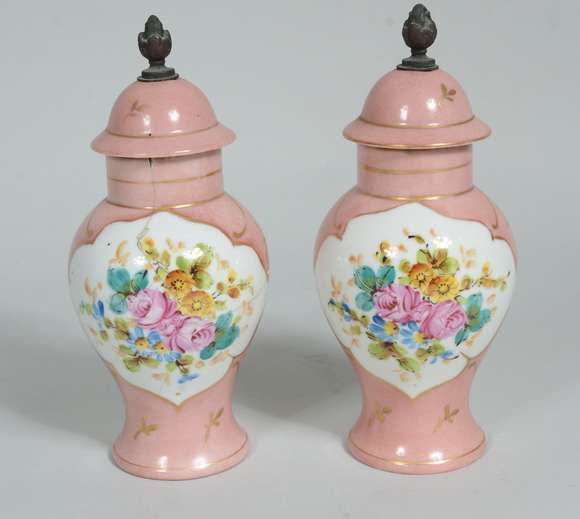 Par de pequenas ânforas de porcelana, fundo rosa com flores pintadas á mão em policromia e realces dourados. Uma dela...