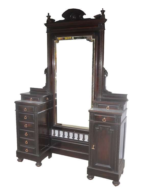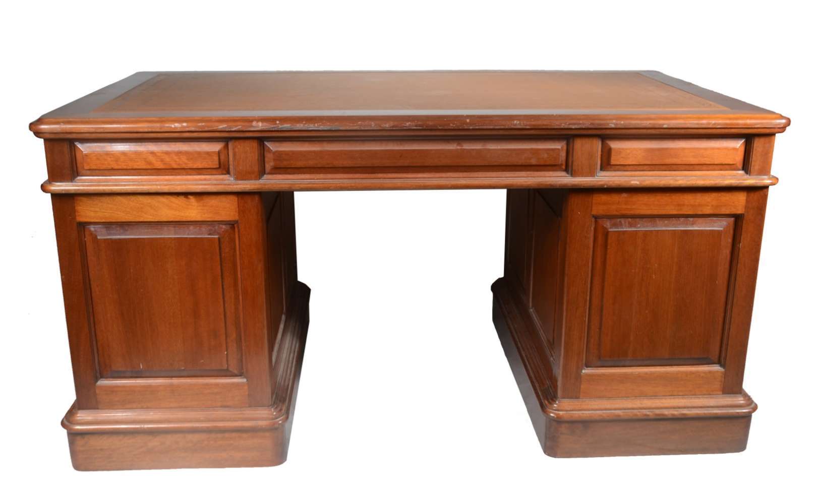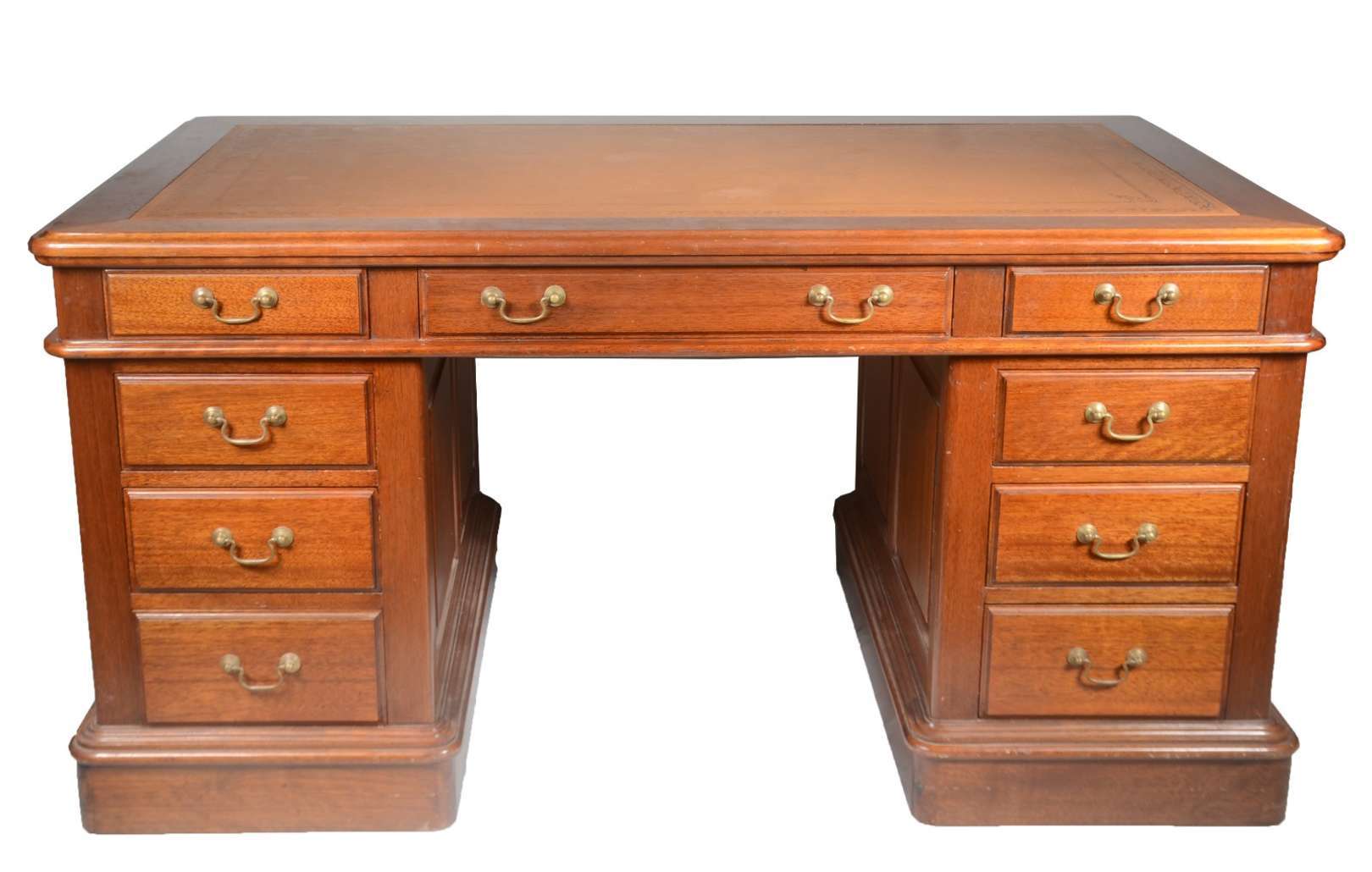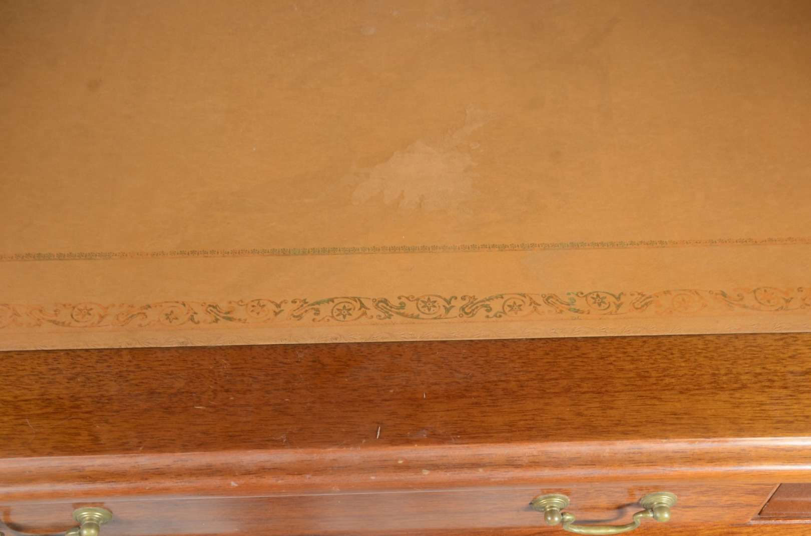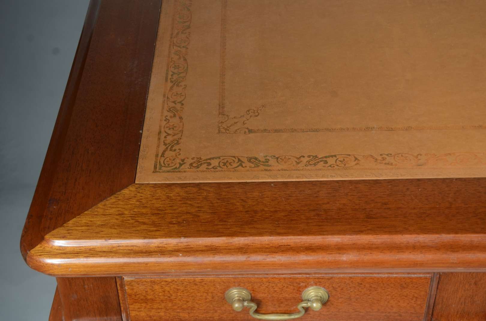 Escrivaninha estilo ingles de madeira nobre, quatro gavetas nas laterais e uma central, puxadores de metal dourado, tampo de couro pirogravado.