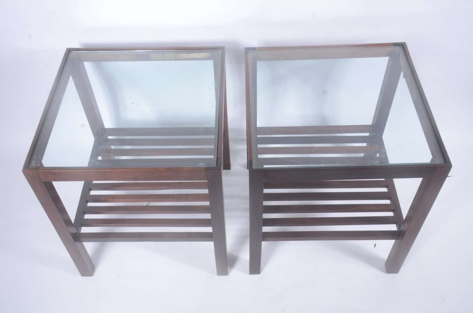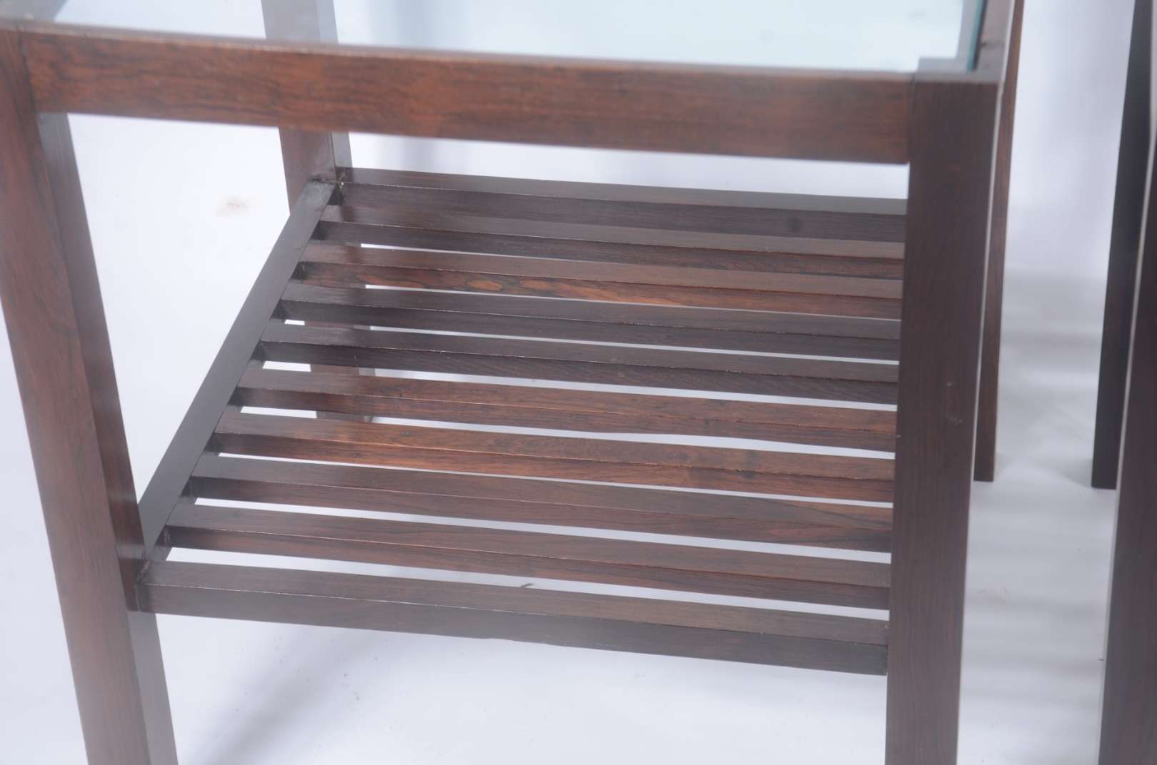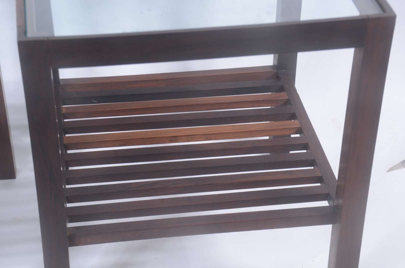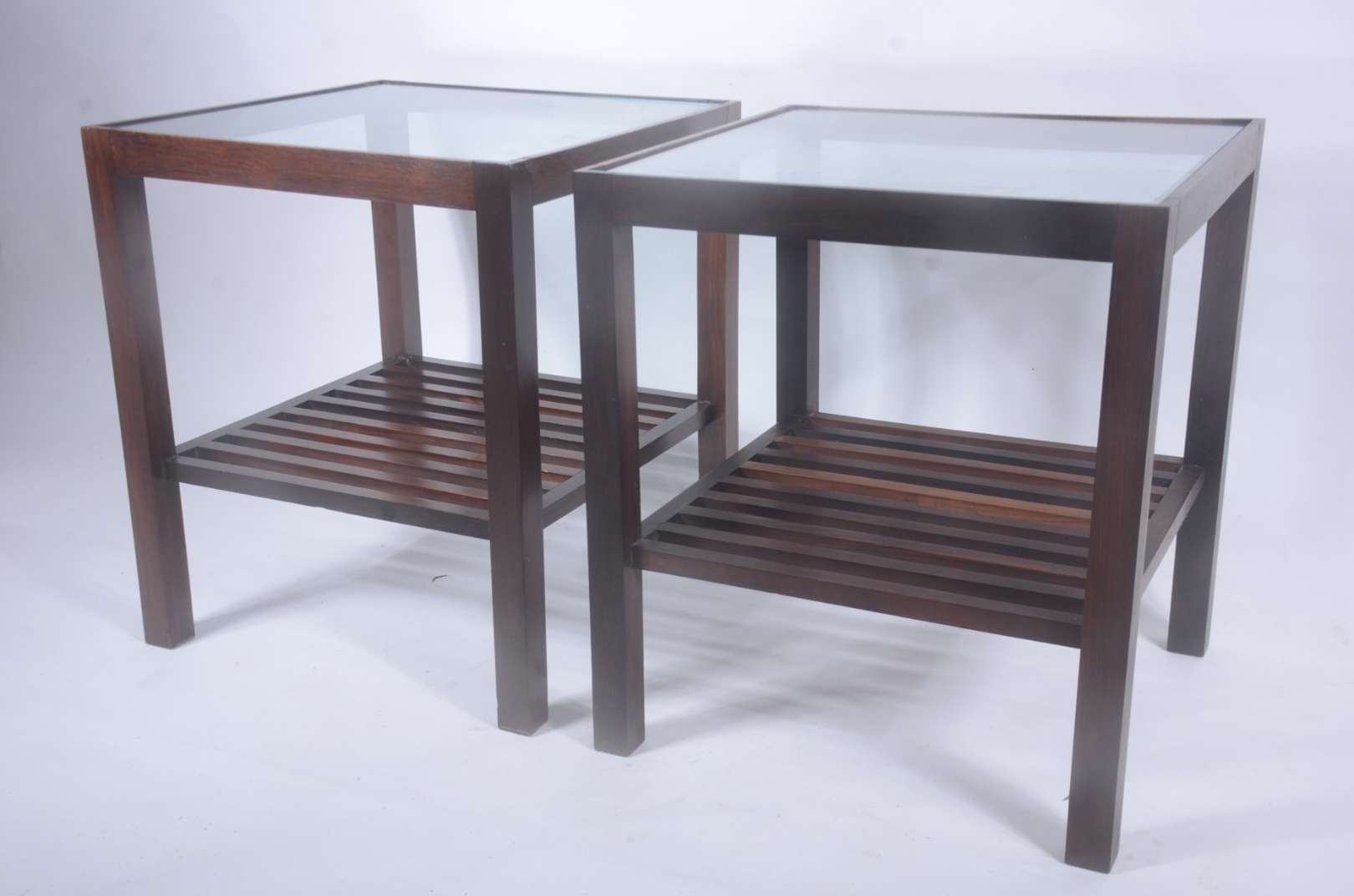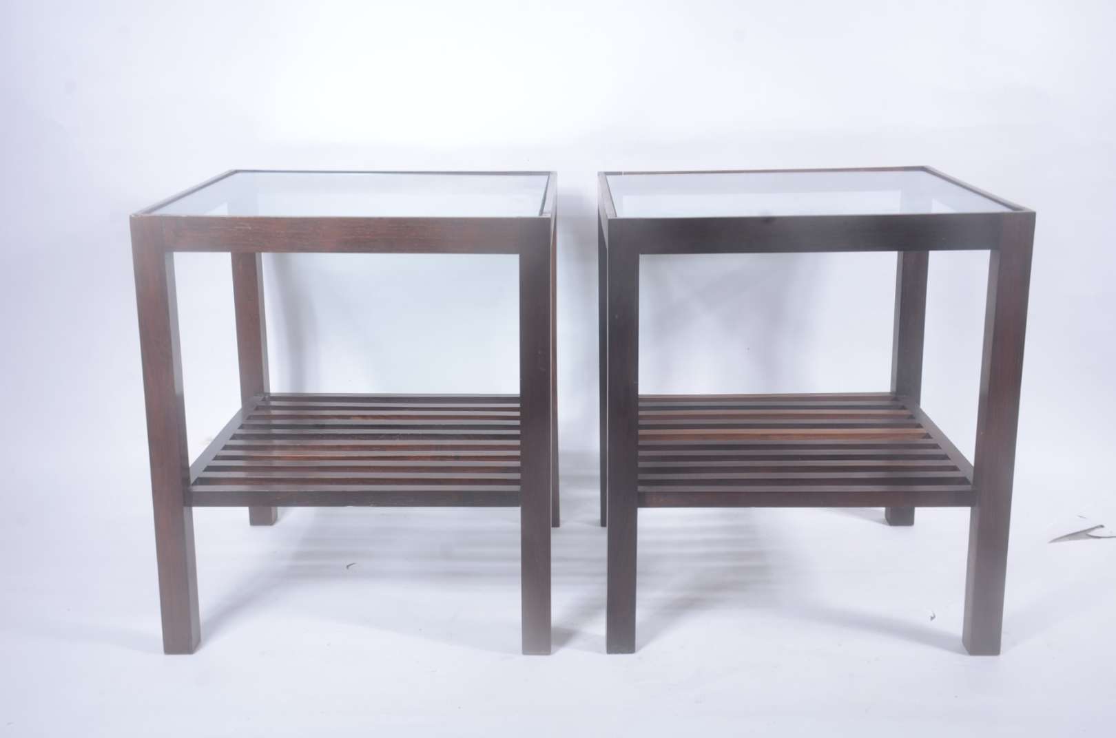 Mesa ninho com estrutura de "bambu" e tampo de vidro, 3 peças.
