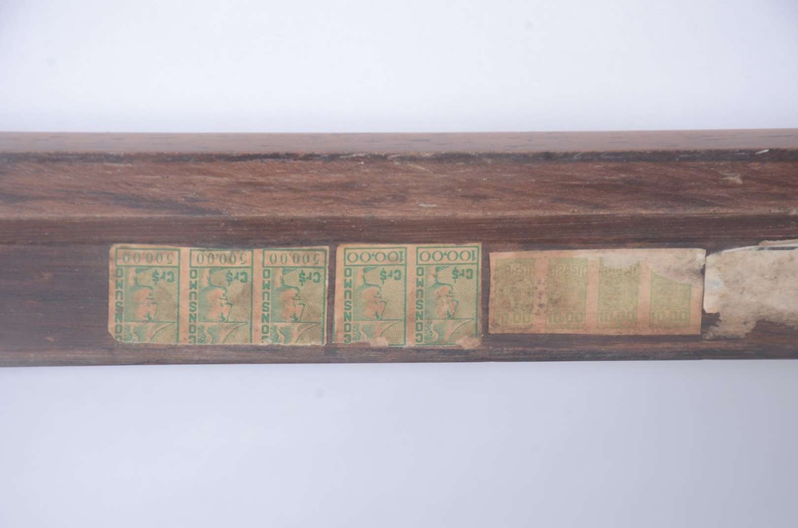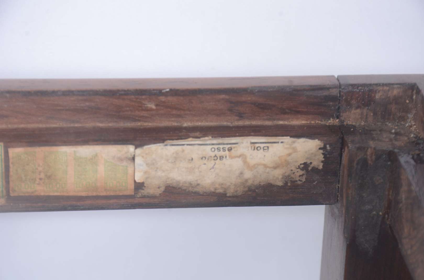 Coluna de madeira nobre filetada, tampo circular com tres pernas ligadas por platô inferior. Pequenos desgastes.