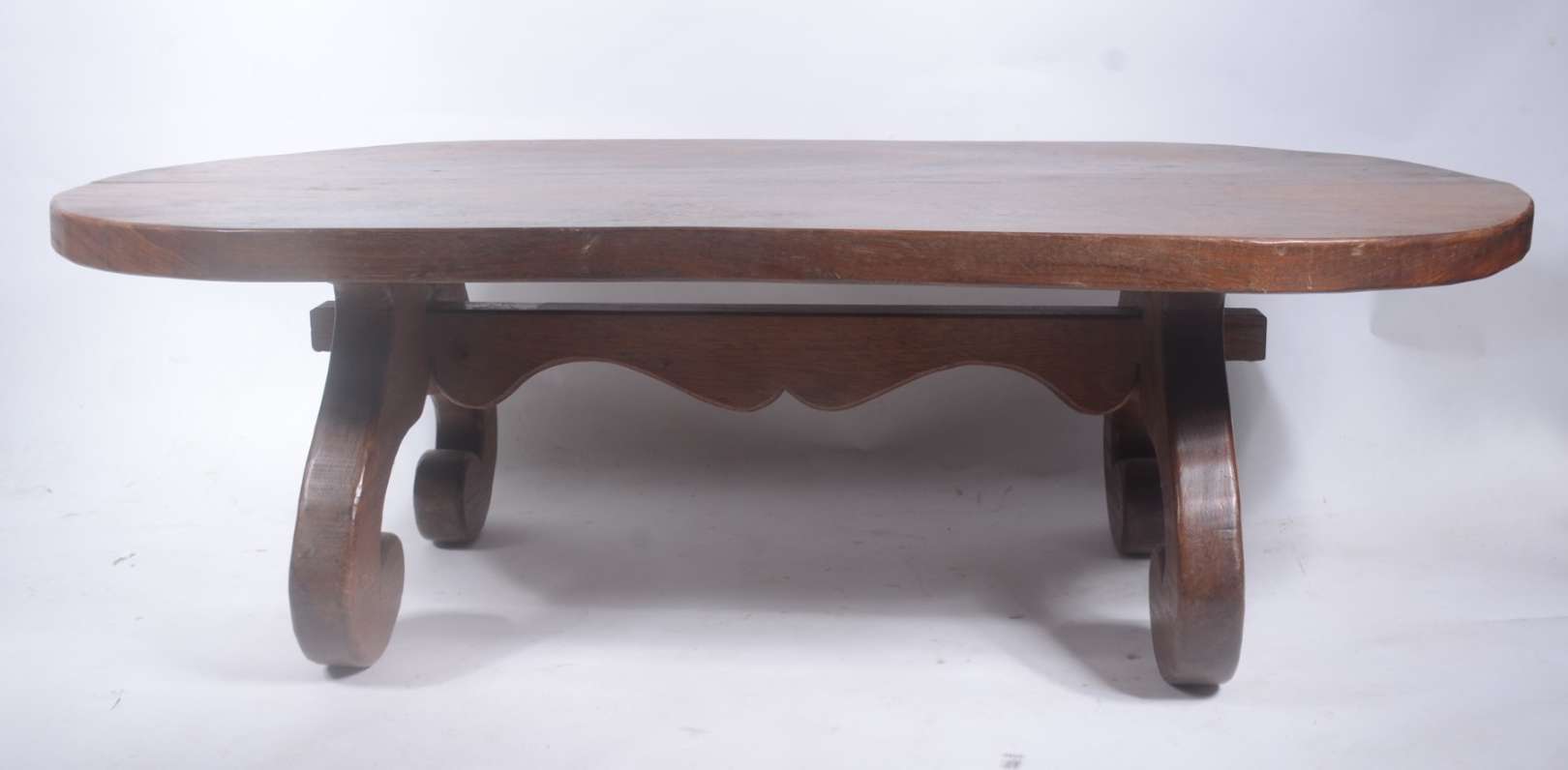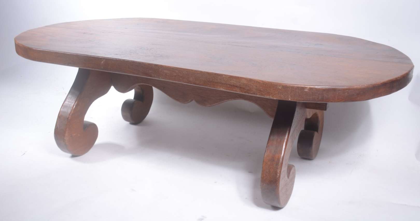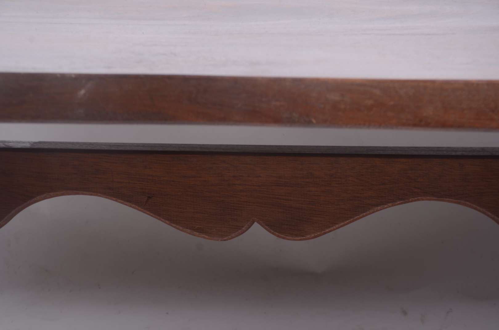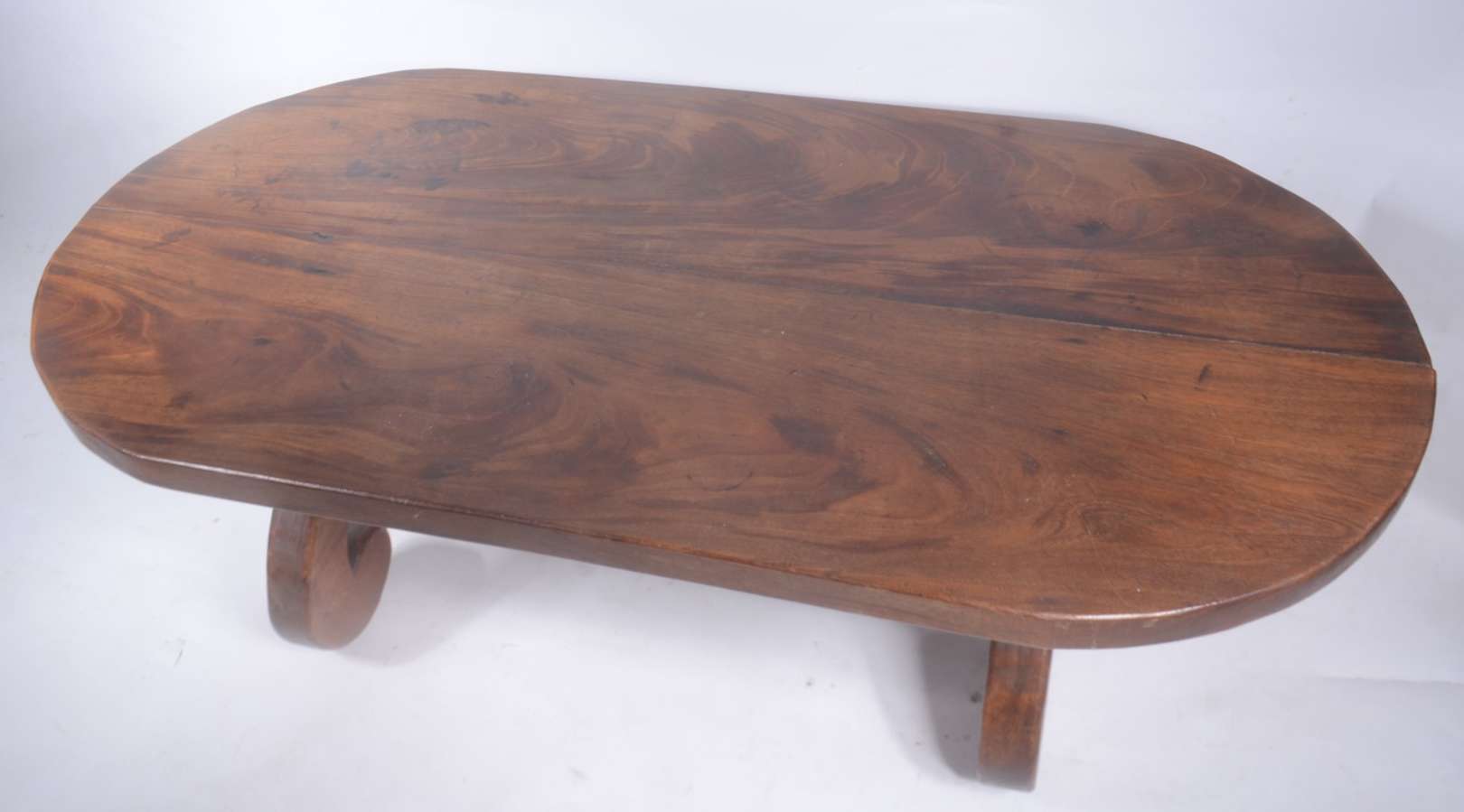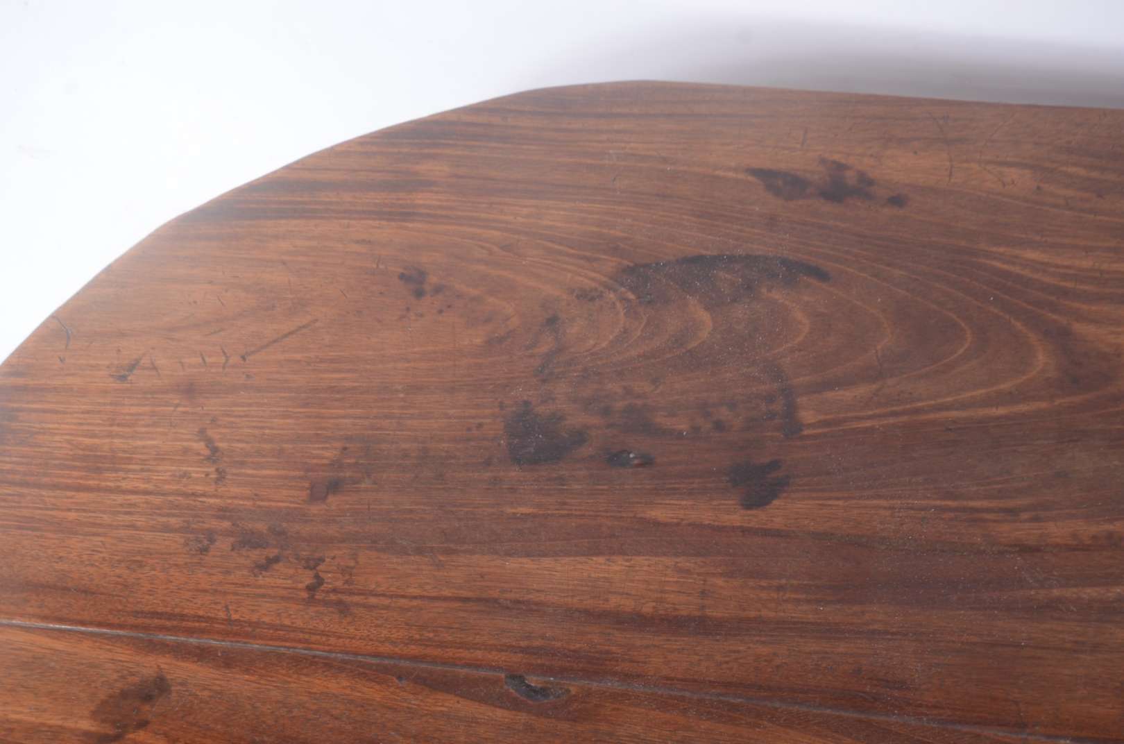 Coluna de madeira nobre filetada, tampo circular com tres pernas ligadas por platô inferior. Pequenos desgastes.