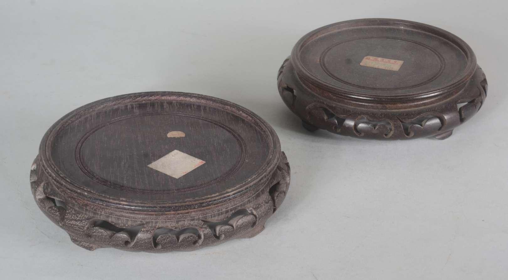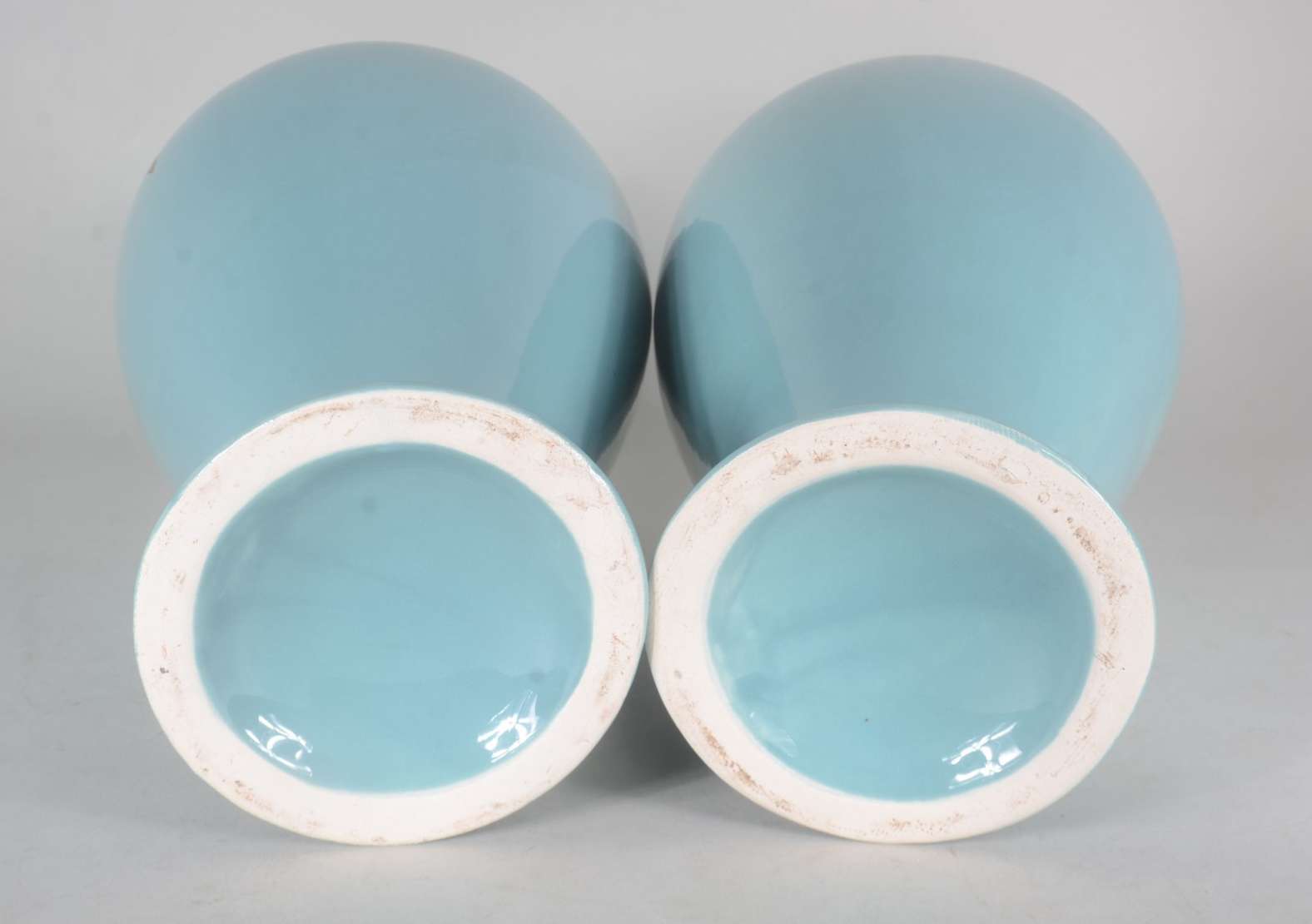 Par de potes de farmácia de porcelana Saler, nomes identificadores em reserva e decoração com pavões e folhagens em p...