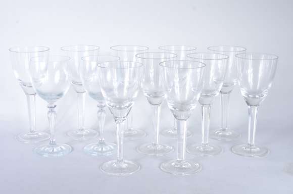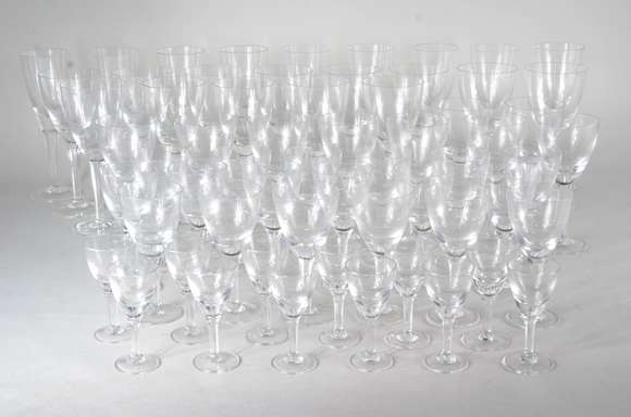Serviço de cristal, composto de: 13 taças para água, 9 para vinho tinto, 18 para vinho branco, 12 para licor e 9 flut...
