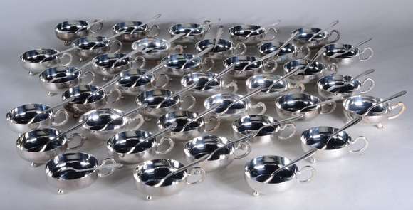 Conjunto com 35 taças com colheres para sorvete de metal prateado.