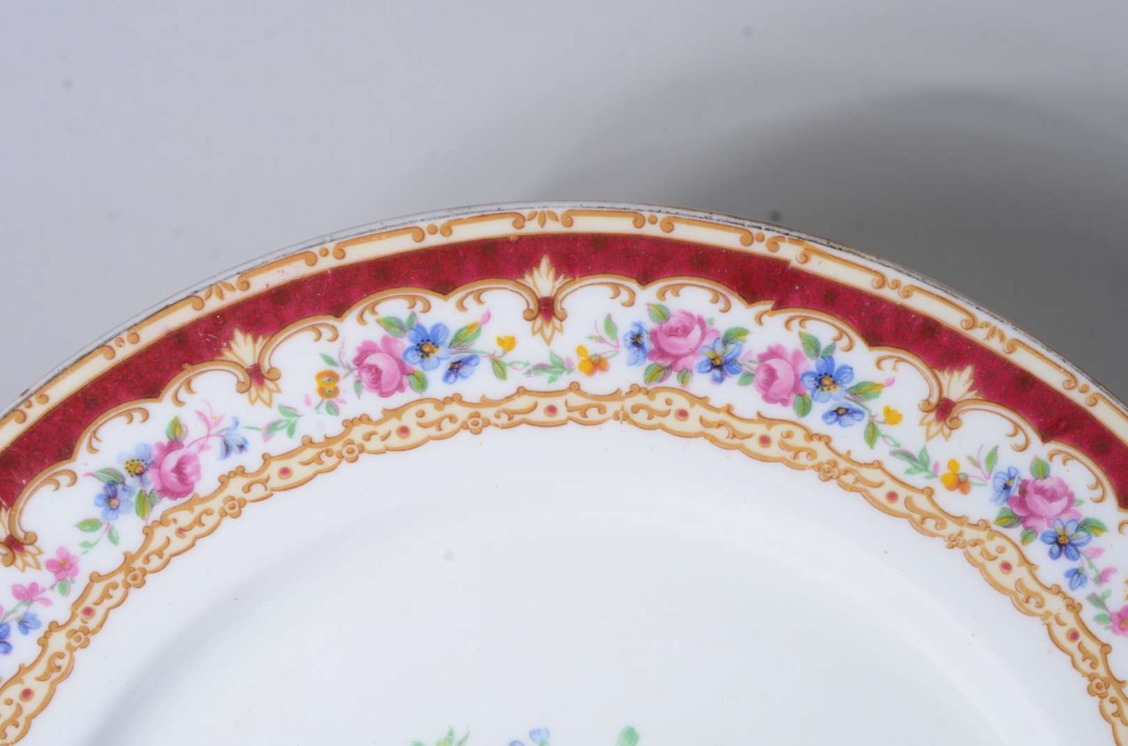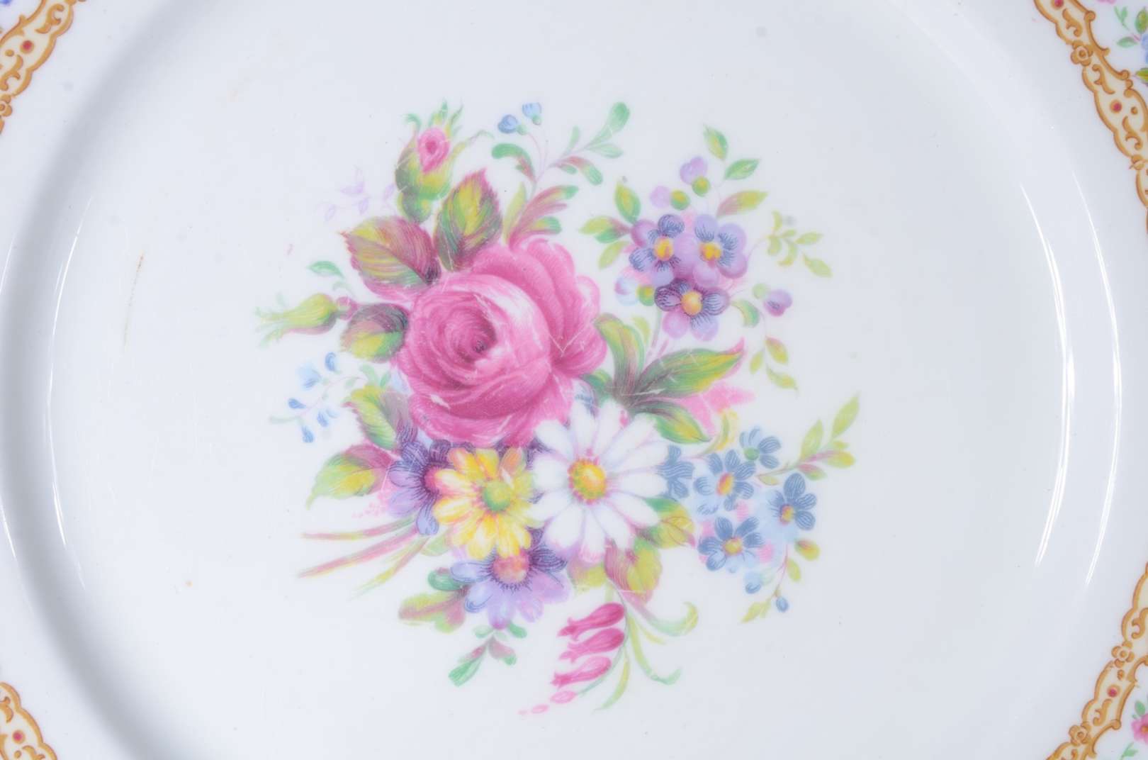 Serviço de jantar de porcelana Noritake branca com borda floral e friso dourado, composto de: 19 pratos rasos, 12 pra...