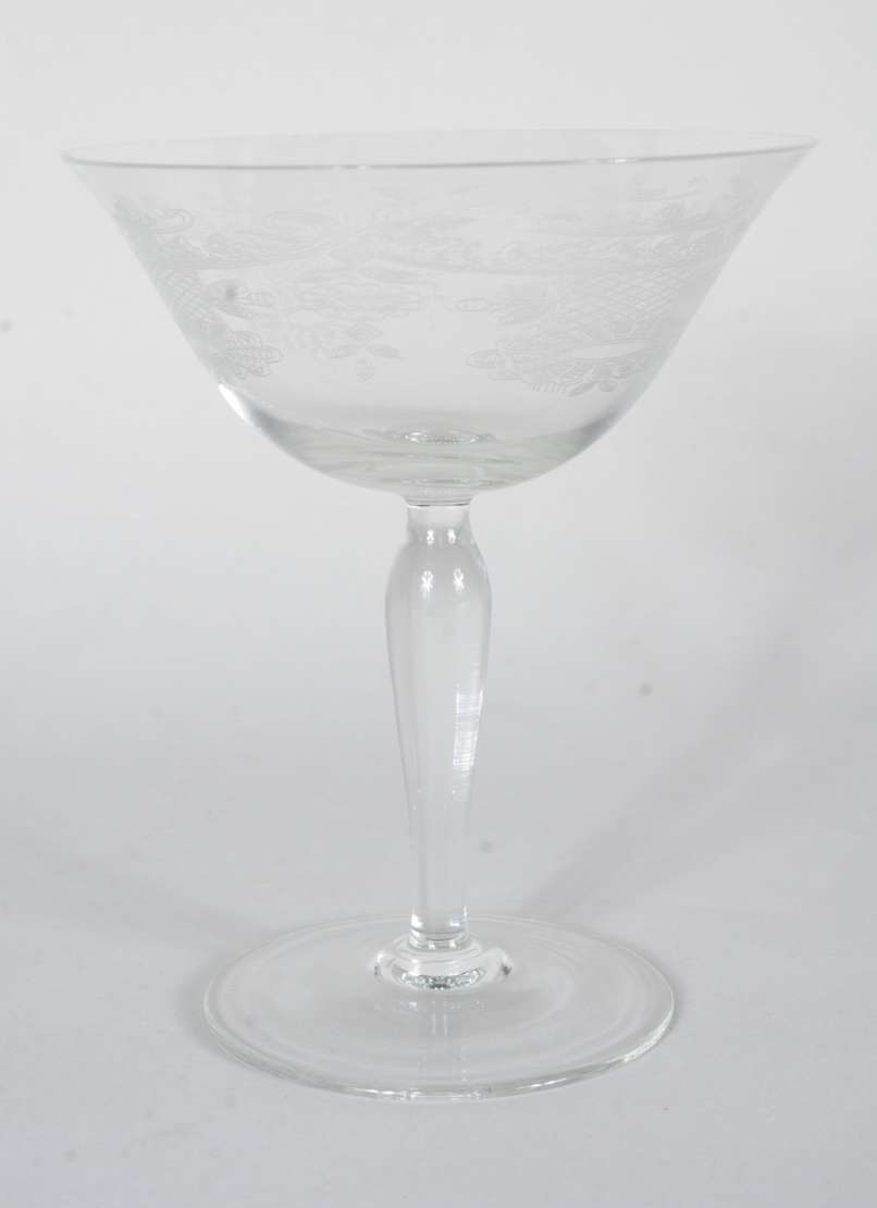 Serviço de copos de vidro com detalhes azuis, composto de: 10 logos para água; 11 para água, 12 para vinho tinto, 14 ...
