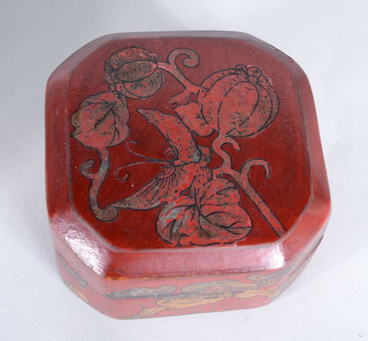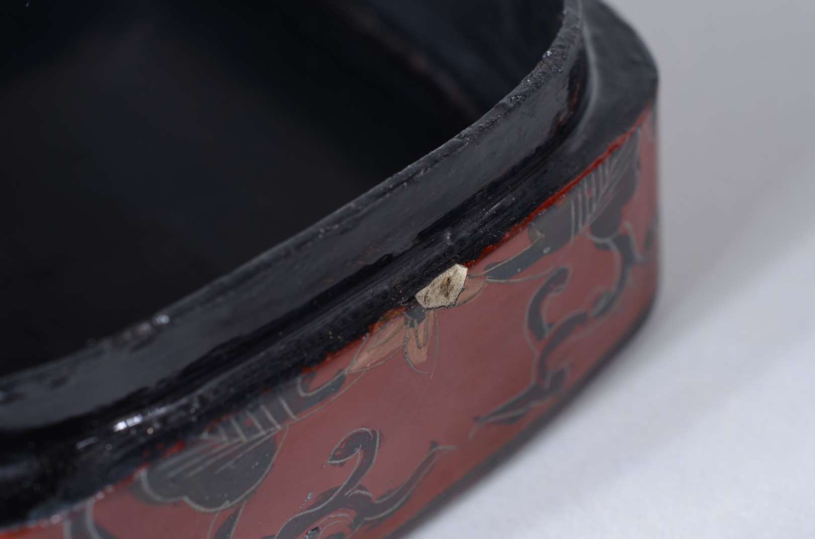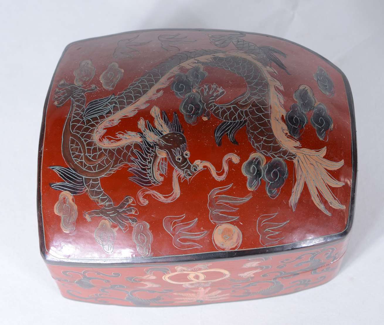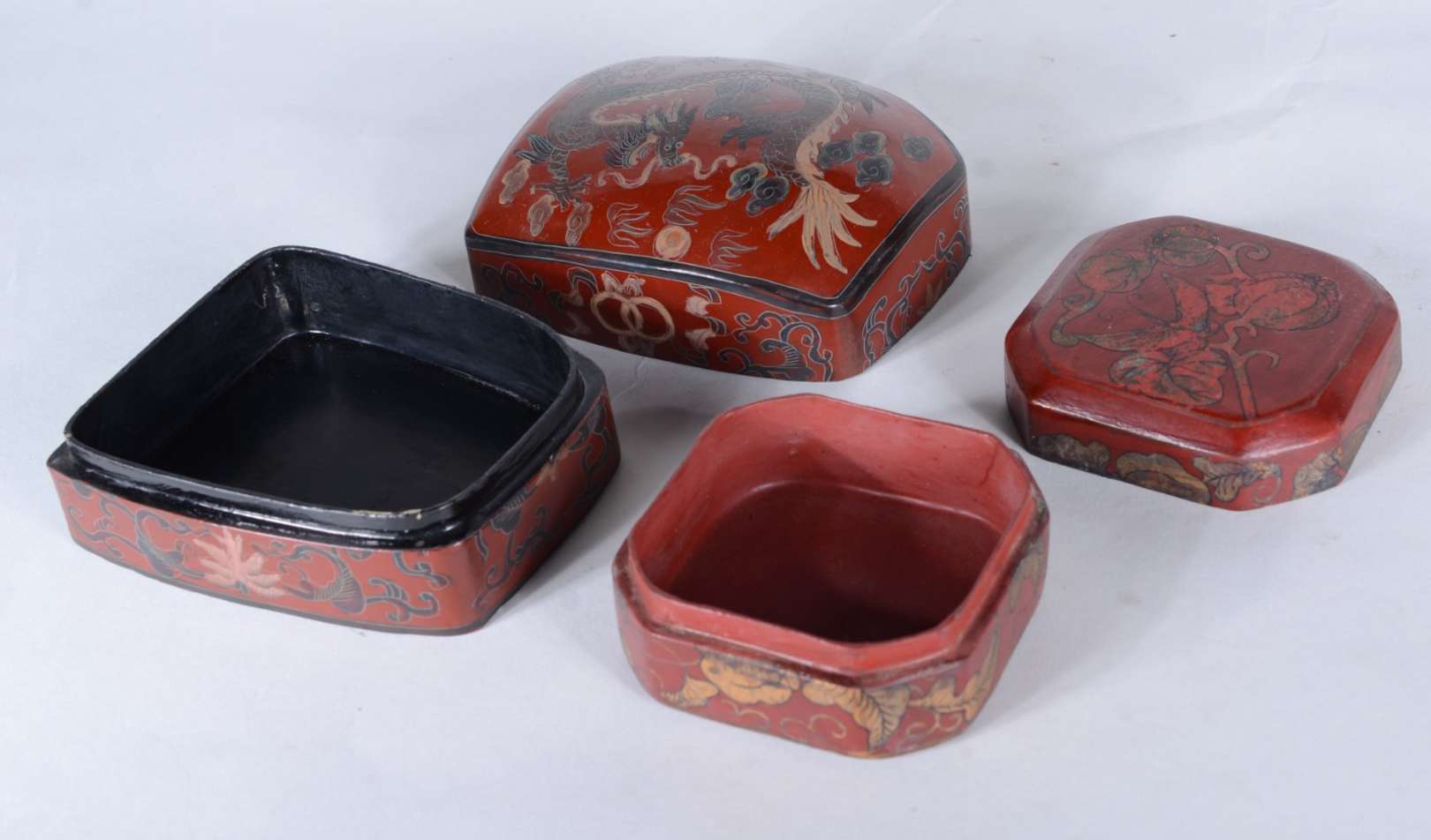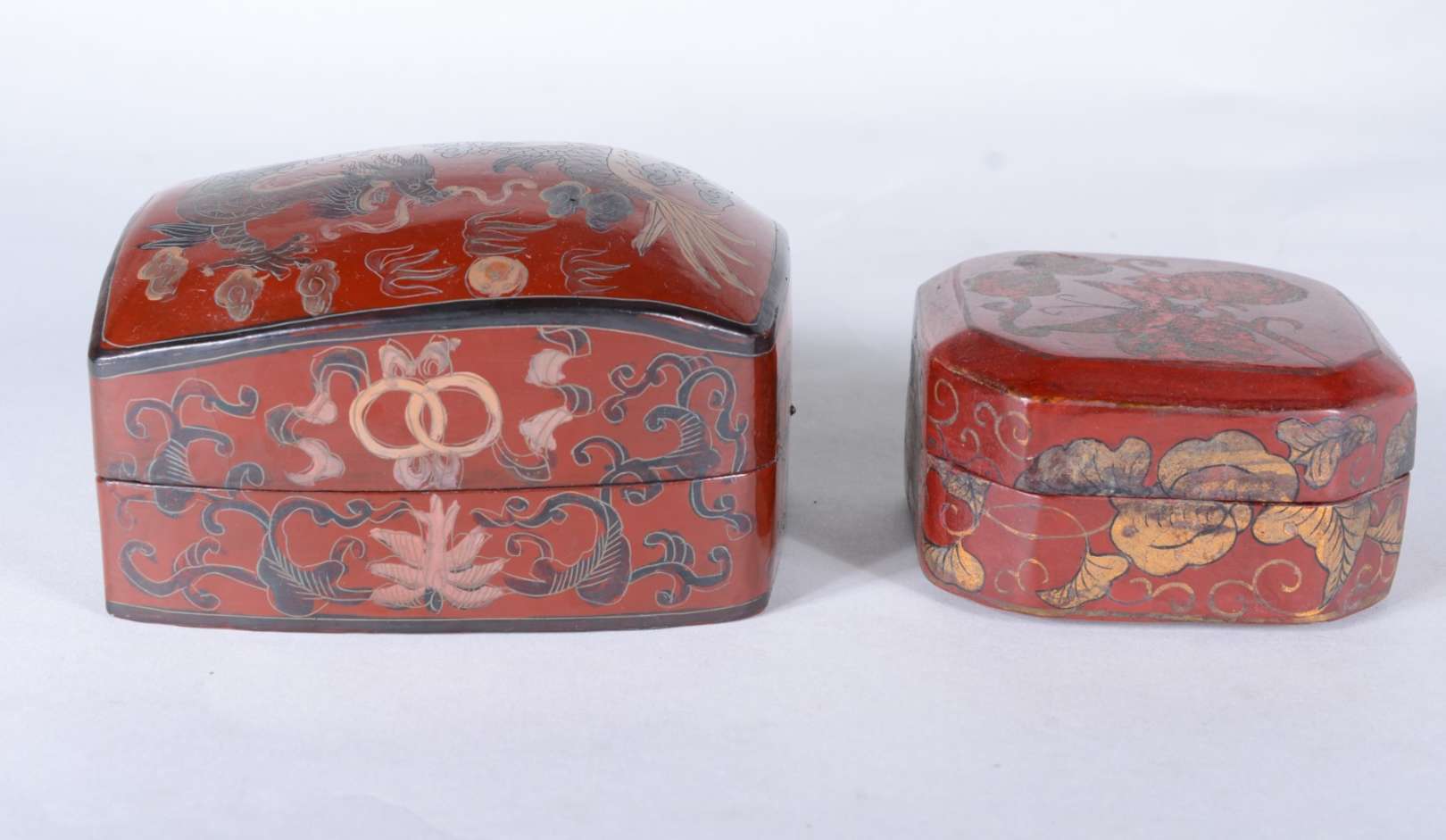 Duas caixas de lacca chinesa decoradas com frutos e dragão em policromia.