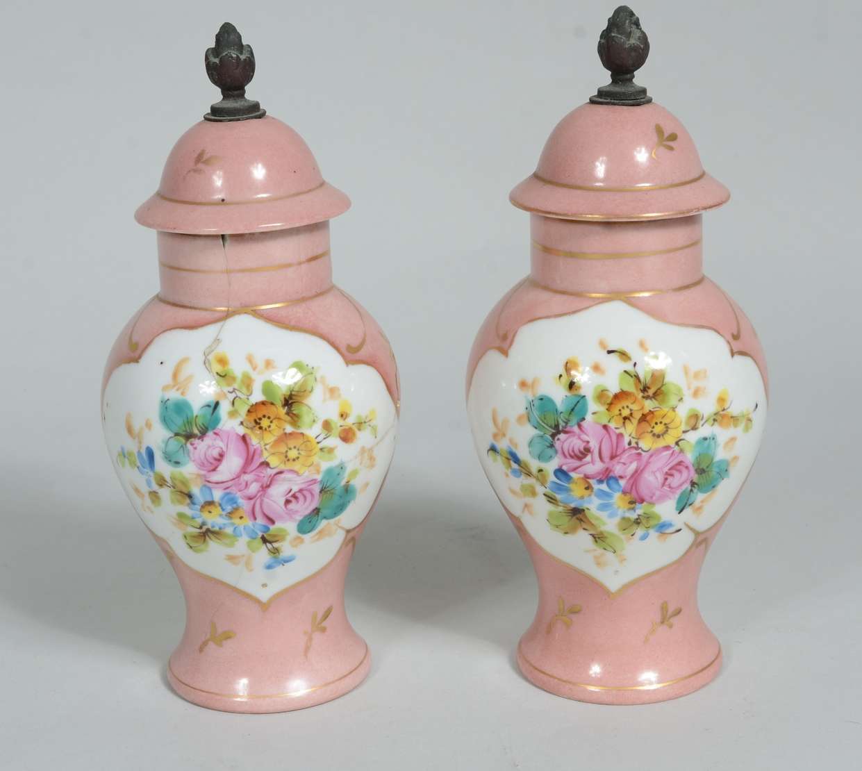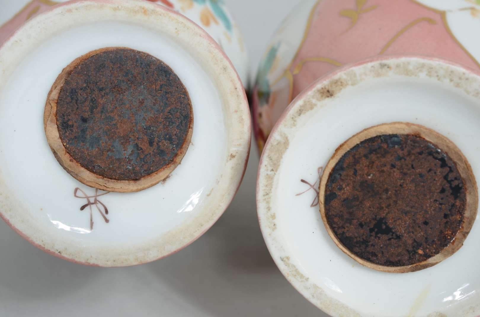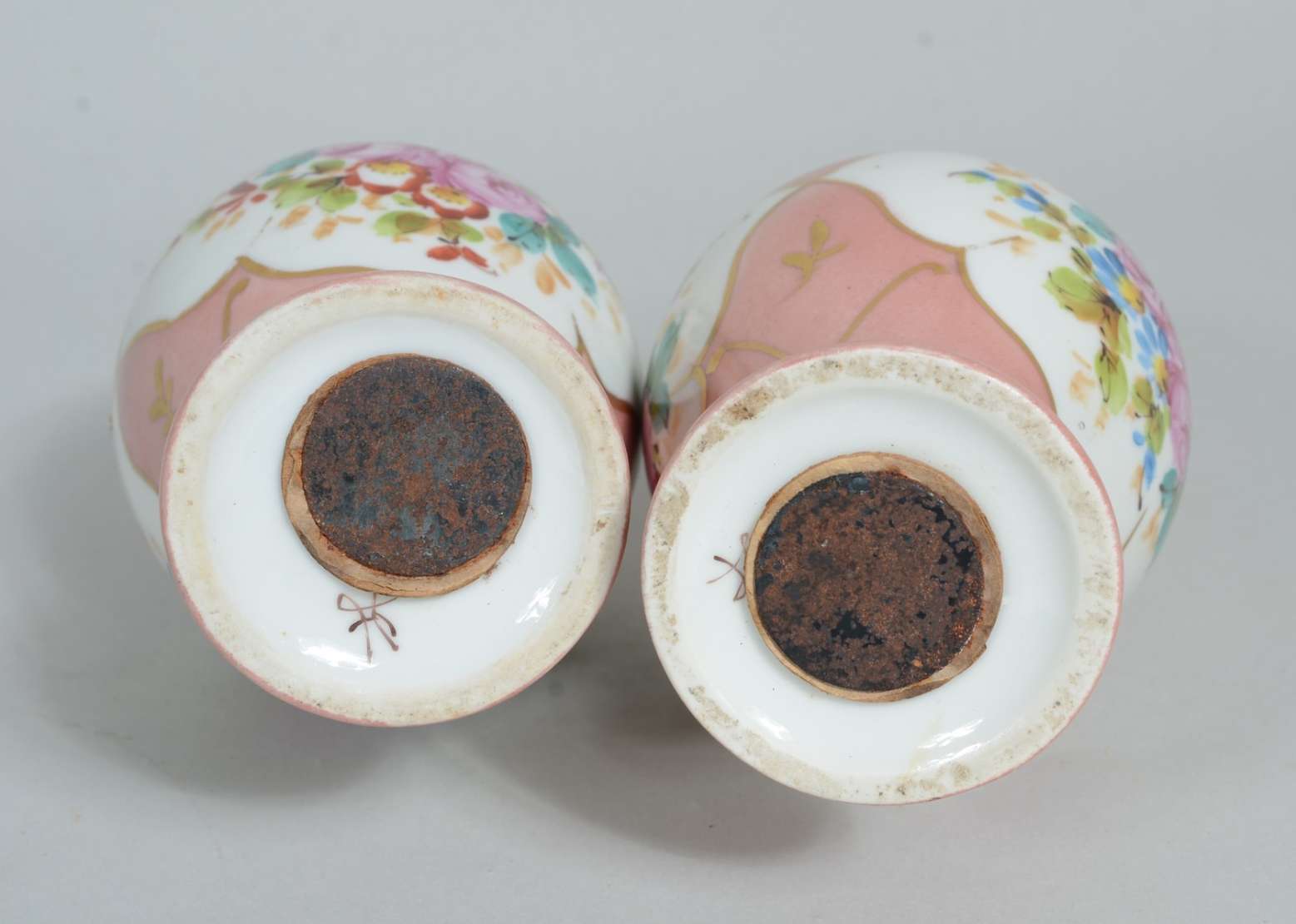 Par de vasos de porcelana francesa Velho Paris, decorados com aves e flores em policromia com realces dourados, fundo...