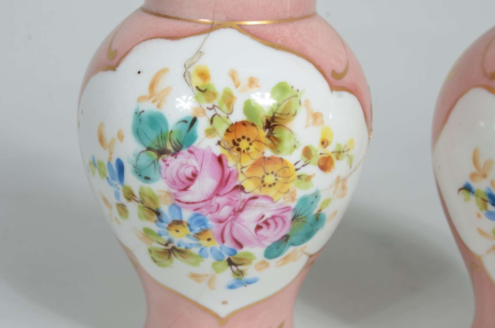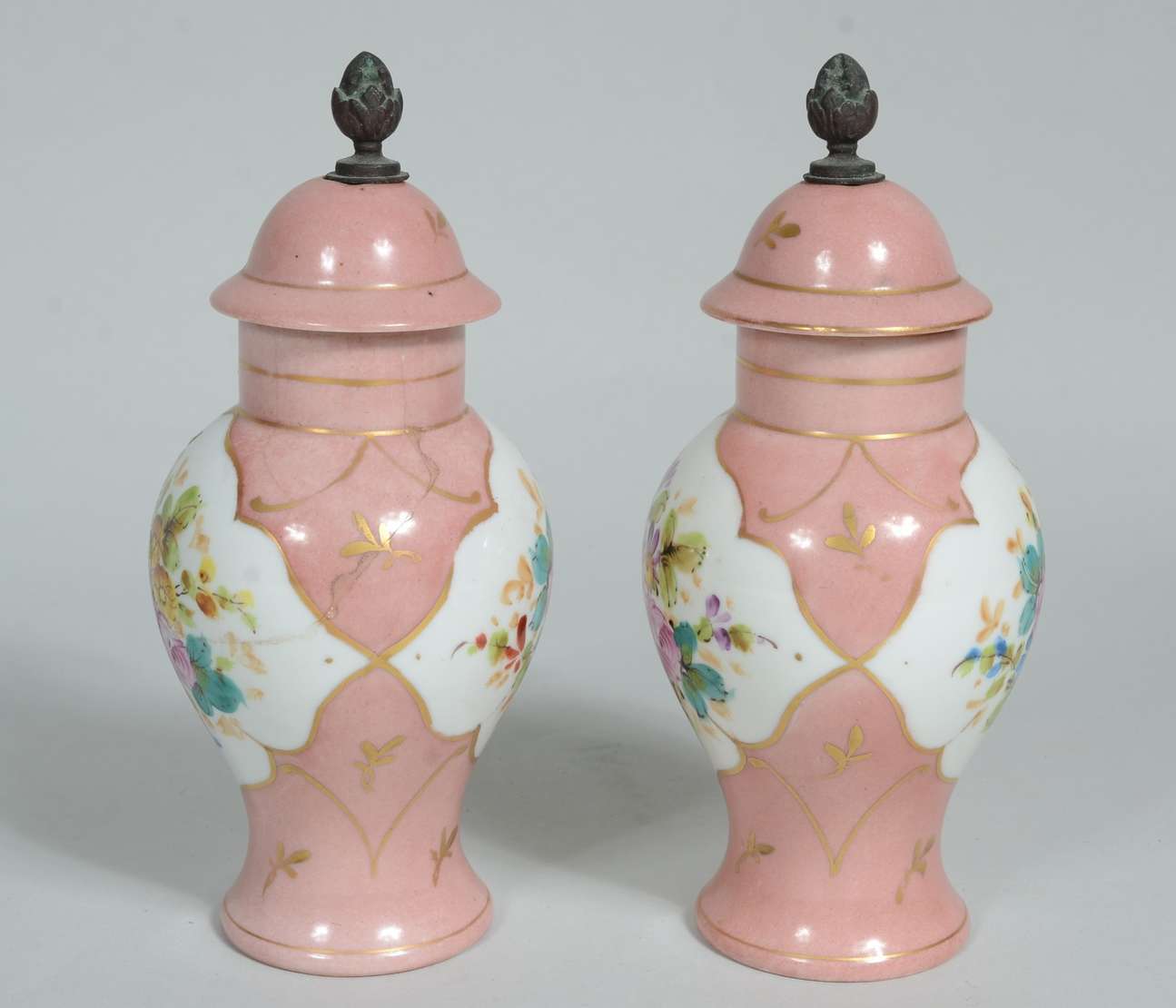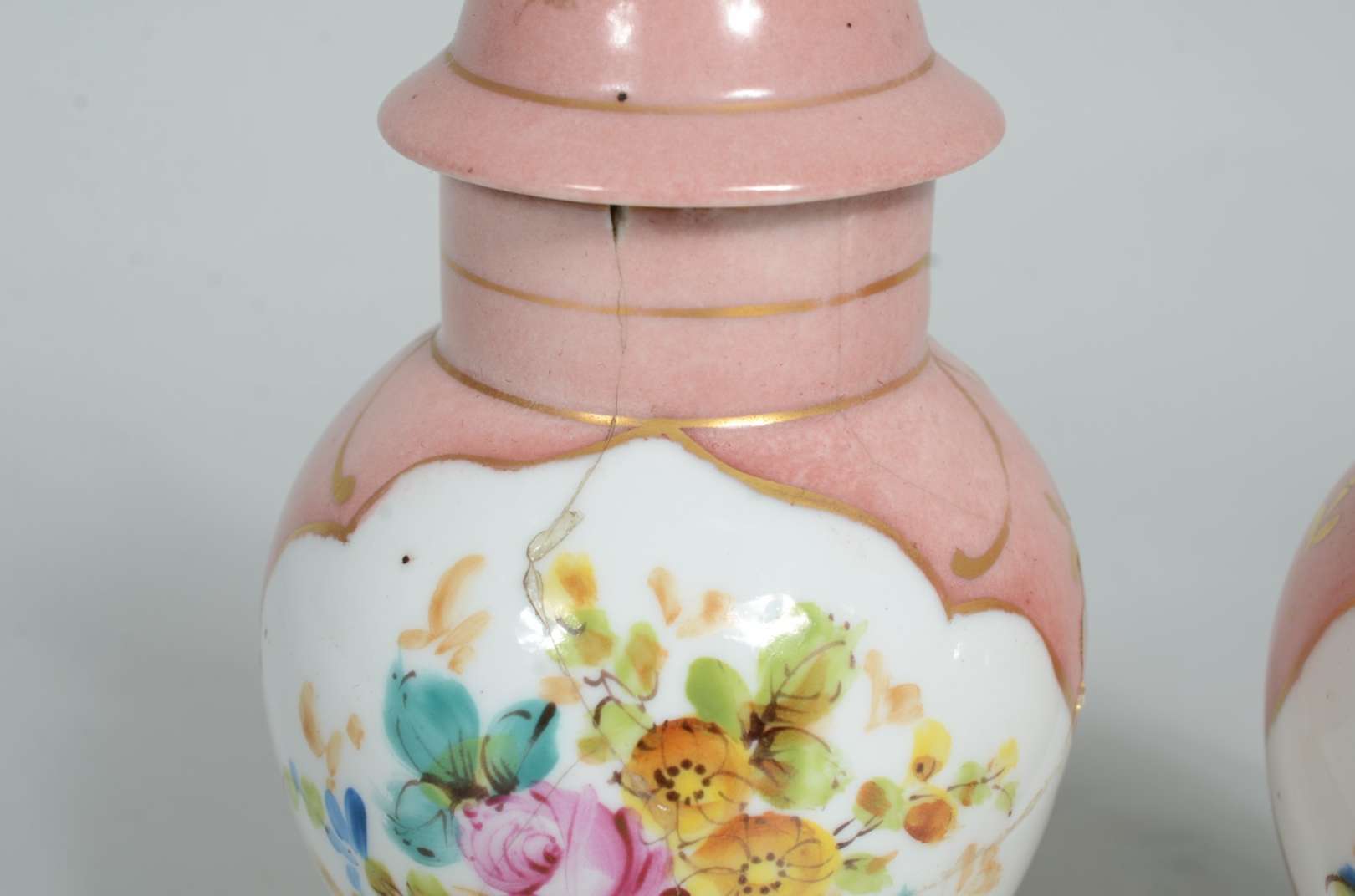 Par de vasos de porcelana francesa Velho Paris, decorados com aves e flores em policromia com realces dourados, fundo...