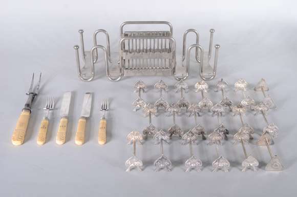 Diversas peças de metal prateado, sendo: porta talheres, 19 descansos para talheres e 5 talheres diversos com cabos n...