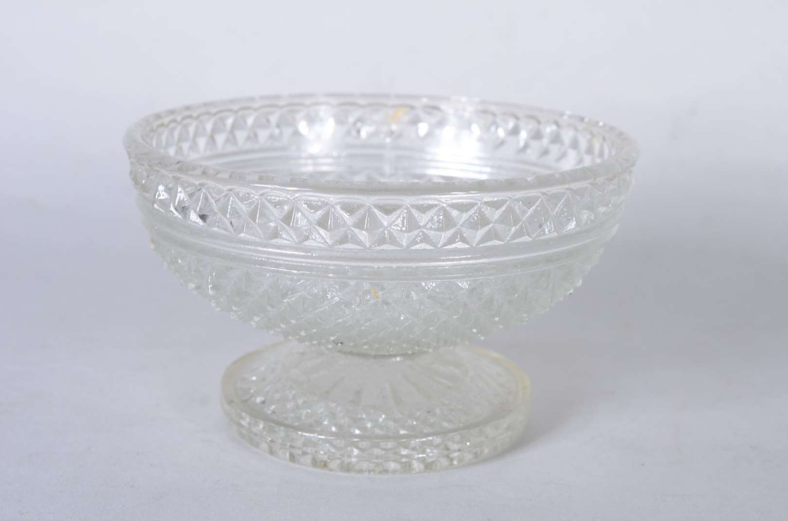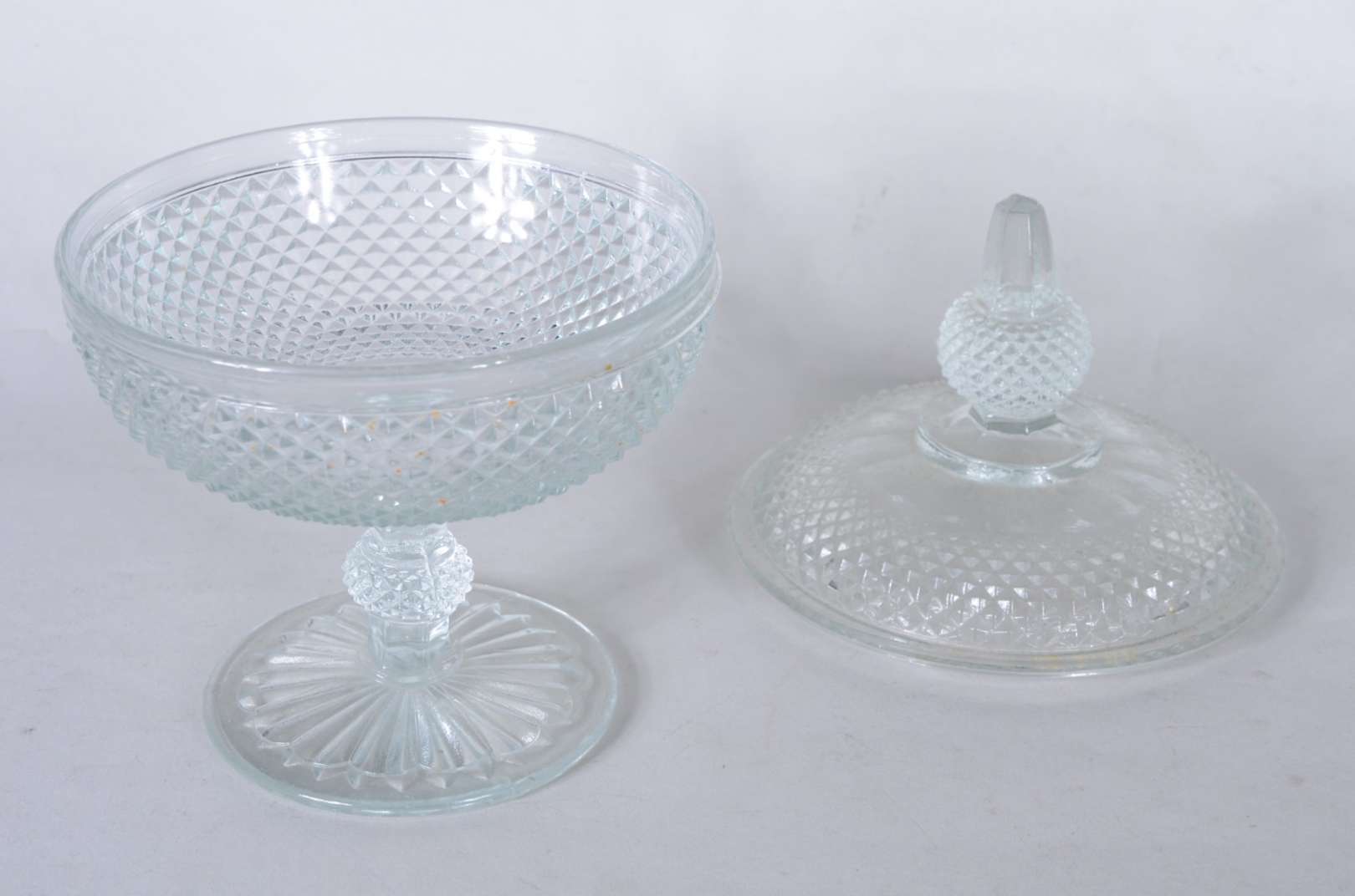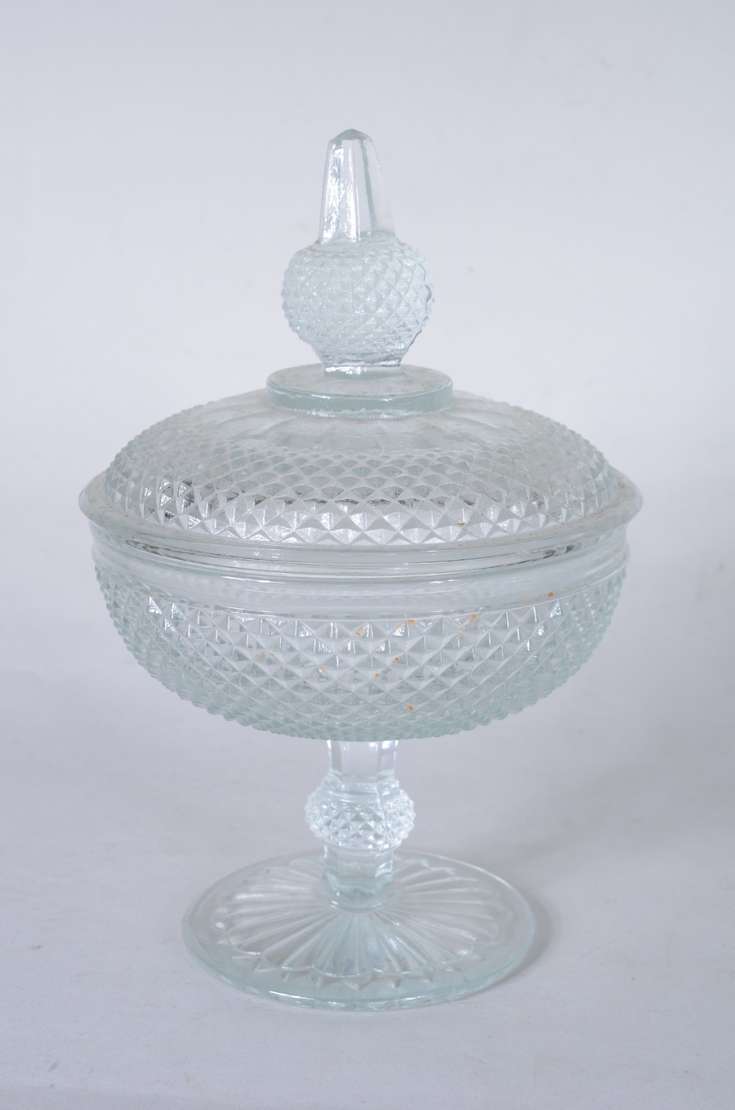 Fruteira de cristal verde francês estilo Art Deco com desenhos geométricos foscos.
