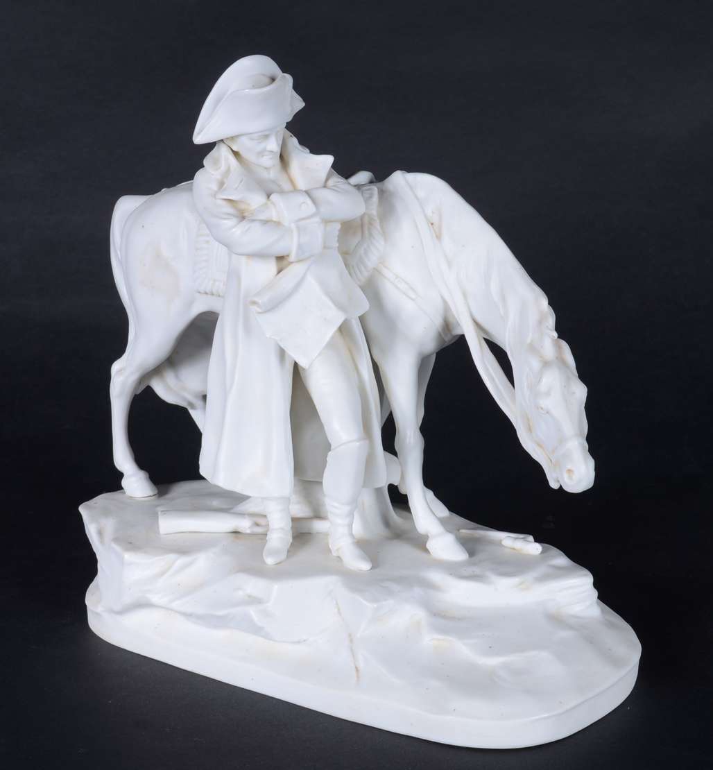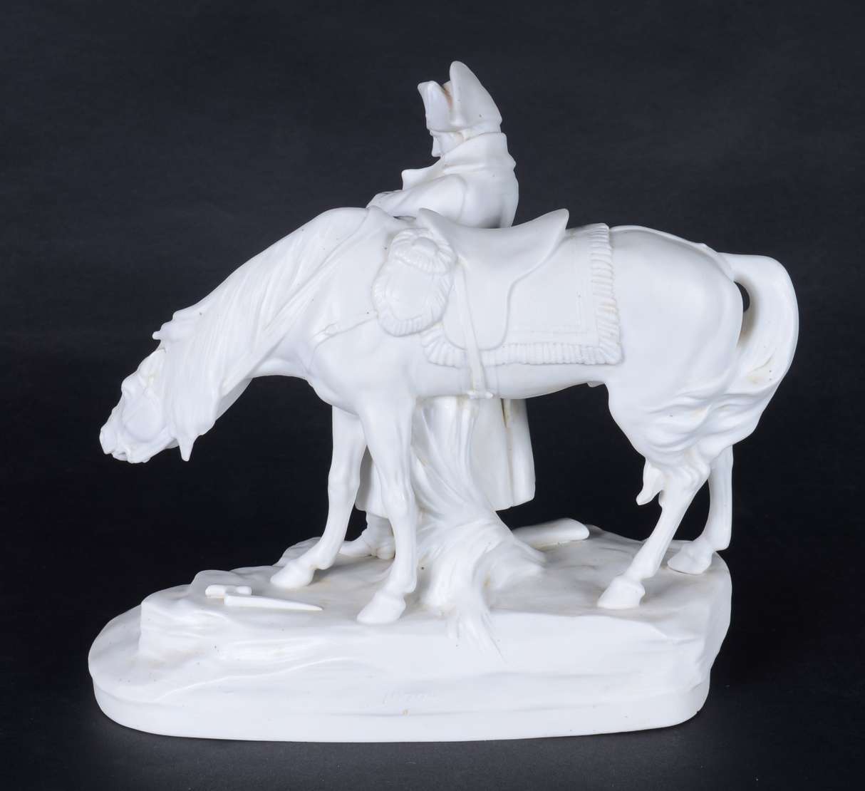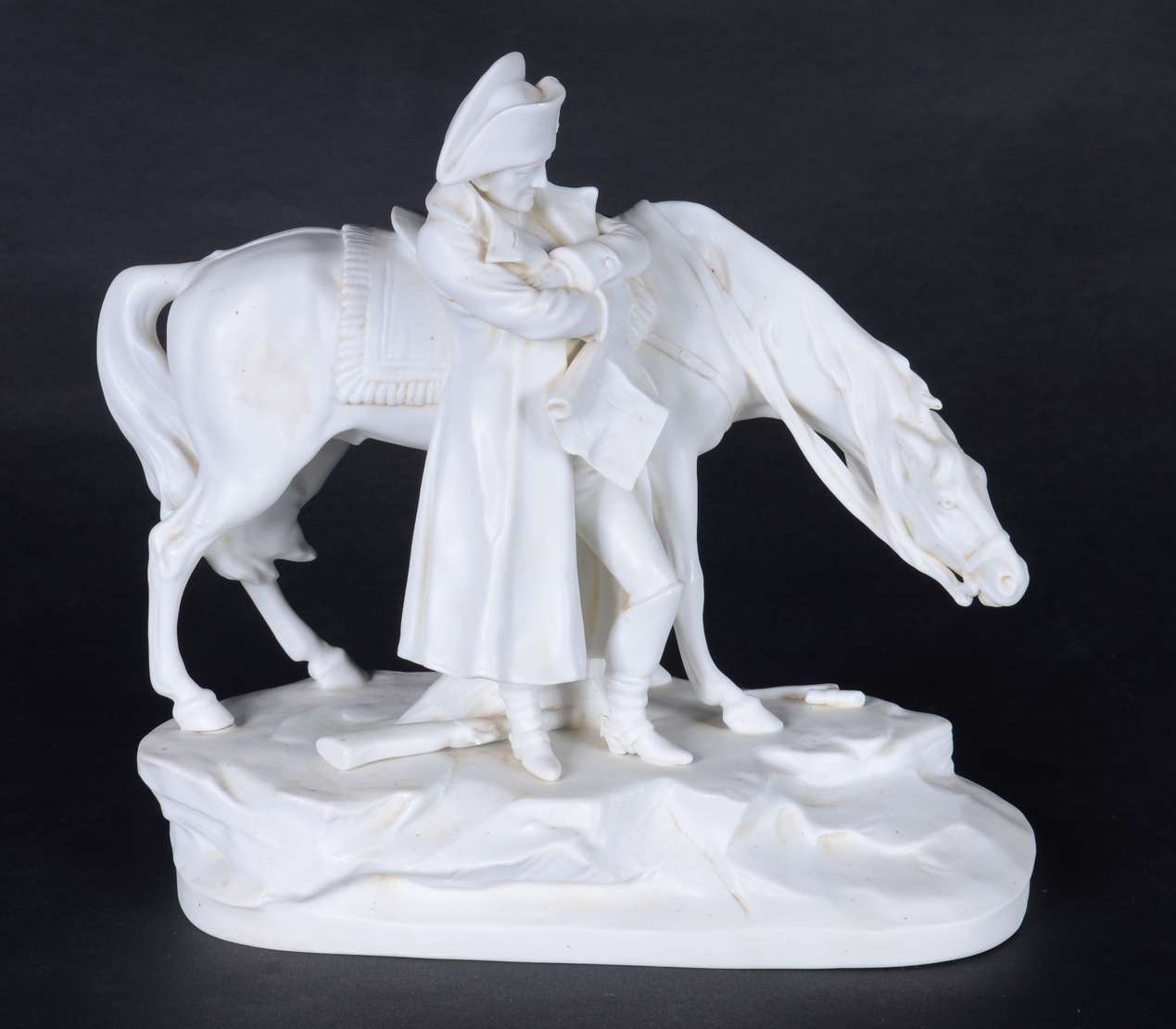 Grupo escultórico de biscuit representando Napoleão ao lado do cavalo.