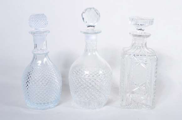 Duas garrafas, sendo uma facetada na cor rubi com guirlandas douradas e outra de cristal doublé azul lapidada (esta ú...