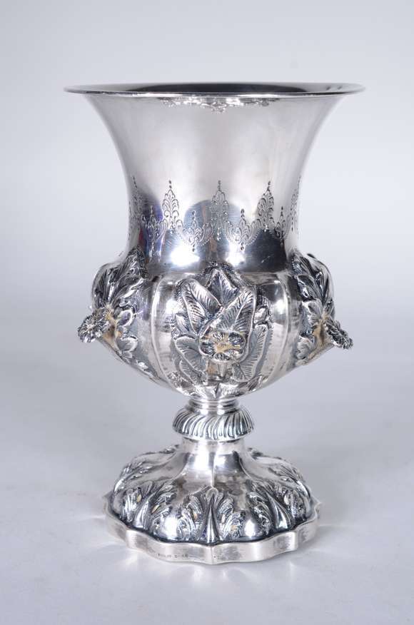 Vaso de prata contraste 833 mls decorado com folhagens em relevo e base recortada. Peso da prata: 435 g. (Por motivo...
