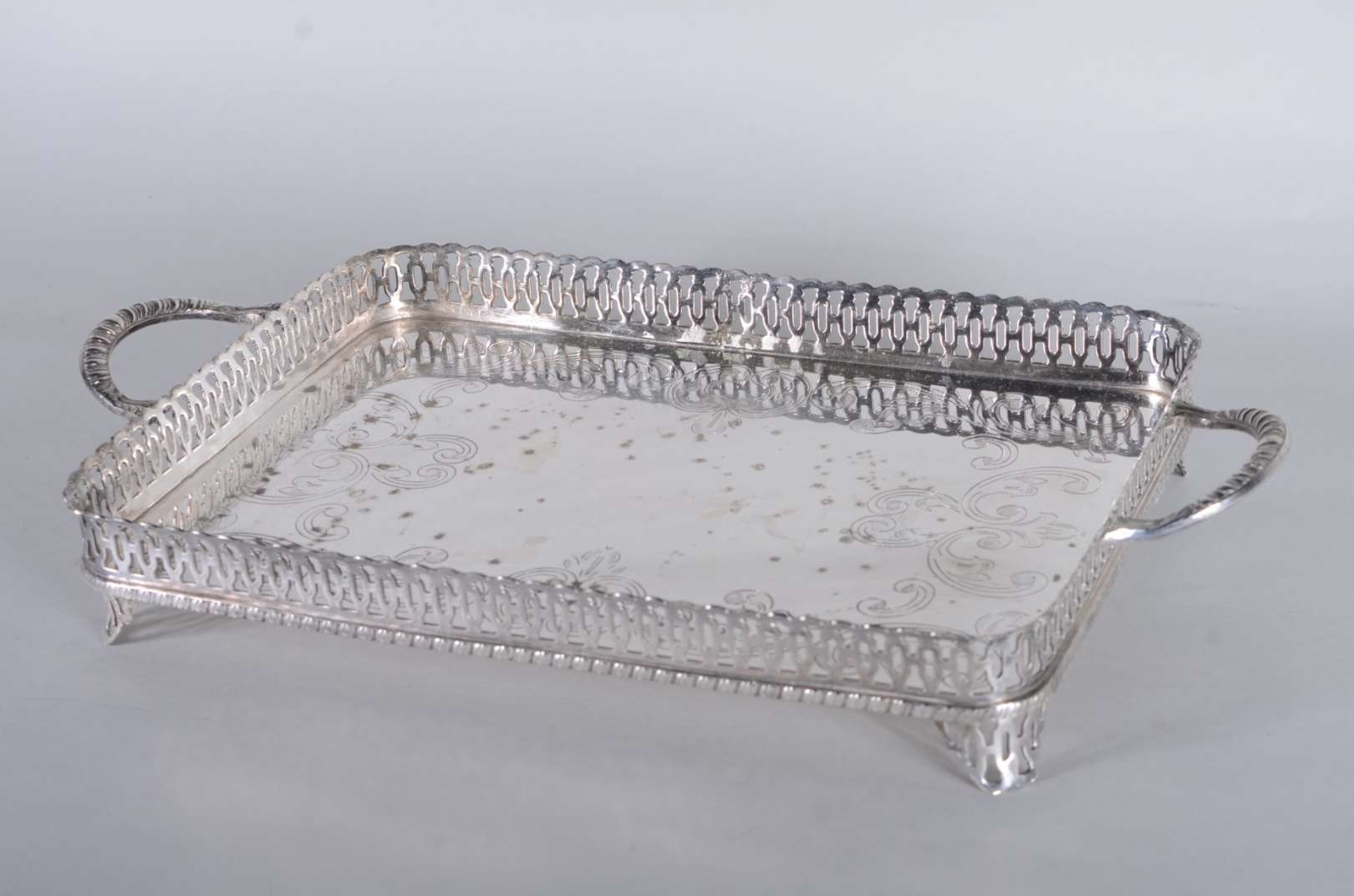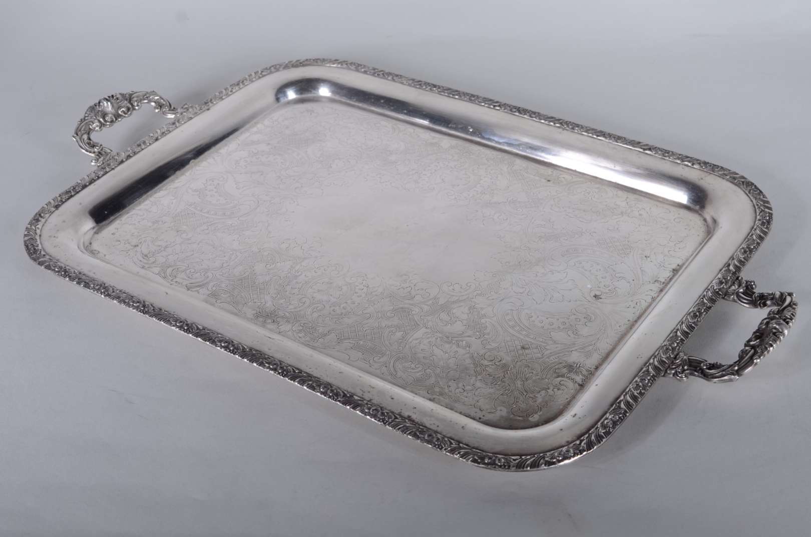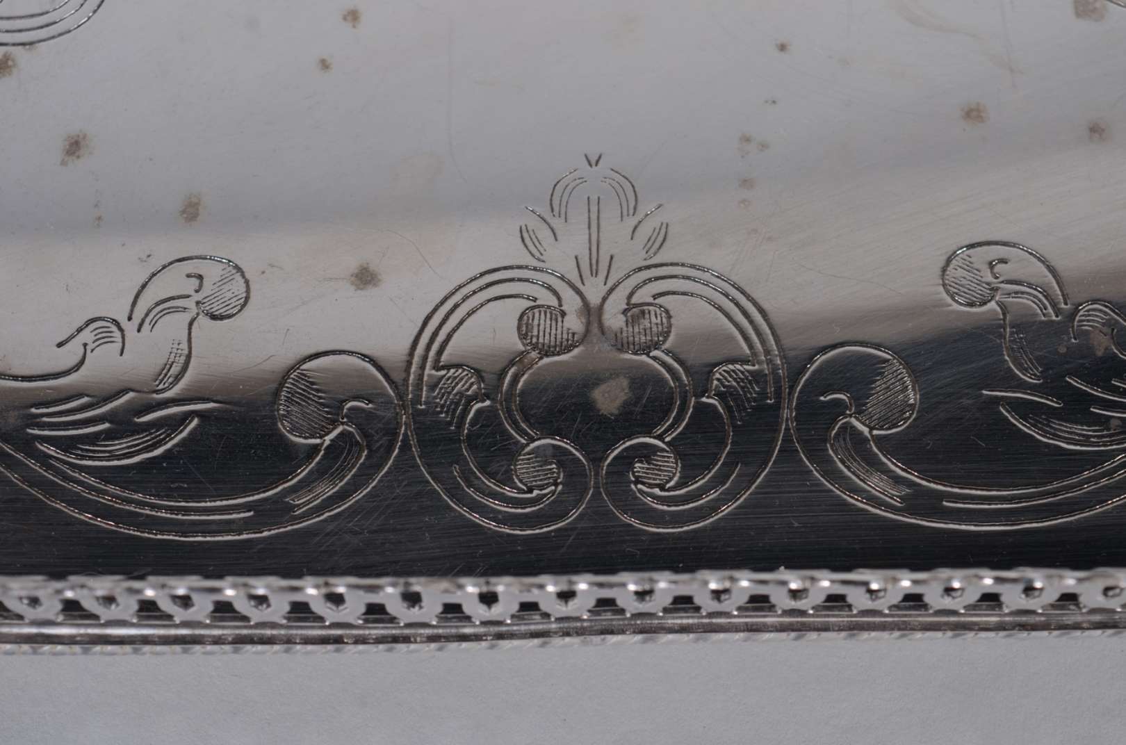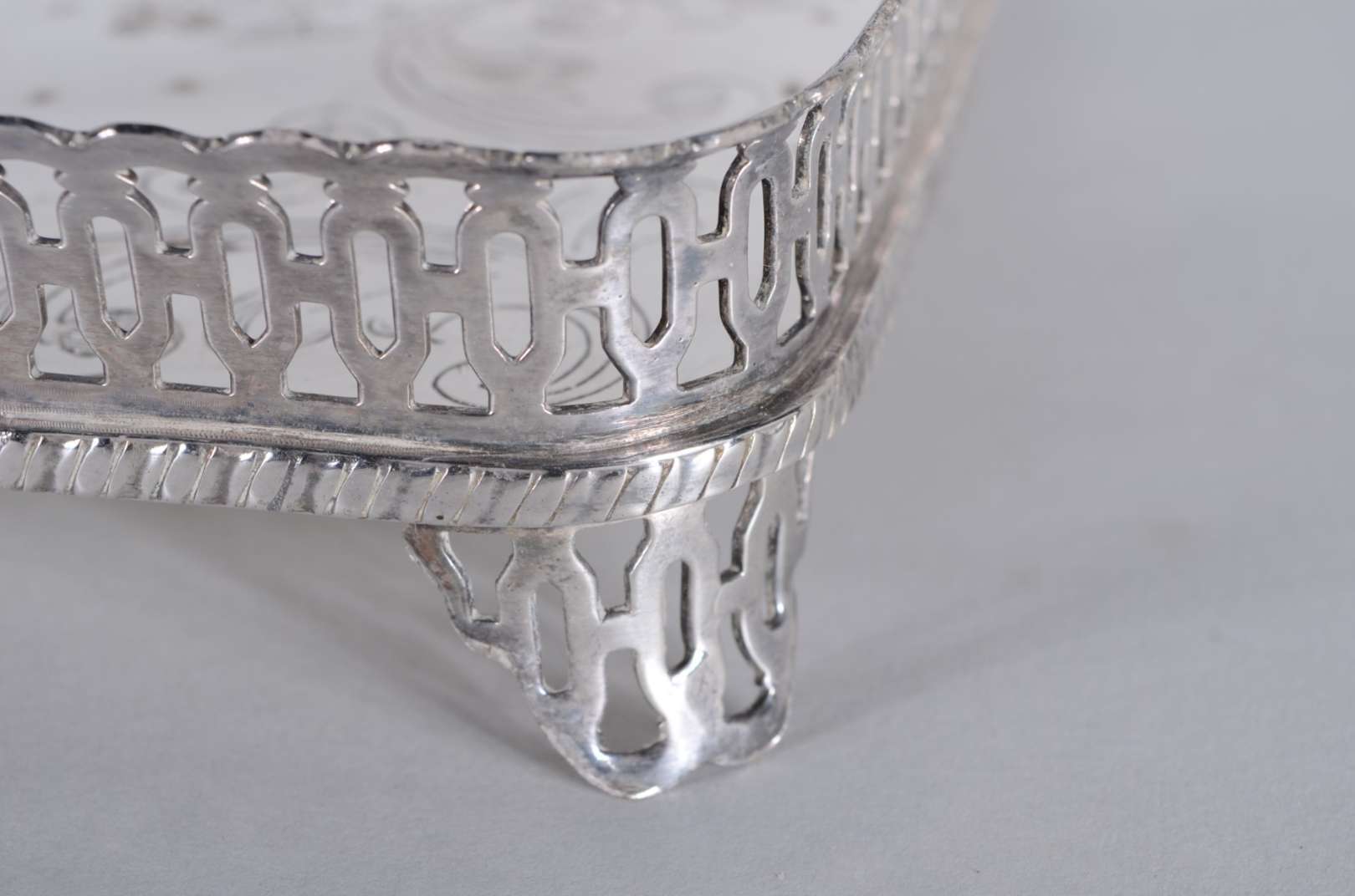 Salva de prata baixa contrastada, pés de garra, fundo cinzelado e galeria vazada. Peso da prata: 670 g. (Por motivos...