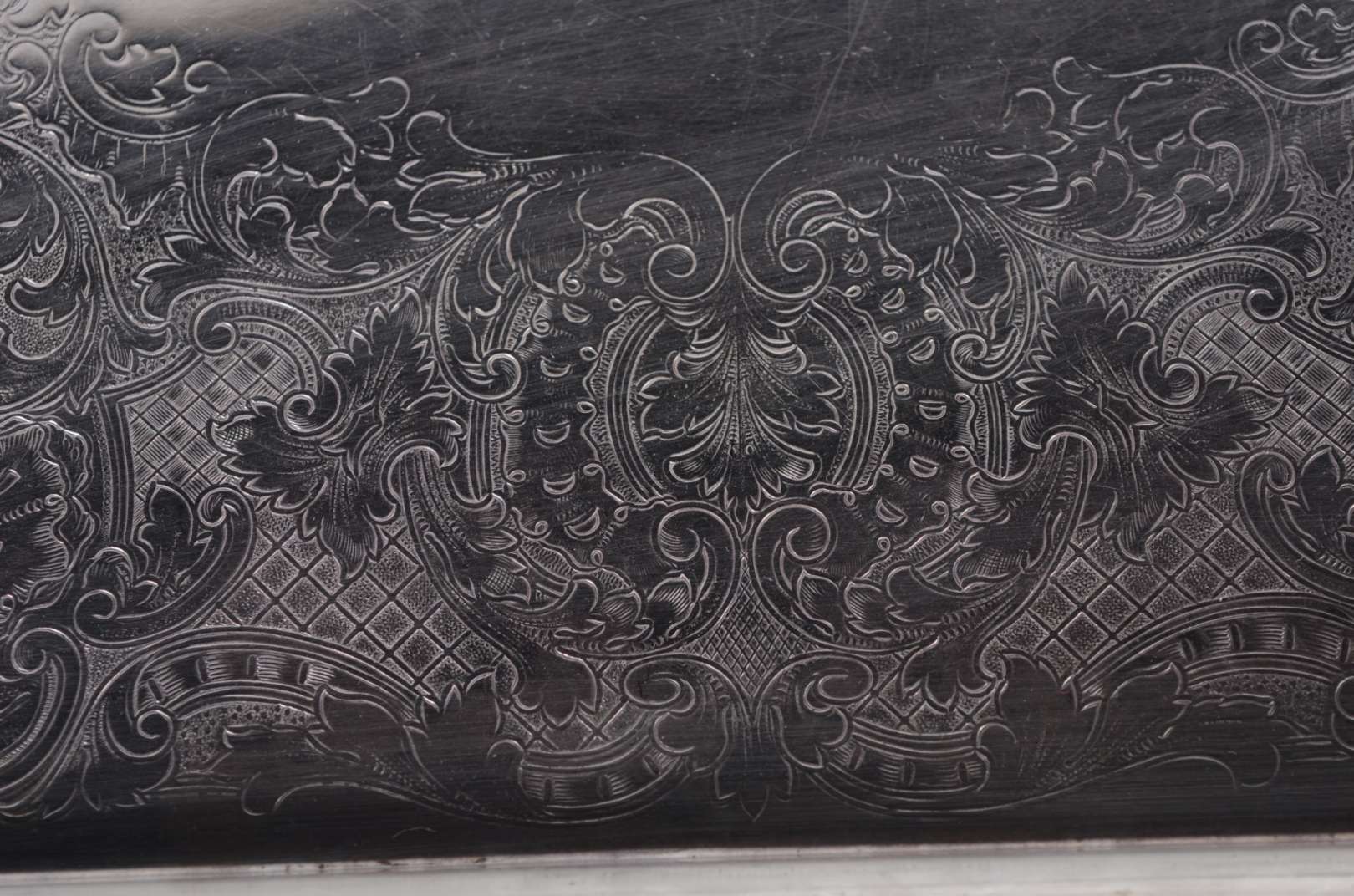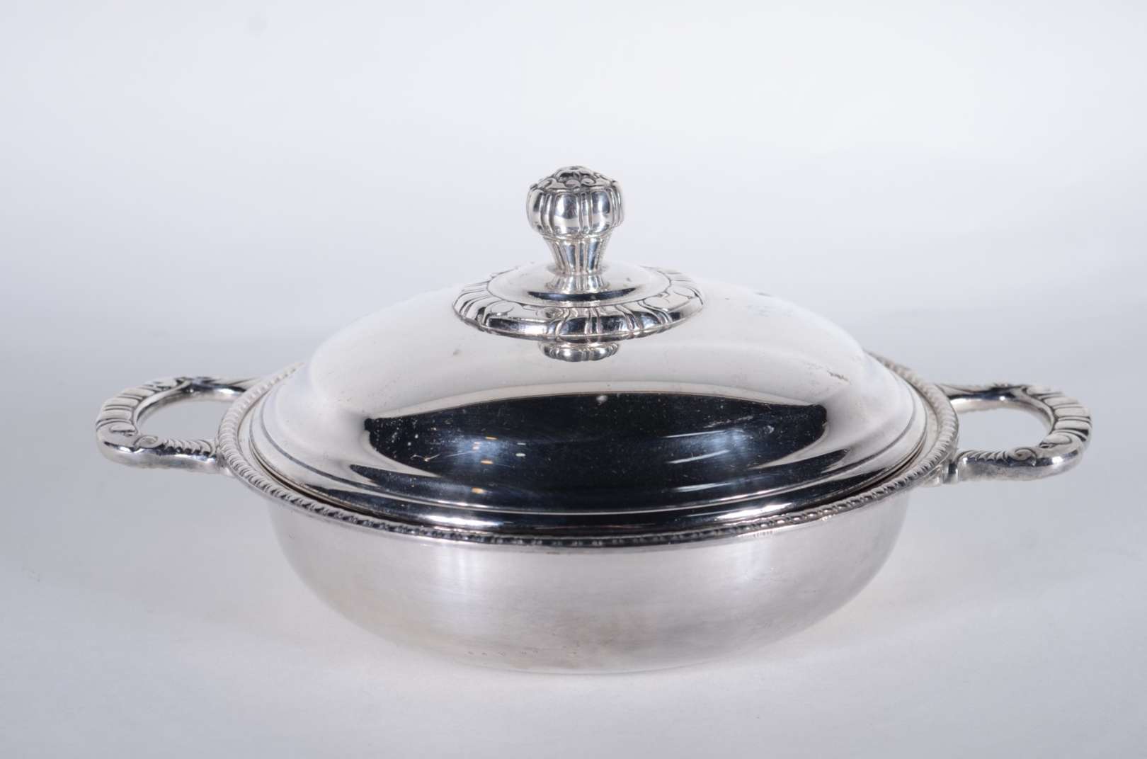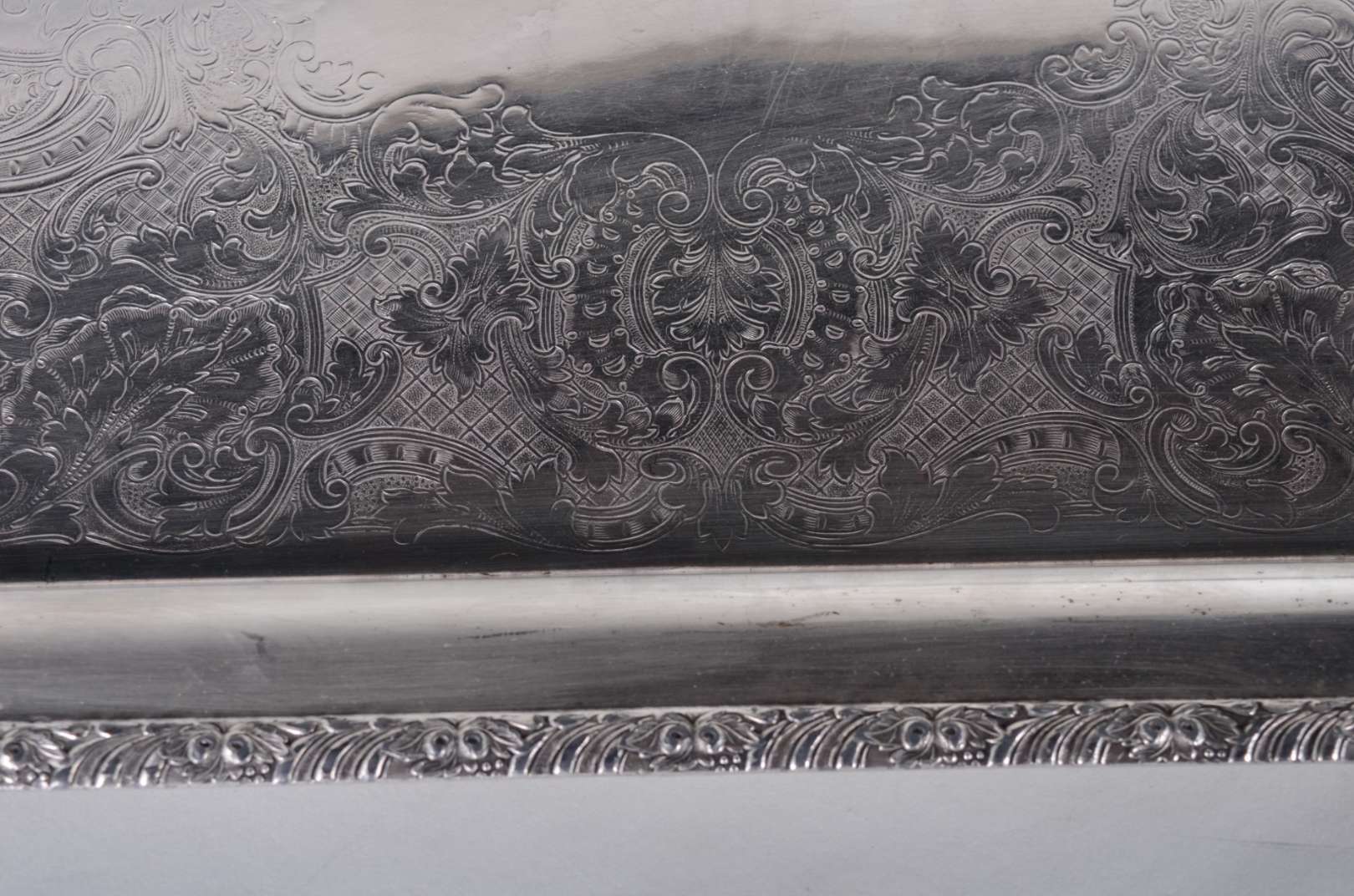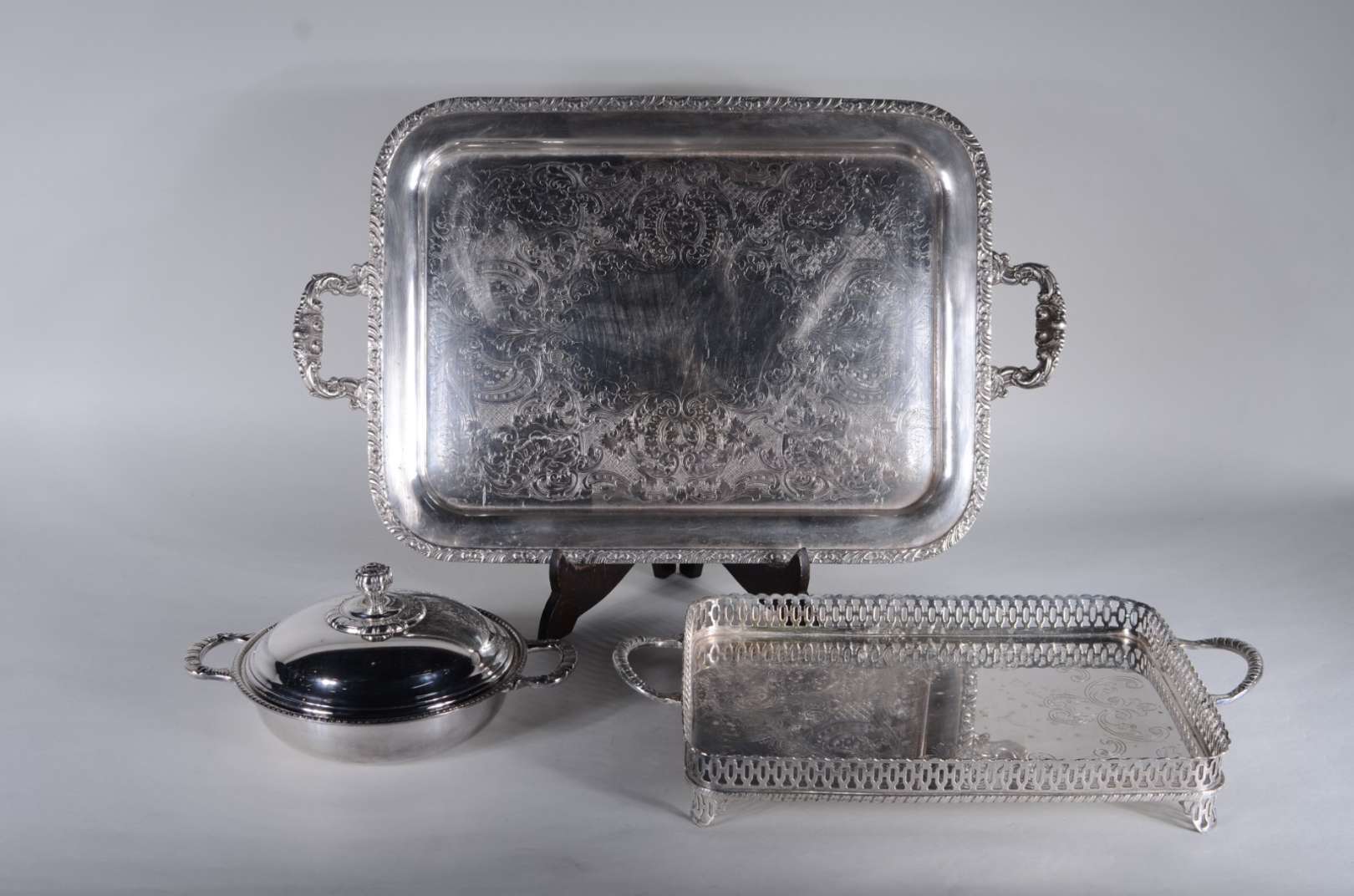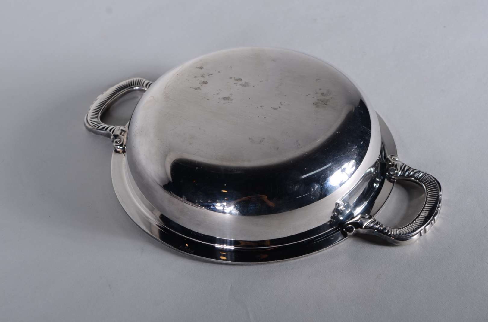 Salva de prata baixa contrastada, pés de garra, fundo cinzelado e galeria vazada. Peso da prata: 670 g. (Por motivos...