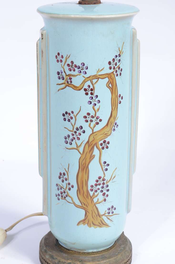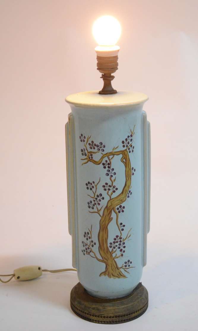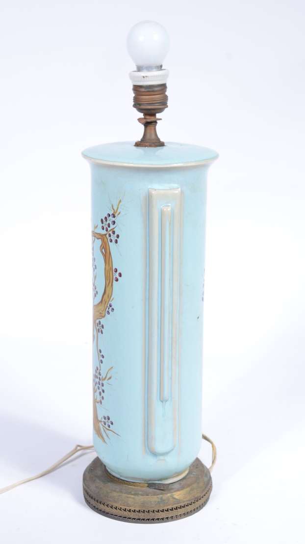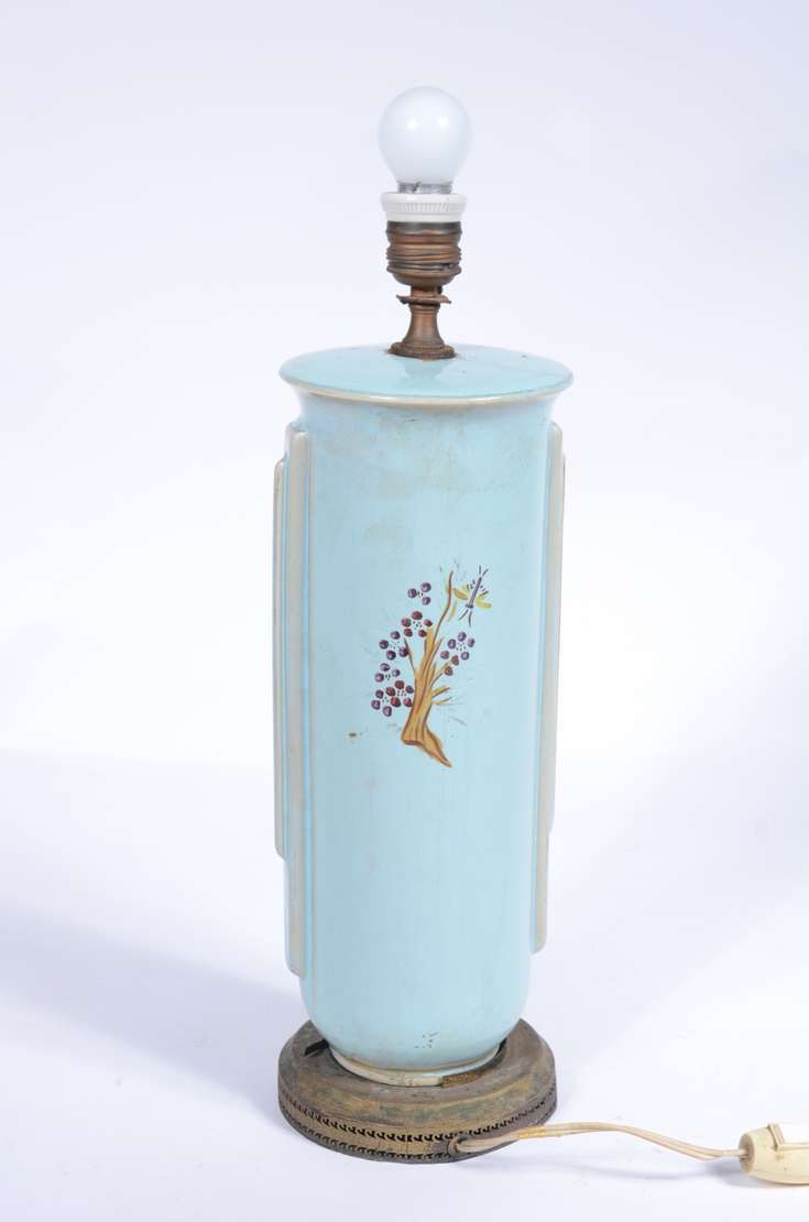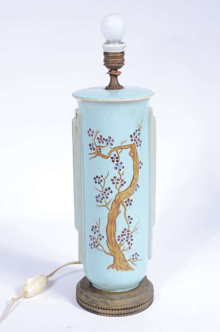 Abatjour de porcelana na forma de potiche, decorado com flores em policromia sobre fundo preto, base de madeira.