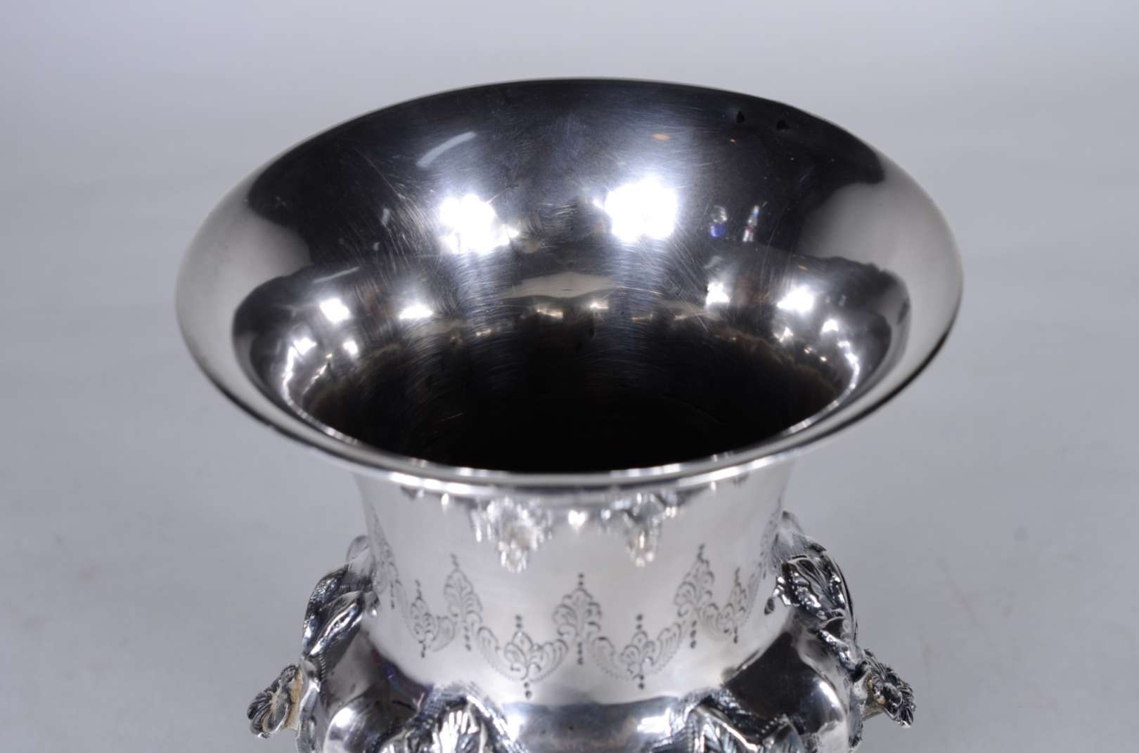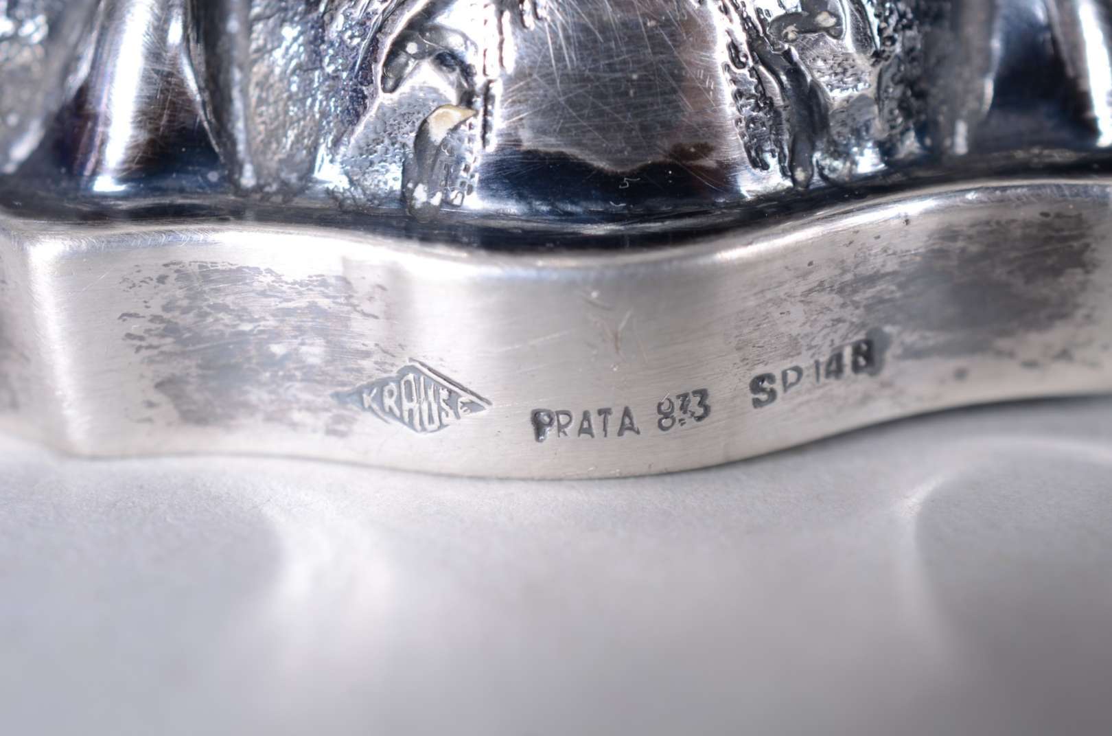 Salva de prata baixa contrastada, pés de garra, fundo cinzelado e galeria vazada. Peso da prata: 670 g. (Por motivos...