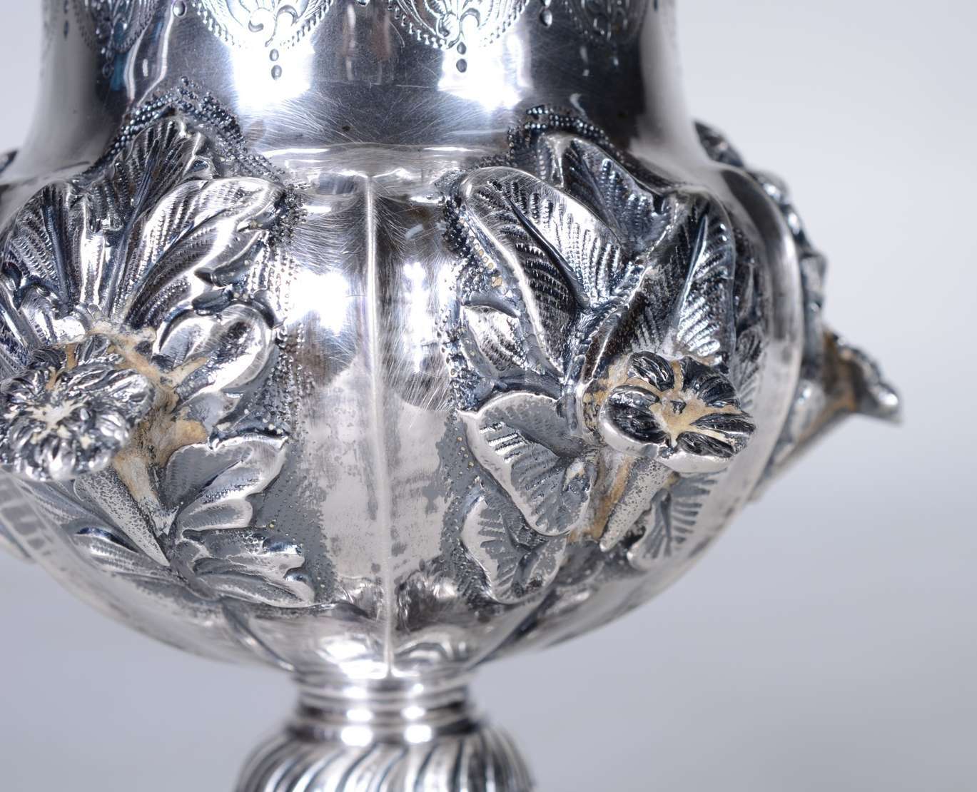 Belo serviço para chá e café em prata inglesa repuxada e cinzelada, ornado em leve relevo com perolados, volutas, med...