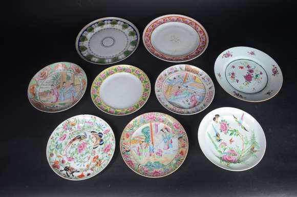 Nove pratos de porcelana oriental, diversas decorações. Com restauro.