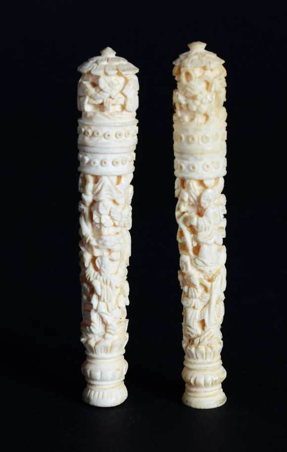 Dois porta termômetros de marfim esculpido.