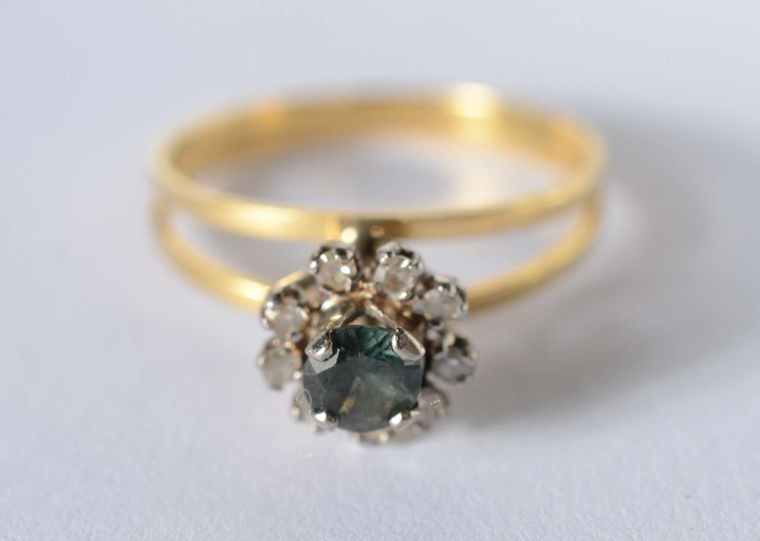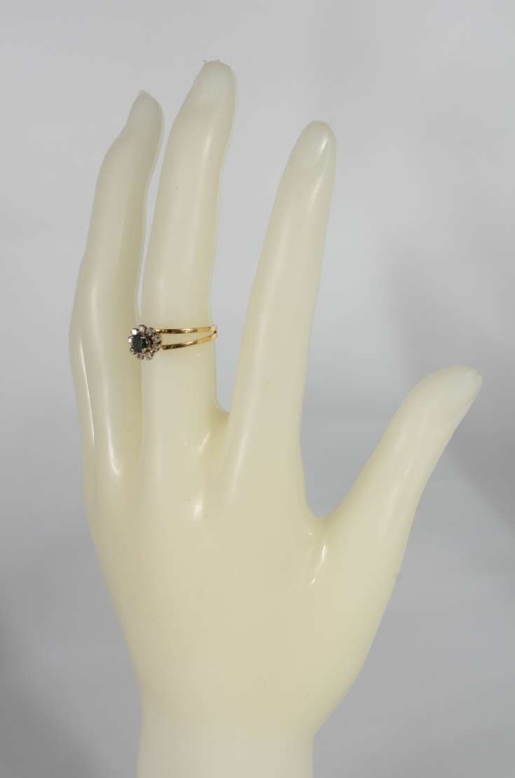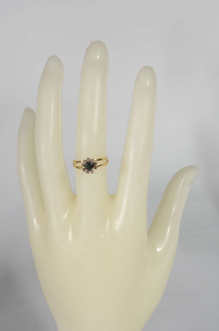 Anel de ouro 18 k., na forma de ramo cravejado com brilhantes e safiras, aro 17. (Por motivos de segurança a peça não...