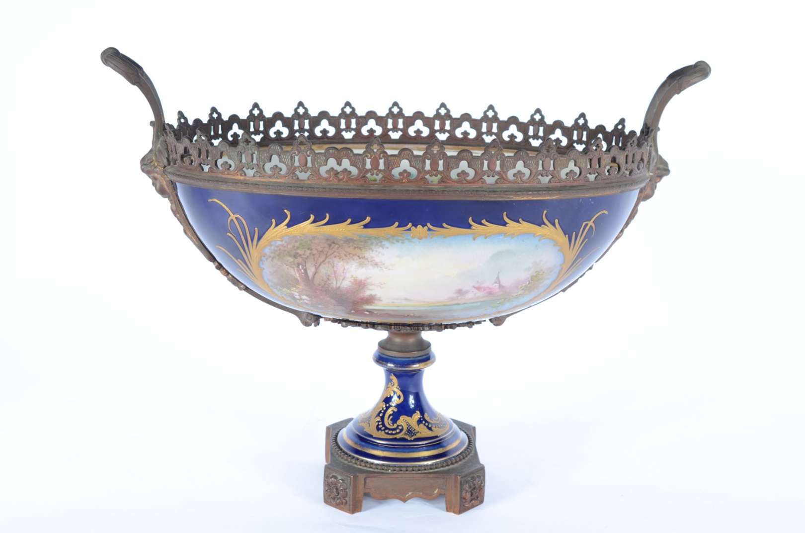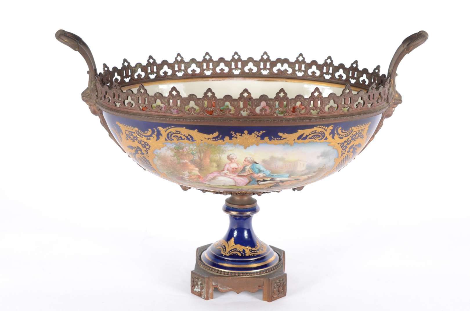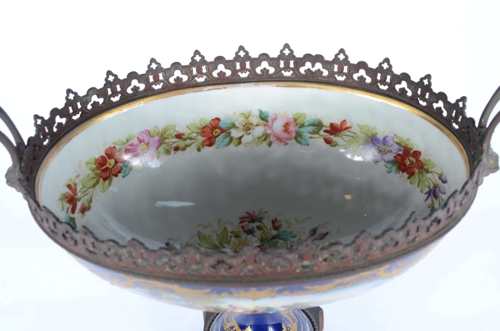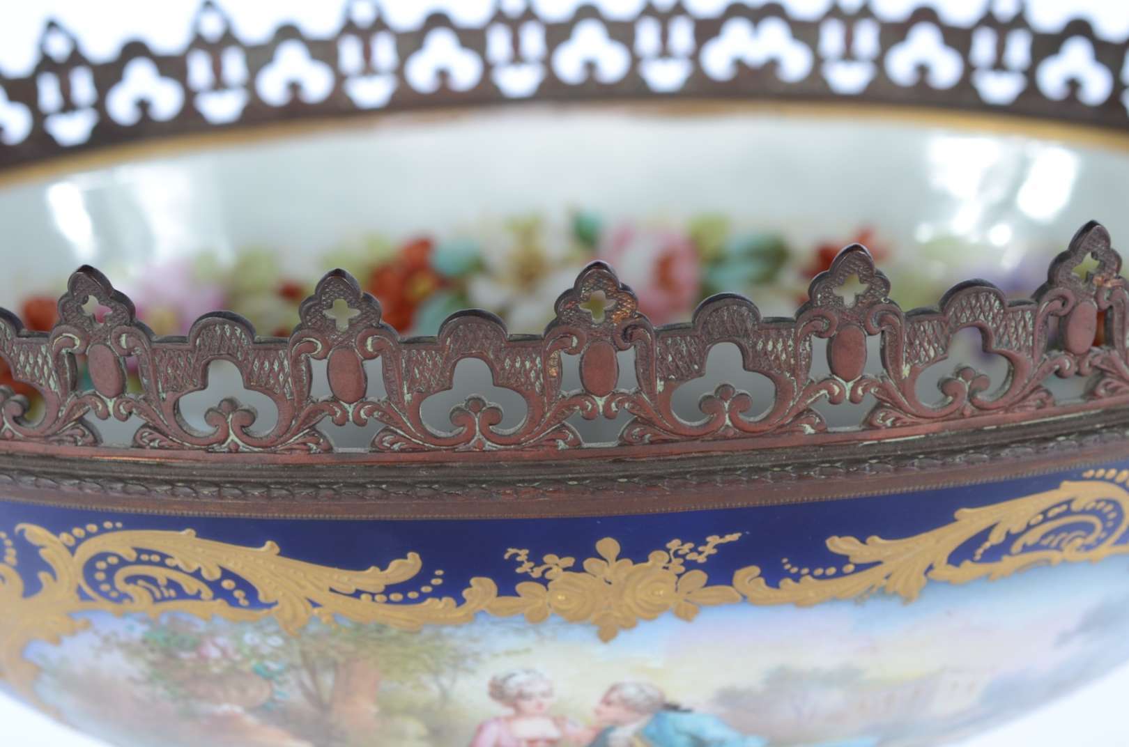 Elegante fruteira de porcelana francesa azul cobalto com cena romântica e paisagem em policromia, realces dourados, parte interna com flores, guarnição de metal dourado.