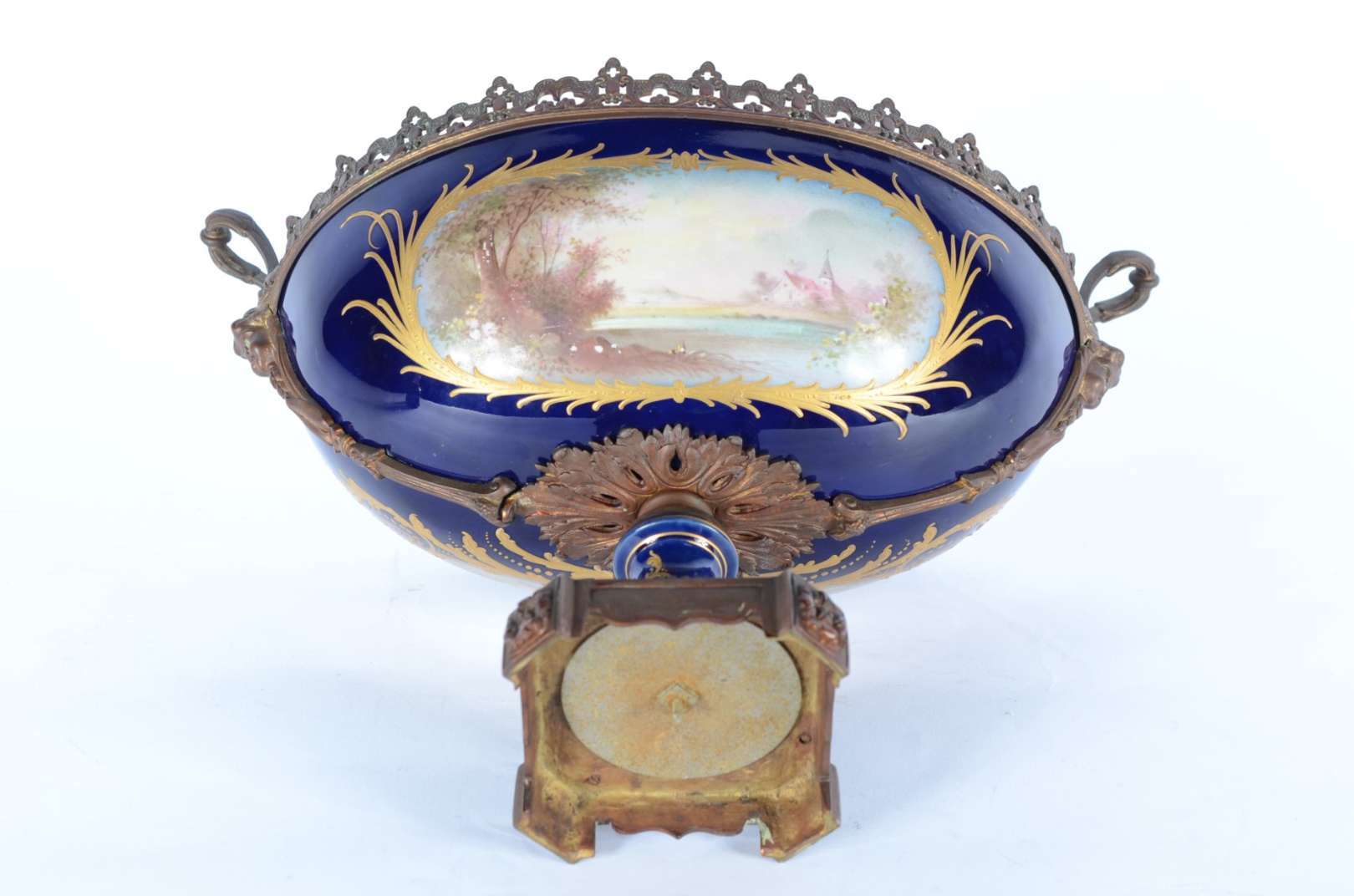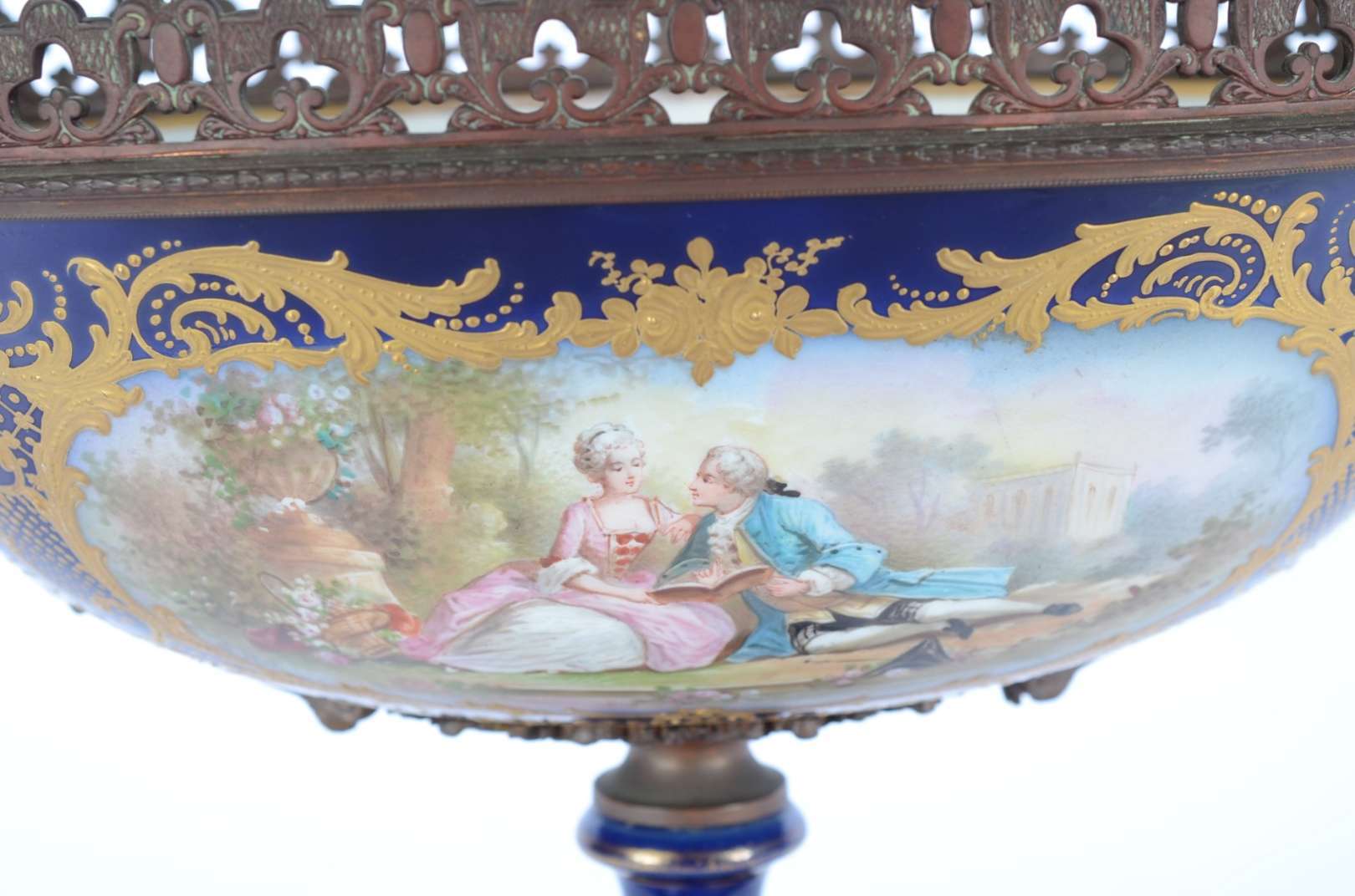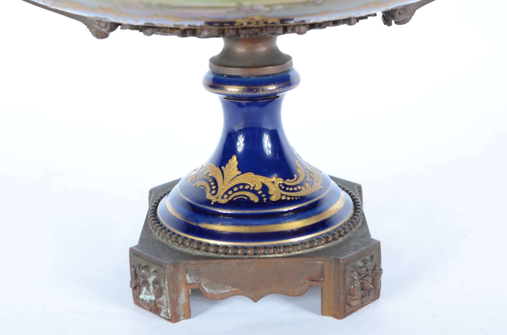 Elegante fruteira de porcelana francesa azul cobalto com cena romântica e paisagem em policromia, realces dourados, parte interna com flores, guarnição de metal dourado.