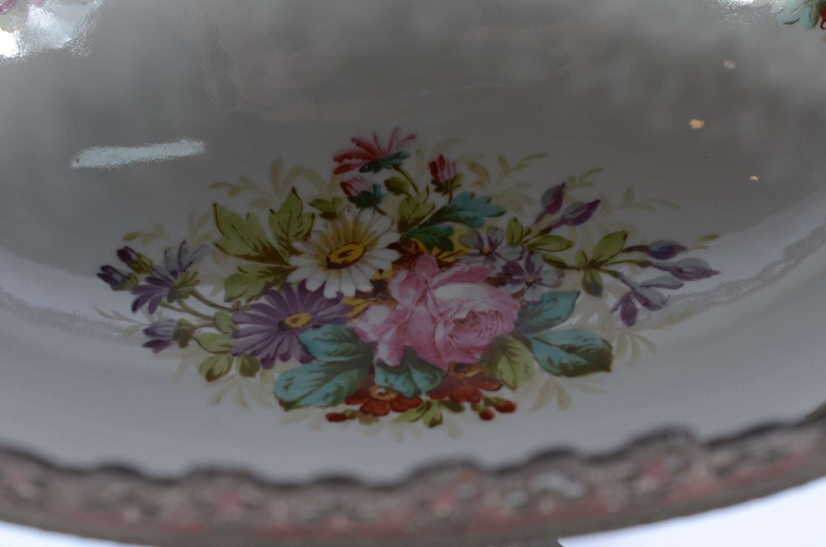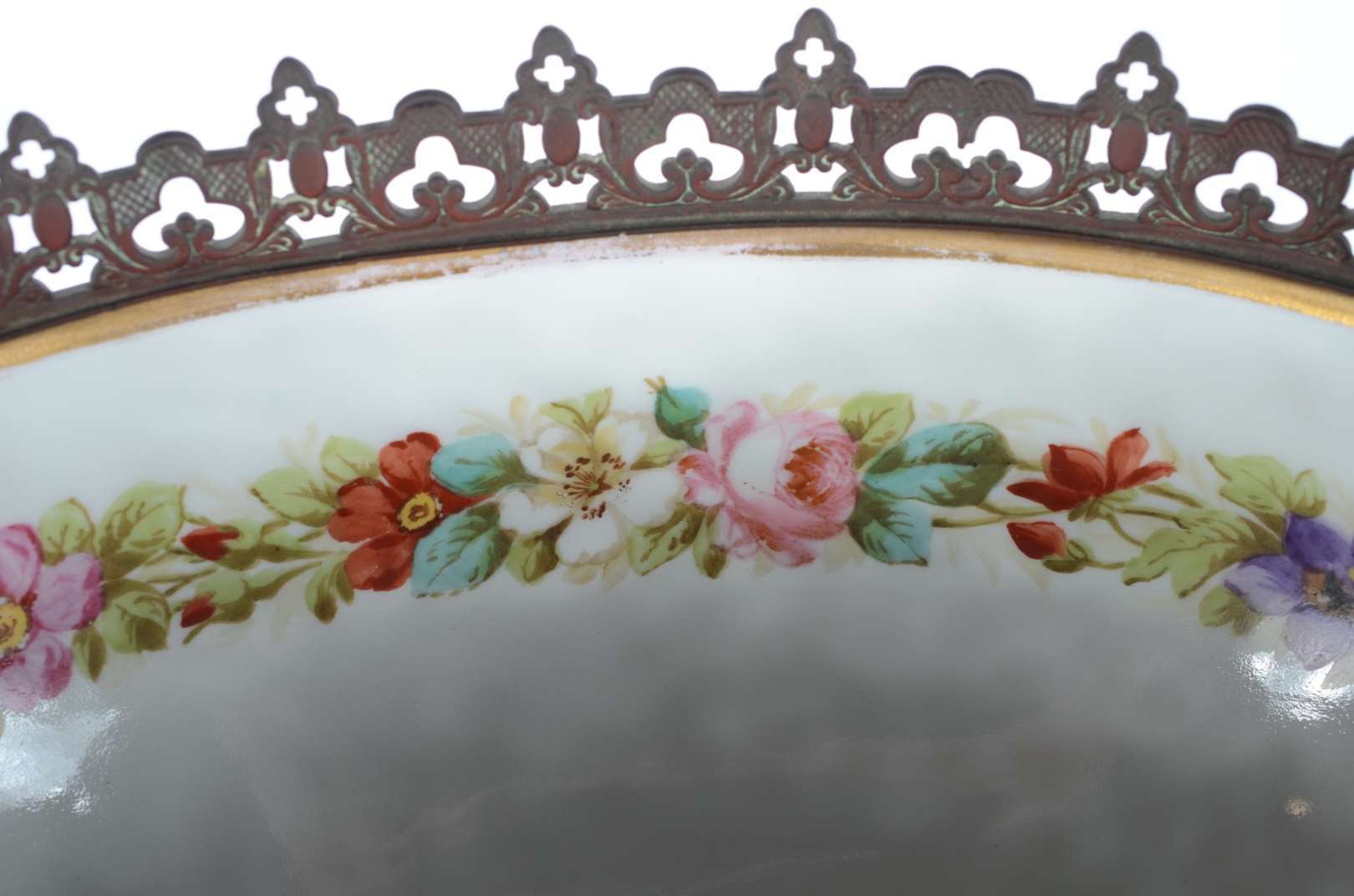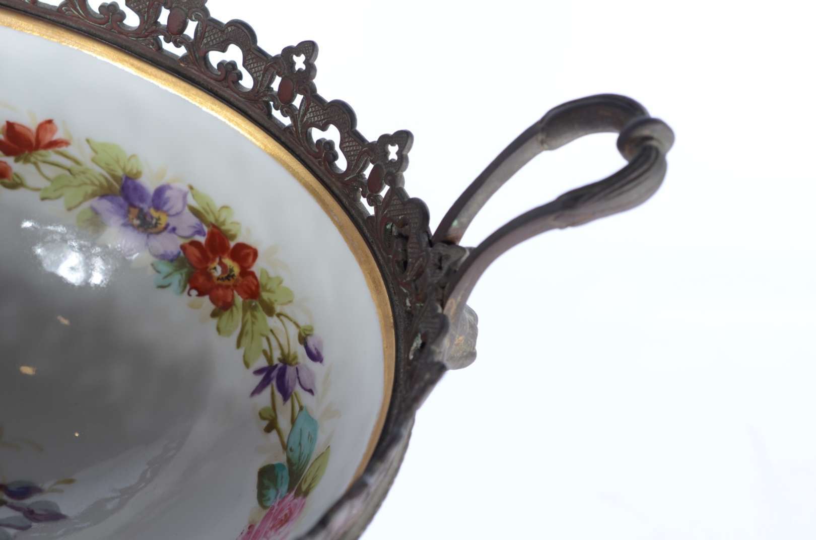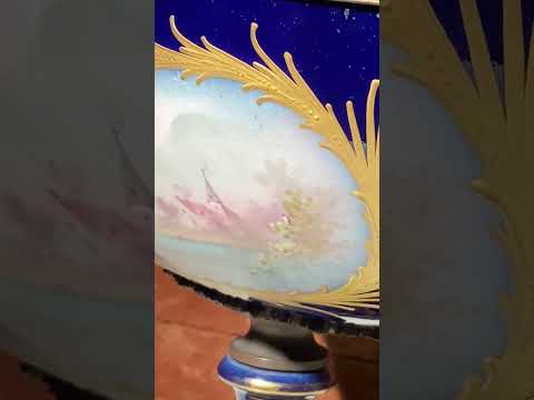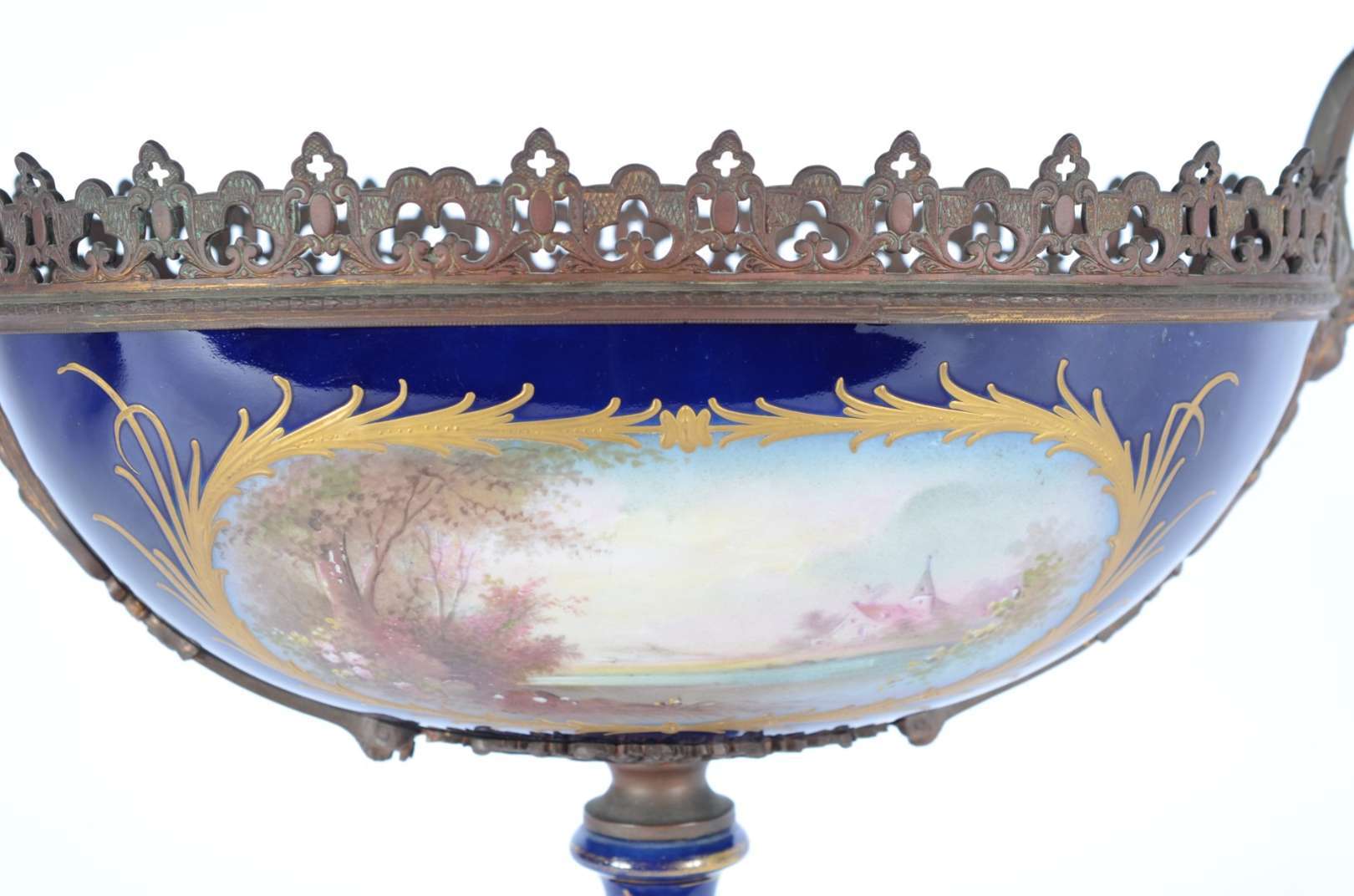 Elegante fruteira de porcelana francesa azul cobalto com cena romântica e paisagem em policromia, realces dourados, parte interna com flores, guarnição de metal dourado.