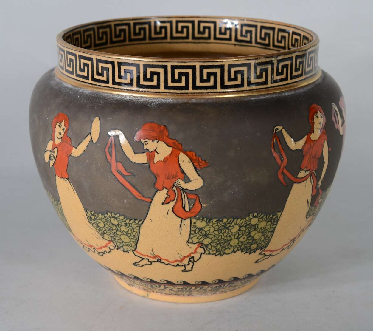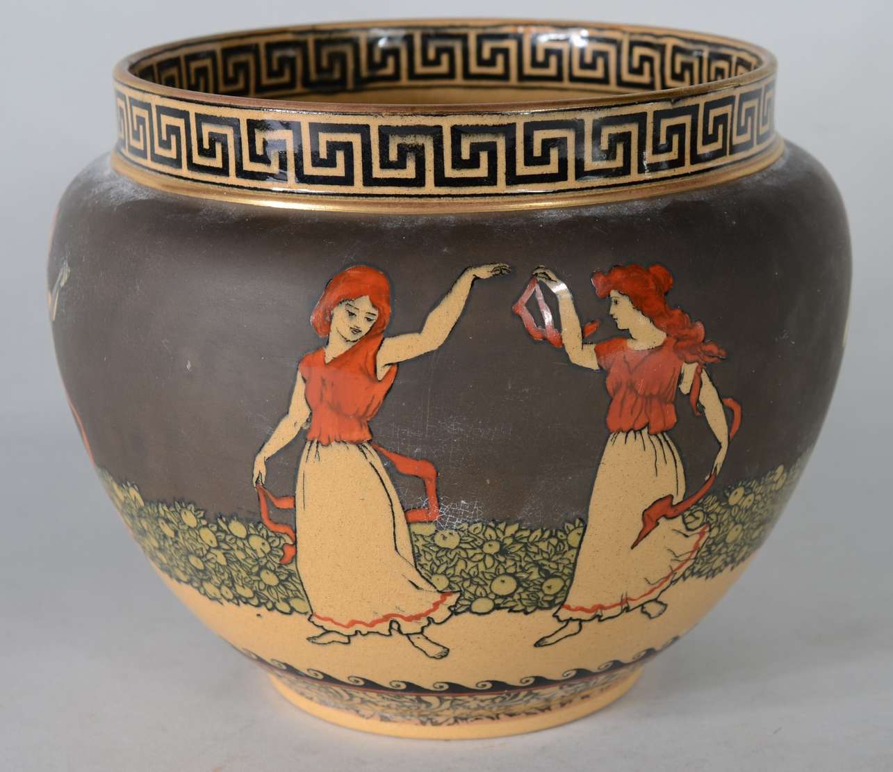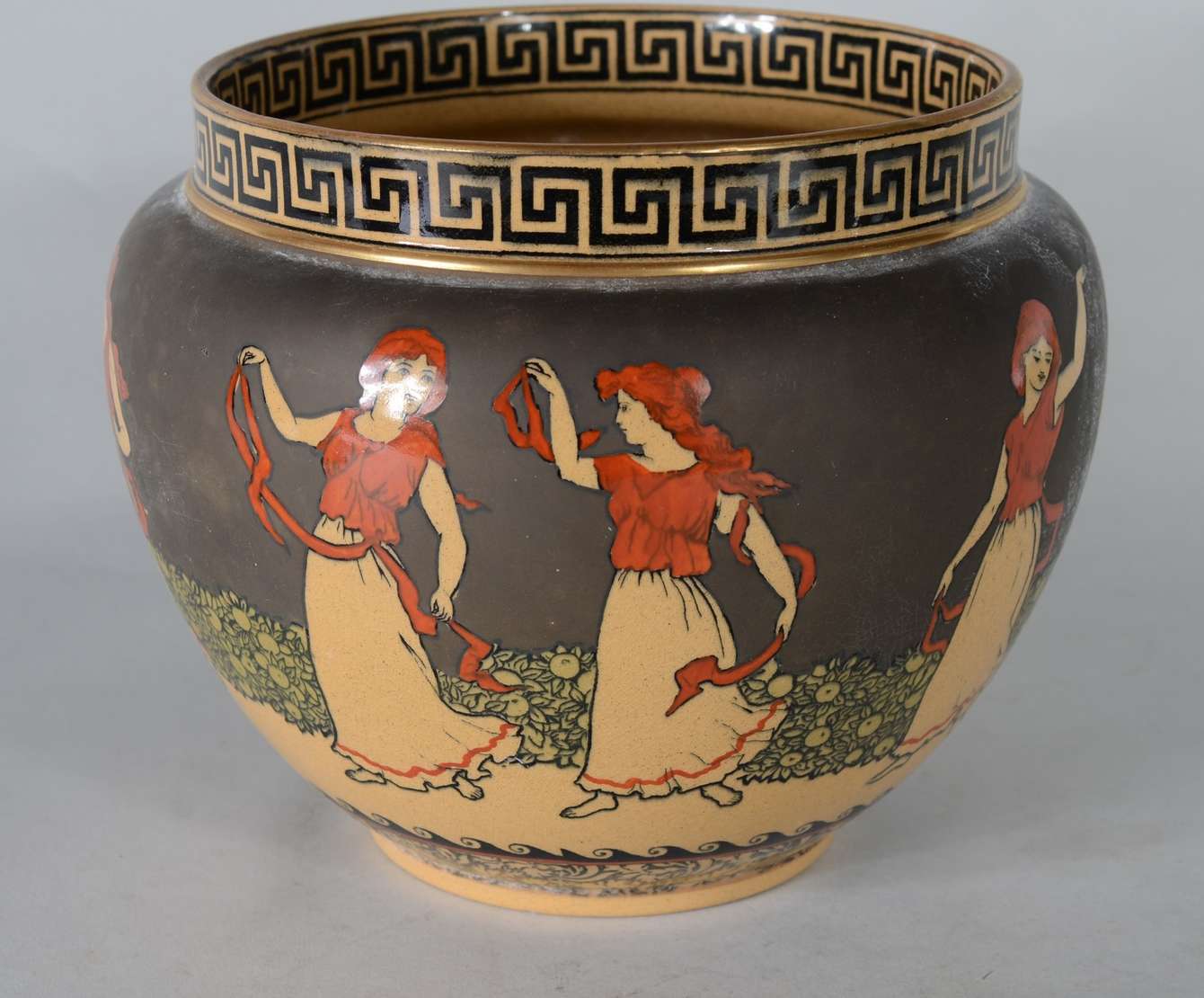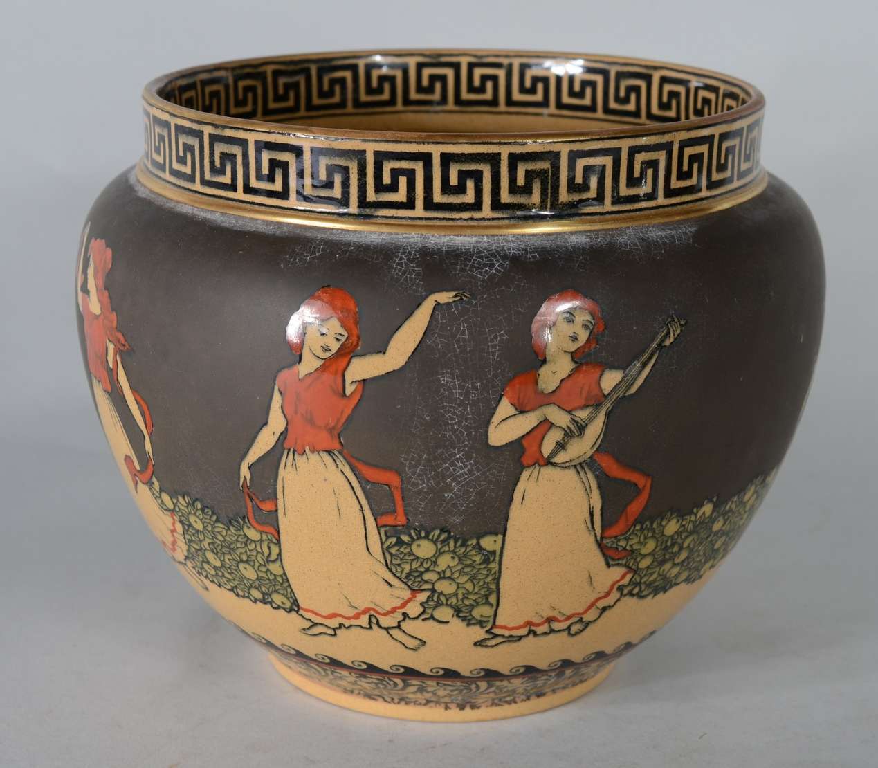 Cachepot de faiança inglesa Royal Doulton "Morrisian", decorado com figuras femininas com instrumentos musicais. Borda com "fita grega". Circa 1904. Pequenos desgastes.