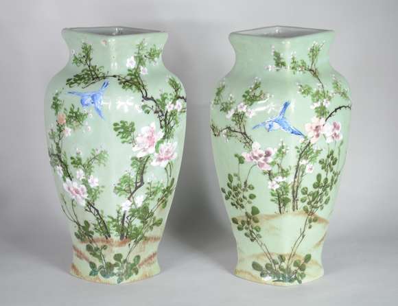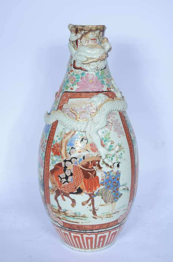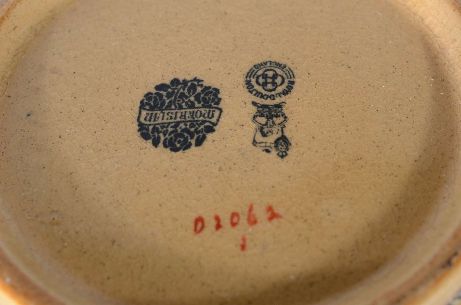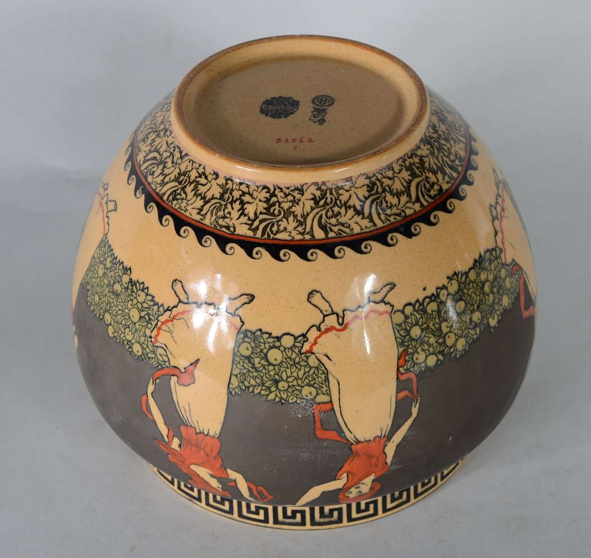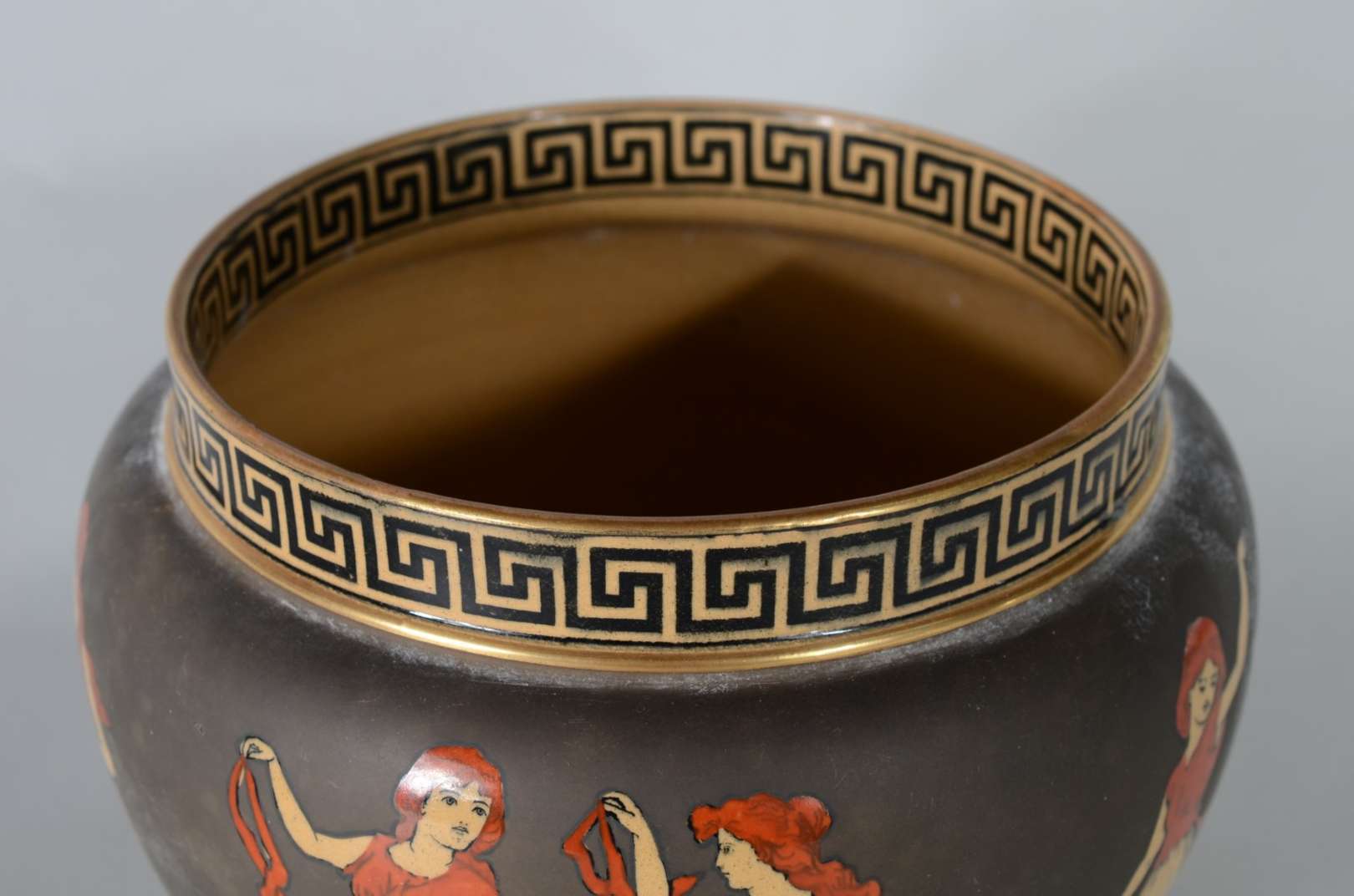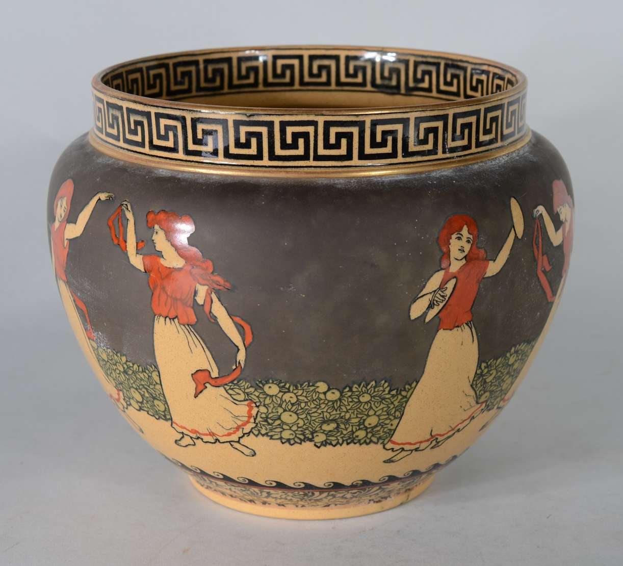 Cachepot de faiança inglesa Royal Doulton "Morrisian", decorado com figuras femininas com instrumentos musicais. Borda com "fita grega". Circa 1904. Pequenos desgastes.