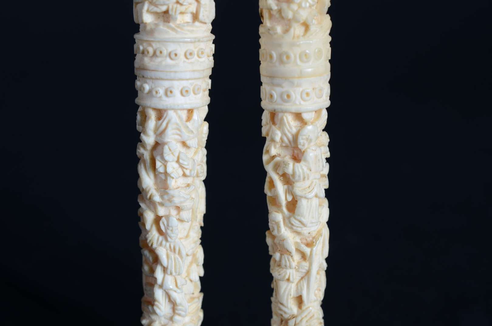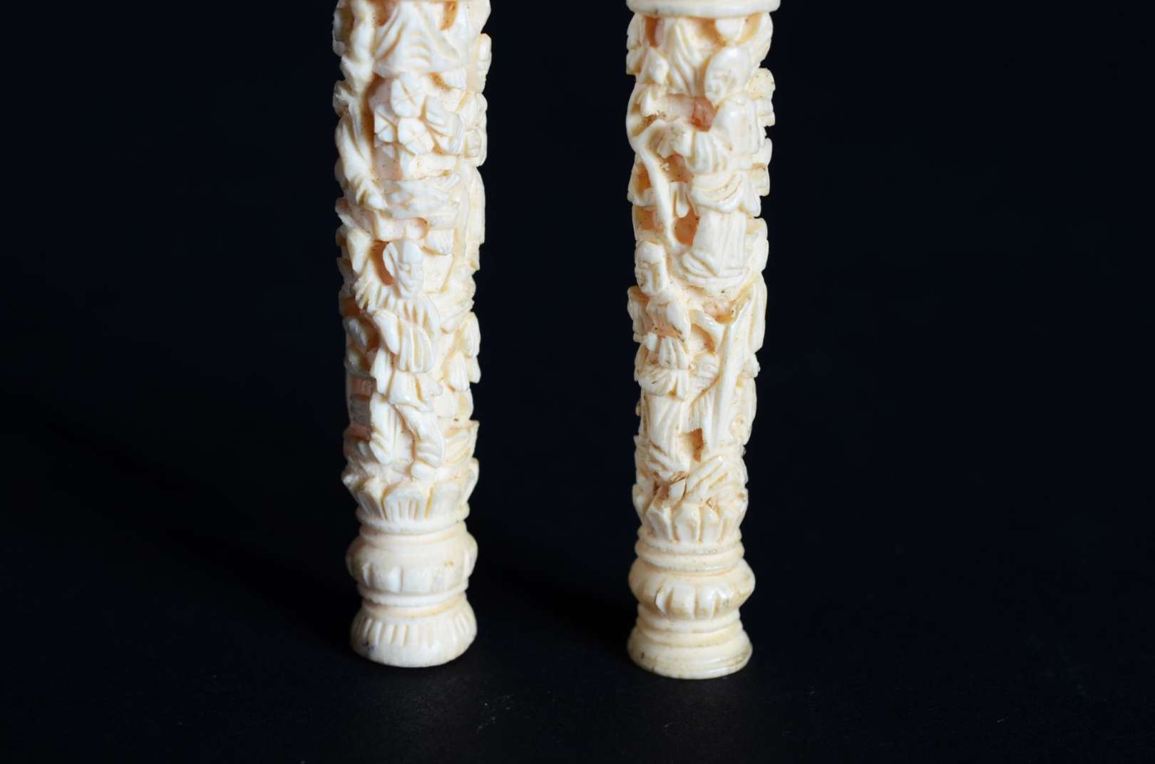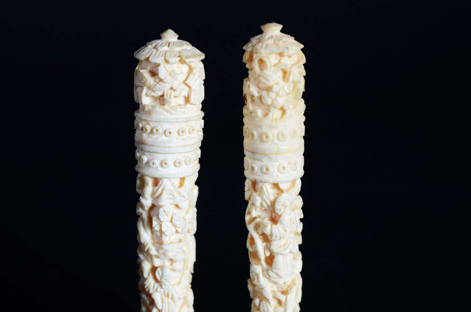 Dois porta termômetros de marfim esculpido.